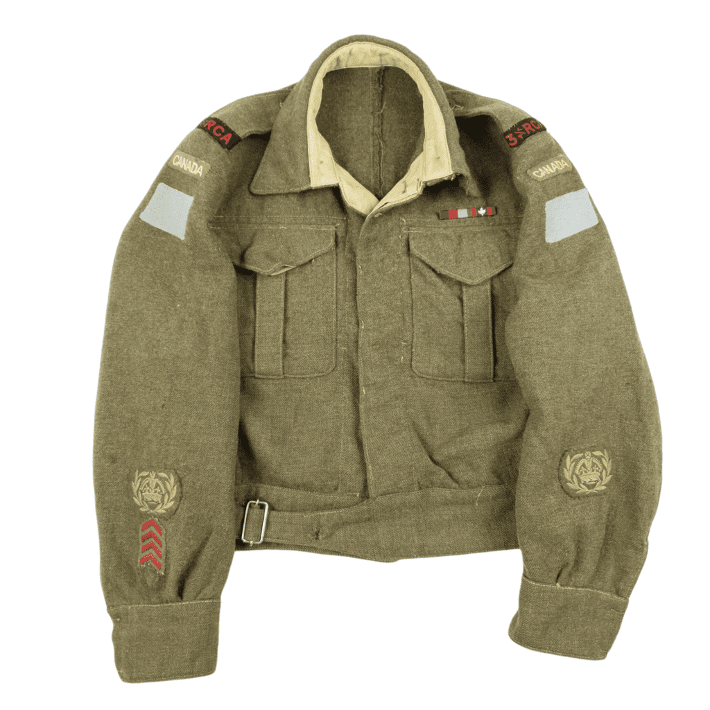 Original WW2 3rd Anti Tank – Royal Canadian Artillery, 3rd Canadian Infantry Division battle dress tunic. This jacket appears to be worn by Warrant Officer Cecil A. Wilson, his name is not written inside the uniform (just came with the uniform written on a piece cardboard). Features original period applied insignia consisting of embroidered 3 AT RCA shoulder titles, and embroidered CANADA titles with division patches. Warrant Officer Class II patches on both lower sleeves and the service years chevron. The tunic is in used condition, a damage on the back of the collar and shows clear traces of usage, great looking combat worn jacket! On button is missing. The tunic is a standard Canadian made example, maker markings are not readable unfortunately.