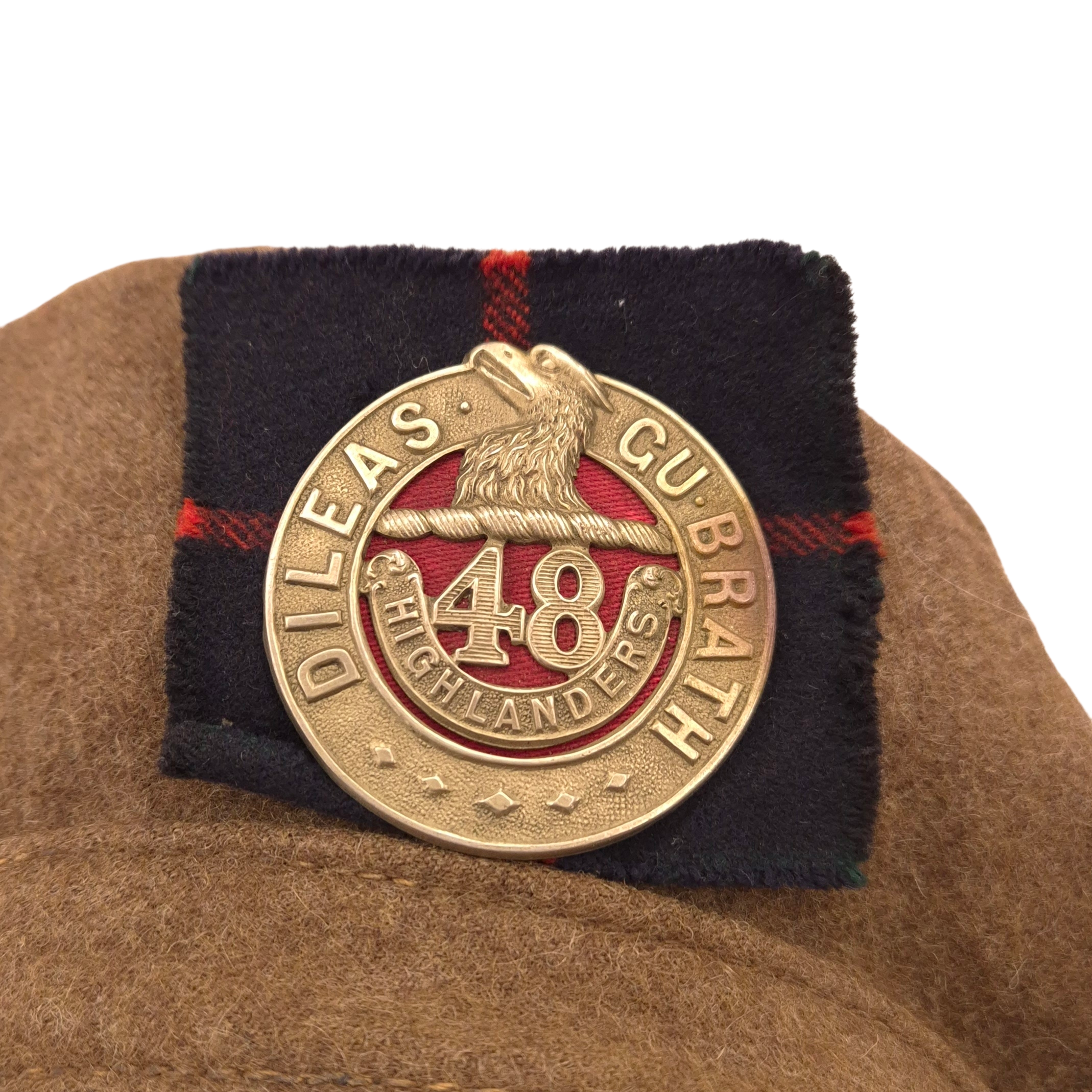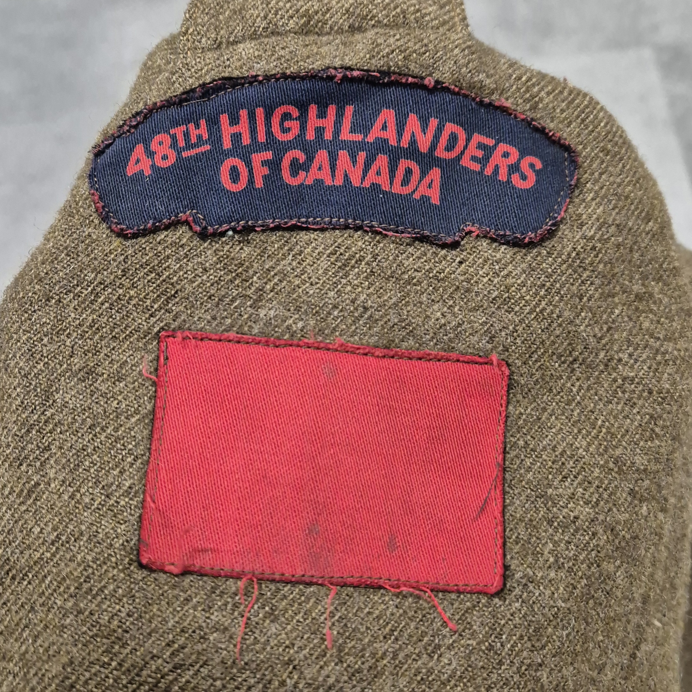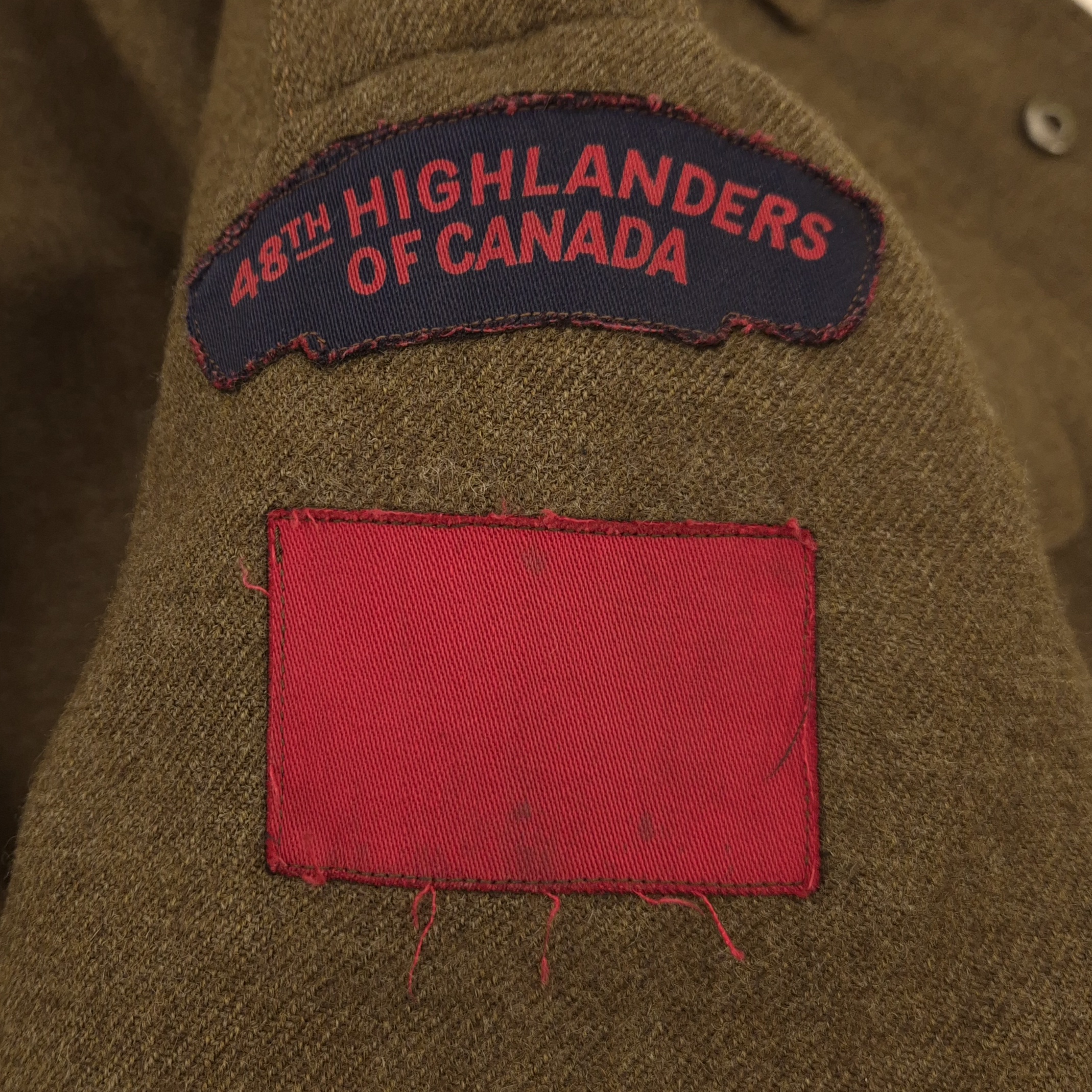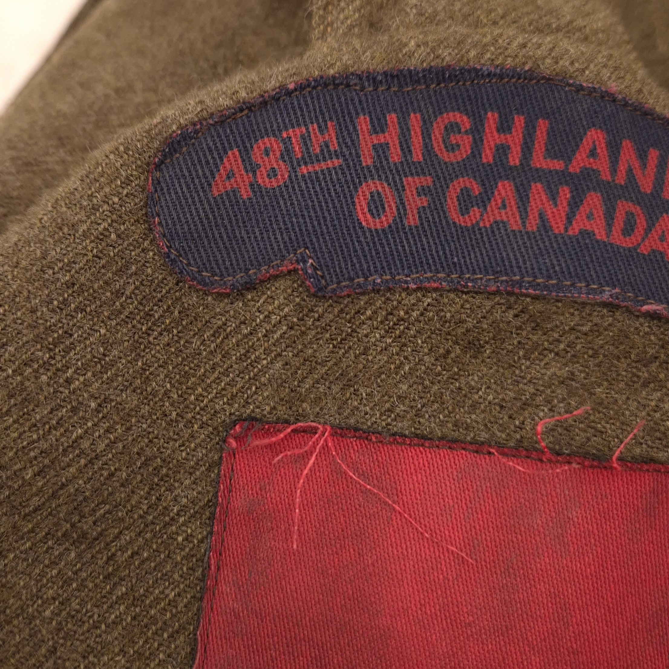 Original WWII 48th Highlanders of Canada Battle Dress jacket and Tam O’ Shanter. An original, period-badged example featuring printed “48th Highlanders of Canada” shoulder titles and printed 1st Canadian Infantry Division formation patches. The battle dress jacket remains in good overall used condition. It is maker-marked and dated 1943, size 9. The Tam O’Shanter is a particularly fine example, British-made, with faded markings. still visible are the following markings; Size 7 1/8, and a WD stamp with the letter M indicating 1944. The cap badge is original to the tam. A notable detail is the printed red patch, cut from a divisional patch, placed behind the cap badge. The tam also retains the correct red toorie for the 48th Highlanders of Canada. The jacket and tam were found together and are therefore offered as a matched set. For detail-oriented collectors, a nice detail; the shoulder titles are different, which is commonly encountered on wartime-used jackets. One example shows a coarser weave. I also took photos of the insignia without artificial light.