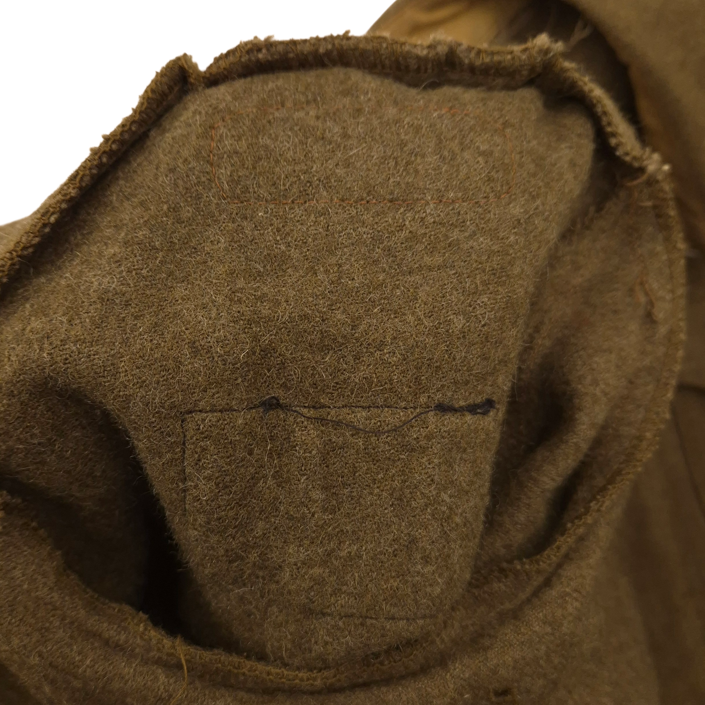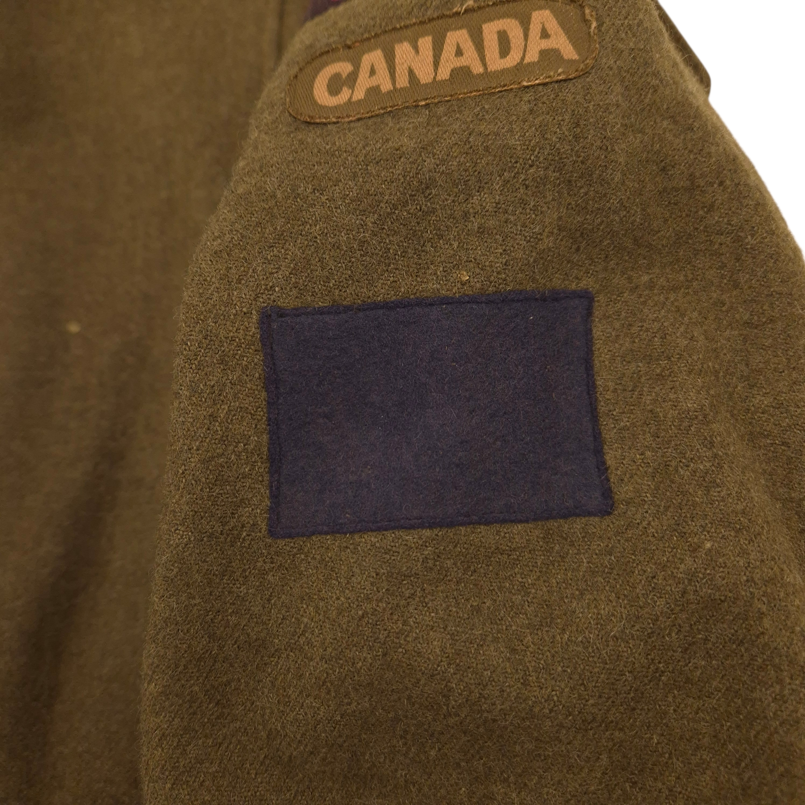 Original WWII 5th Field Regiment – Royal Canadian Artillery (5 RCA) Battle Dress jacket. This is an original, period-badged example with printed “5 RCA” shoulder titles, printed CANADA titles, and melton 2nd Canadian Infantry Division formation patches that are nicely sunken into the fabric. The battle dress jacket remains in worn condition, with some small damages. It is maker-marked and dated August 1943, size 4. The jacket also has wound-badge, indicating that the wearer, a Gunner, was wounded in action during the war.