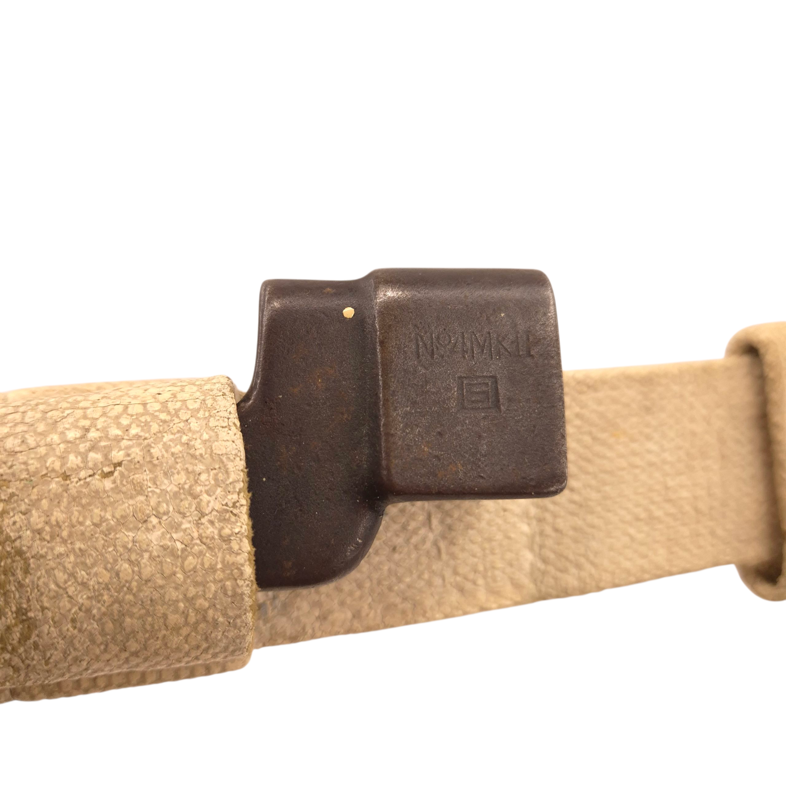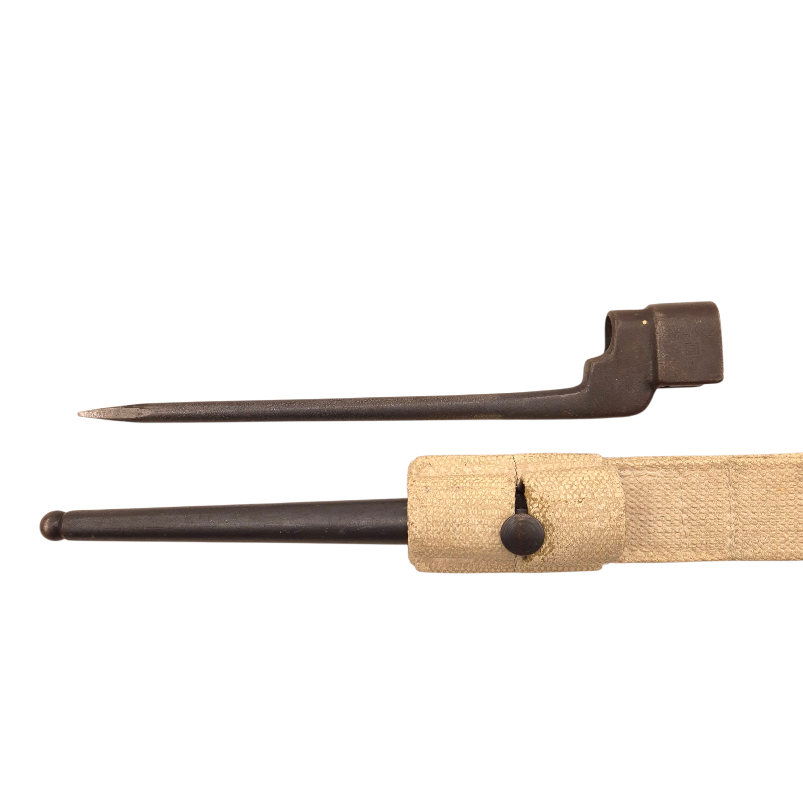 Original WWII British/Canadian bayonet with white web frog, indented for Military Police / Canadian Provost Corps. Very good condition.
