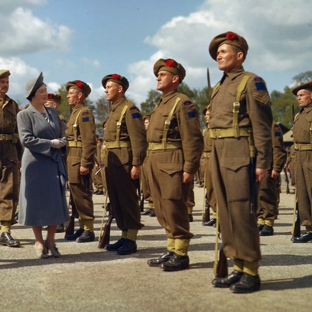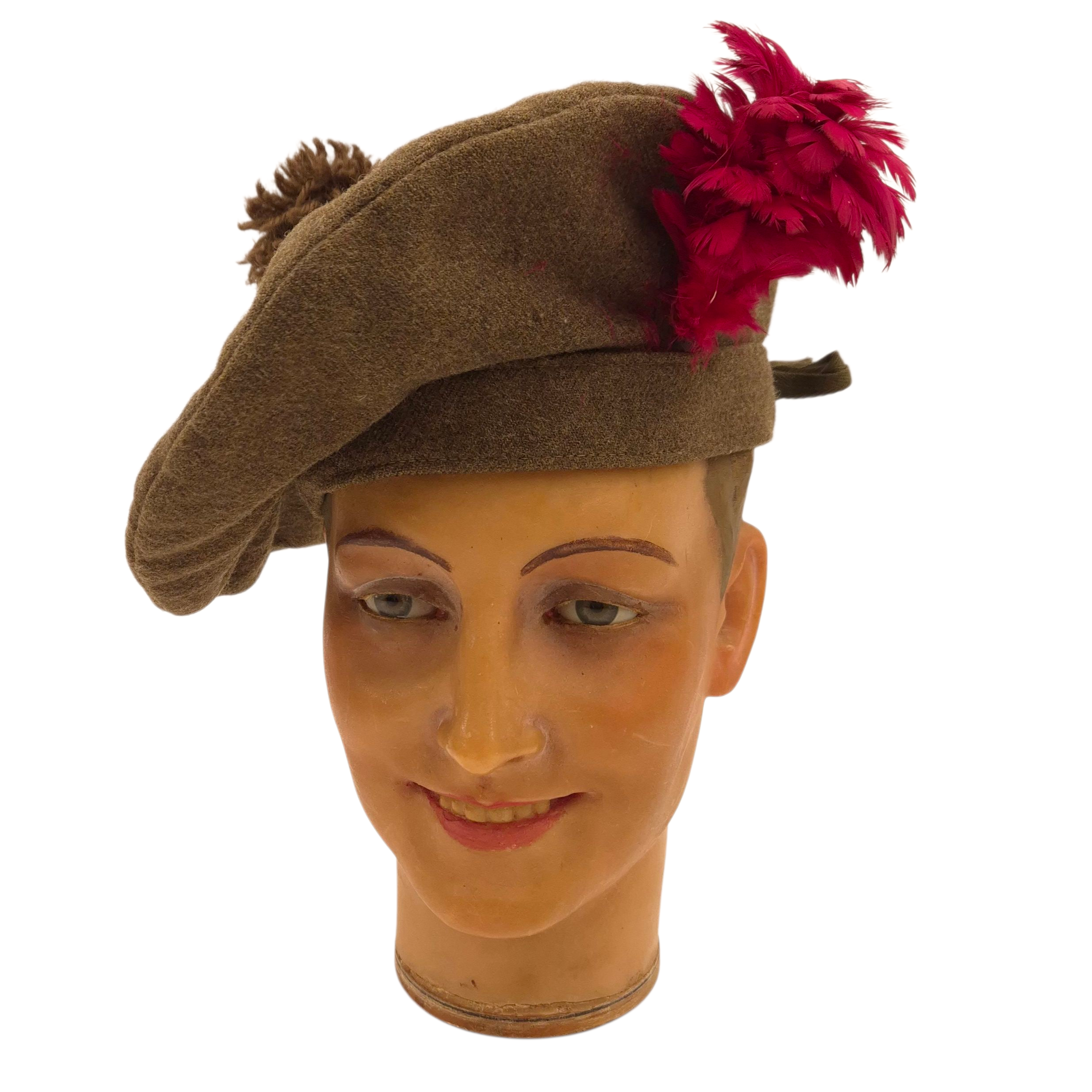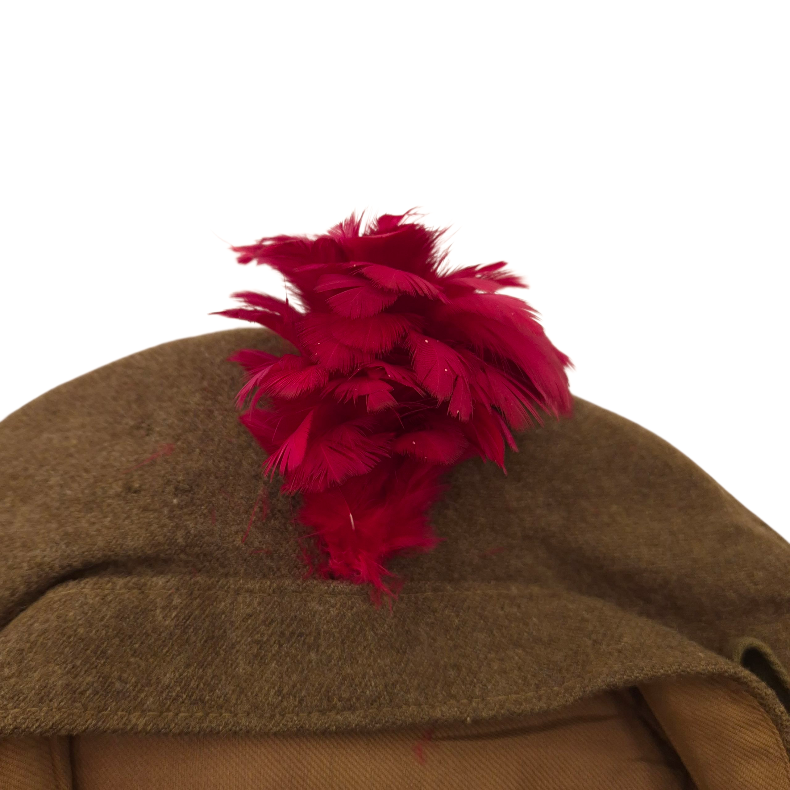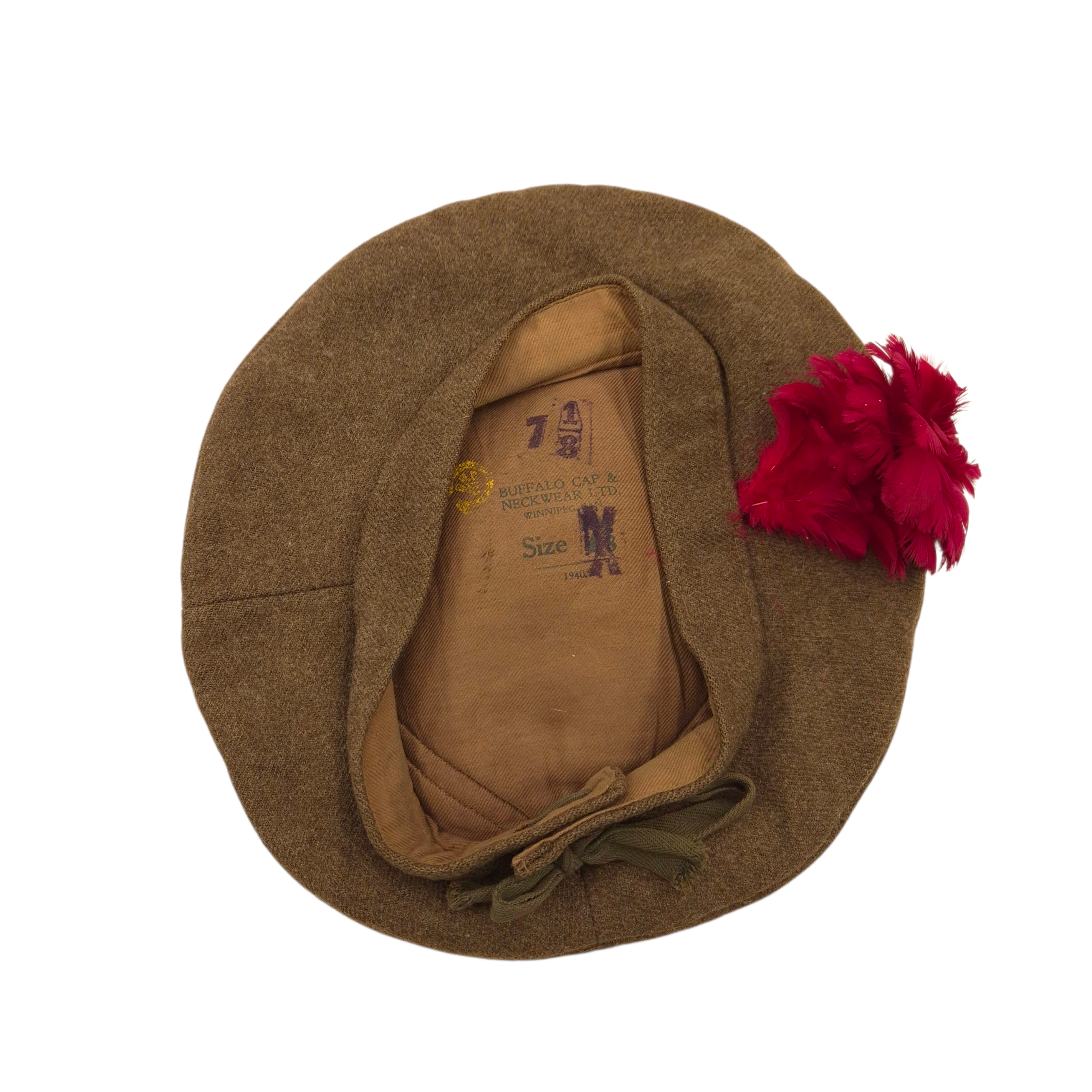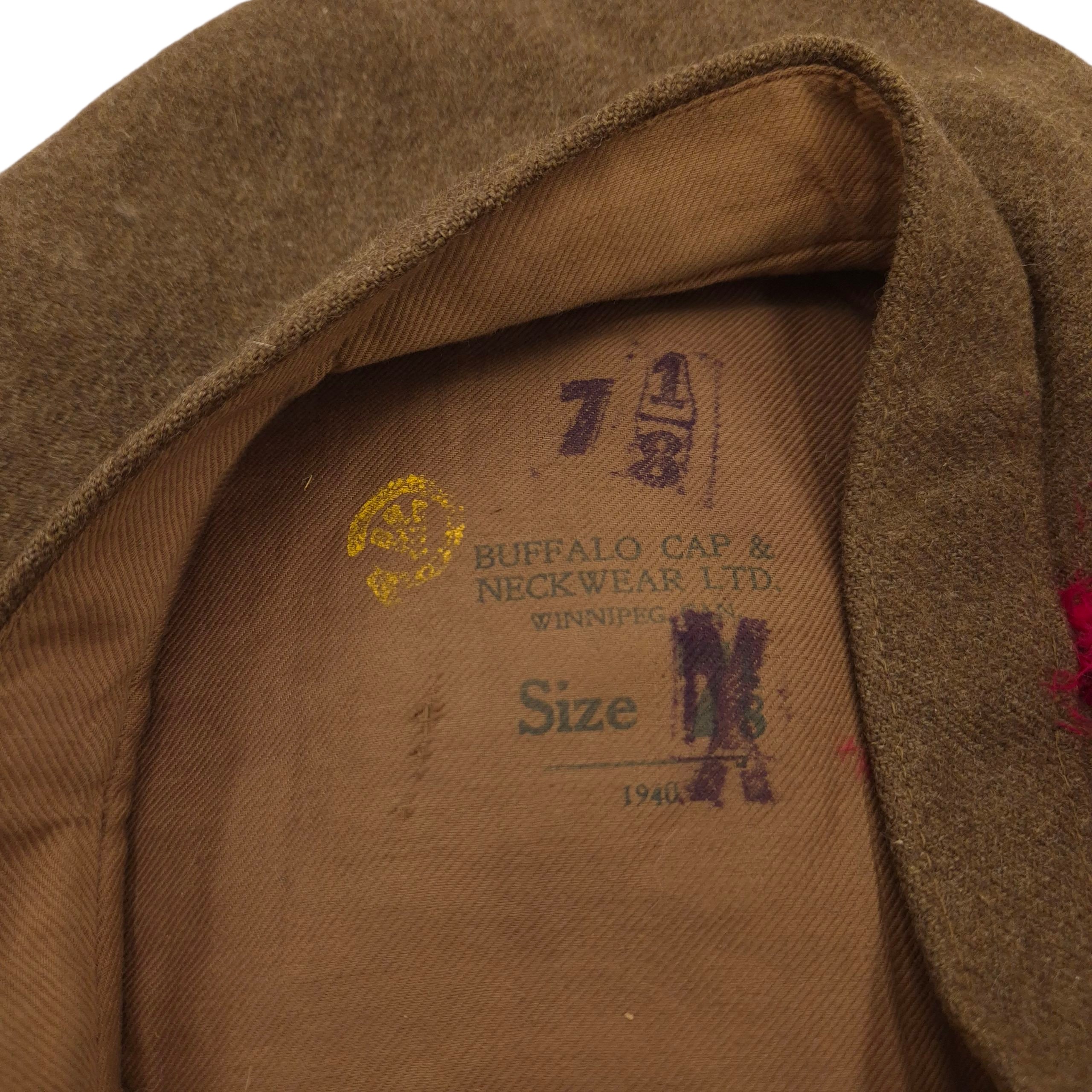 Original WWII Canadian Tam O’ Shanter cap with Black Watch (Royal Highland Regiment) of Canada hackle (plume). The Tam O’ Shanter was worn by Canadian regiments with Scottish heritage. This example features a rear drawstring fastened in a bow, and a woolen toorie (pom-pom) on the crown, a traditional Scottish detail. The interior is maker-marked “Buffalo Cap & Neckwear Ltd., Winnipeg”, dated 1940, and sized 7 1/8. It also bears the Canadian C broad arrow stamp.