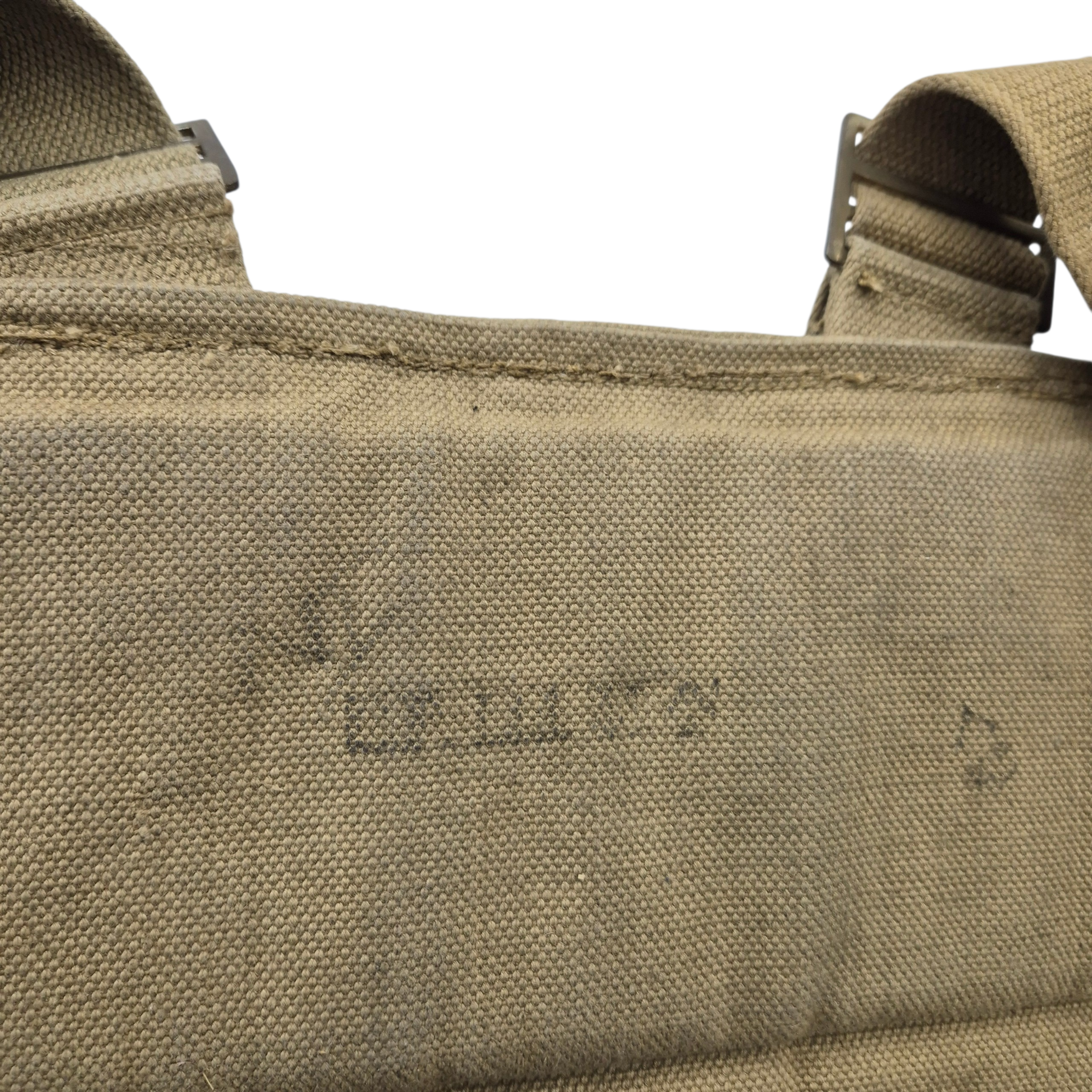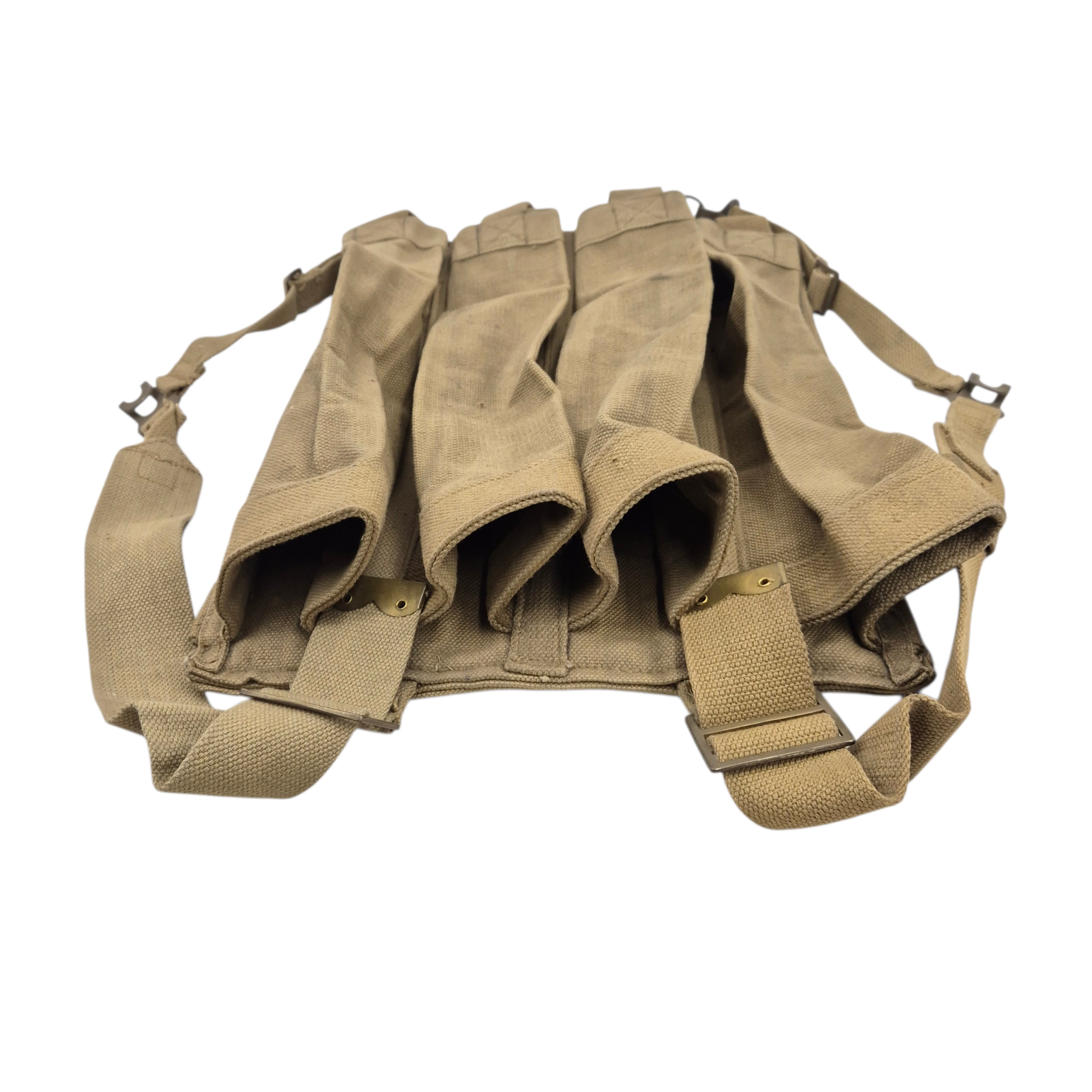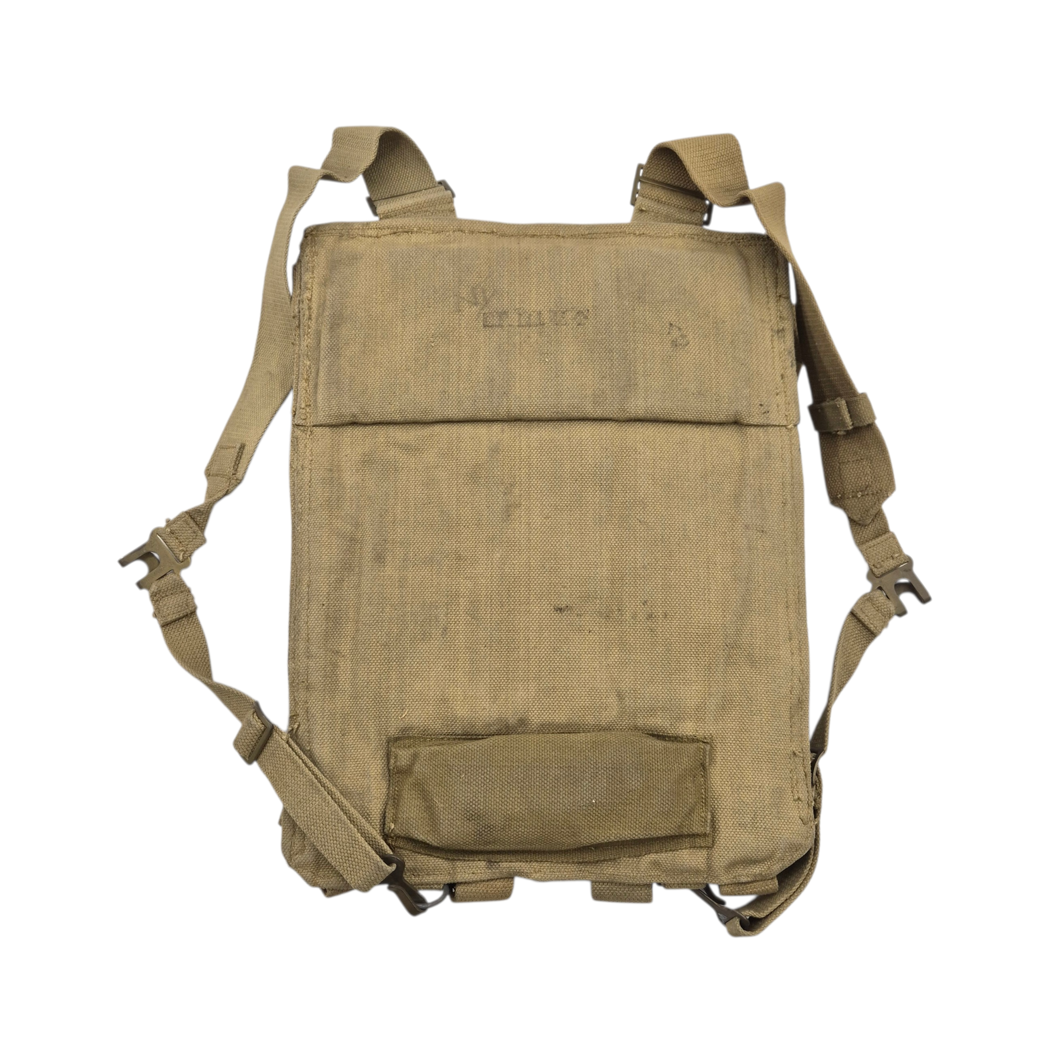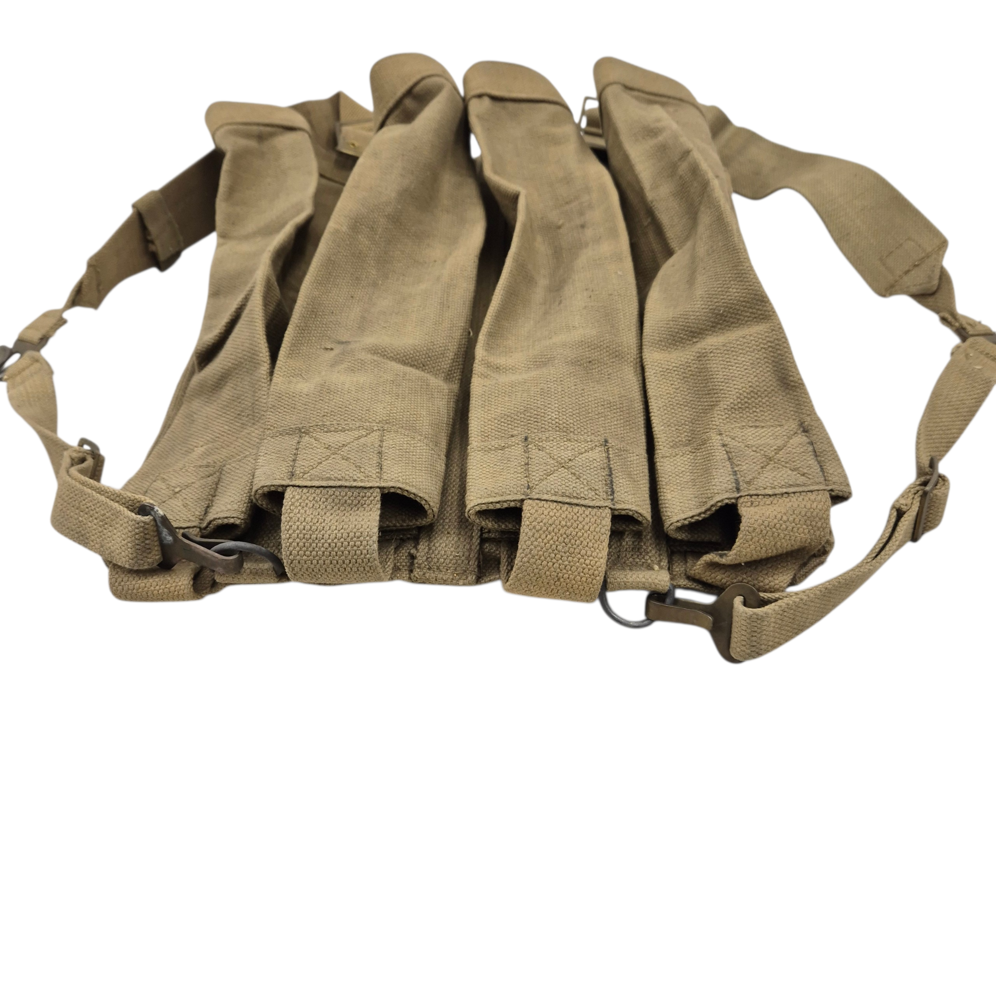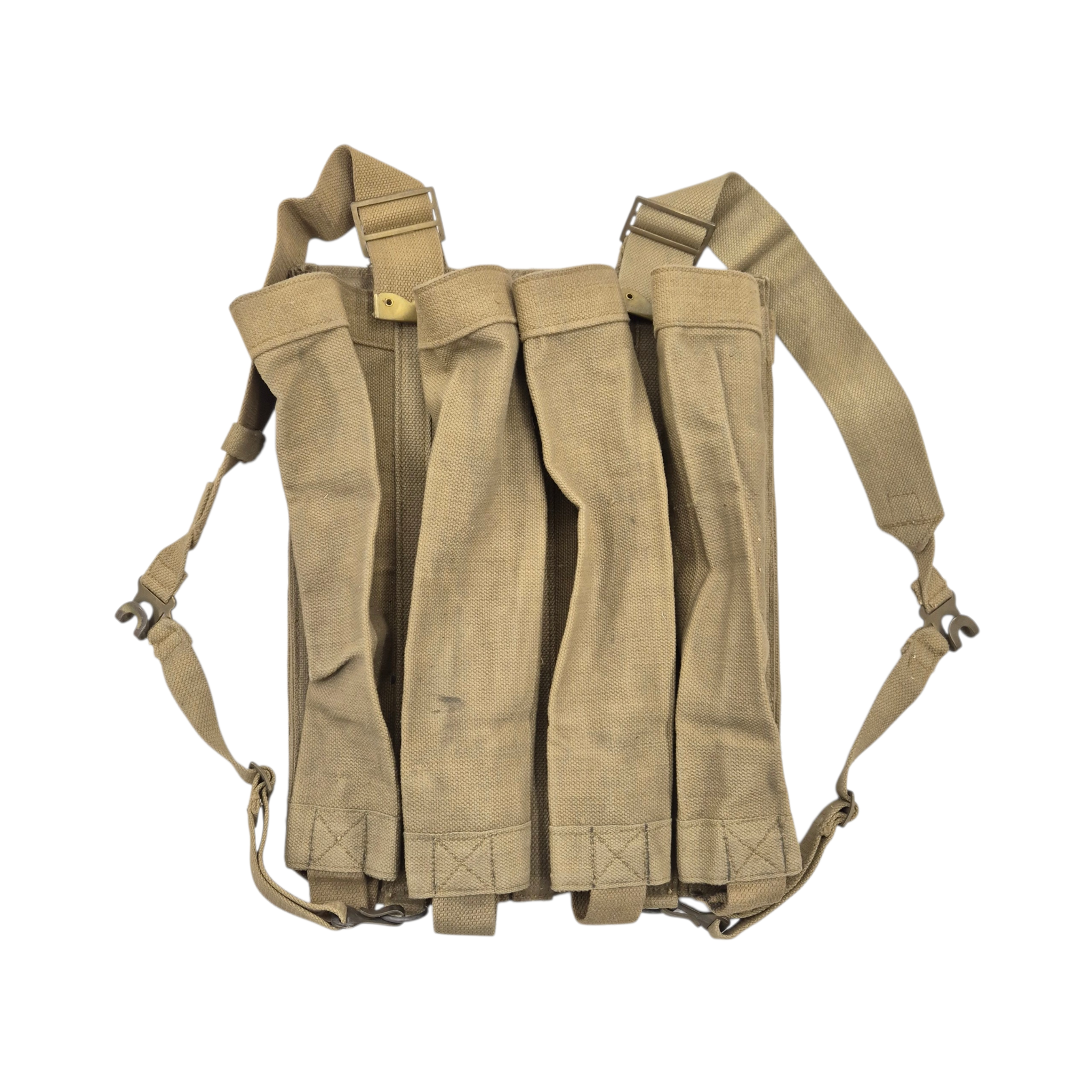Original WWII British 3″ Mortar-Bomb webbing backpack, hard to find item. Designed for man-portable transport of 3 inch mortar bombs, particularly during “long carry” operations when vehicles were unavailable or for discreet forward movement. Also used by airborne troops when mortars were deployed separately. The pack features four top opening pockets with reinforced bases, padded sections for shoulder and lower back support, and adjustable shoulder straps with brass hooks and D-rings. The stamp is faint and difficult to read, but appears to show “1943” followed by a broad arrow. These packs are known to date from the early to mid-war period.