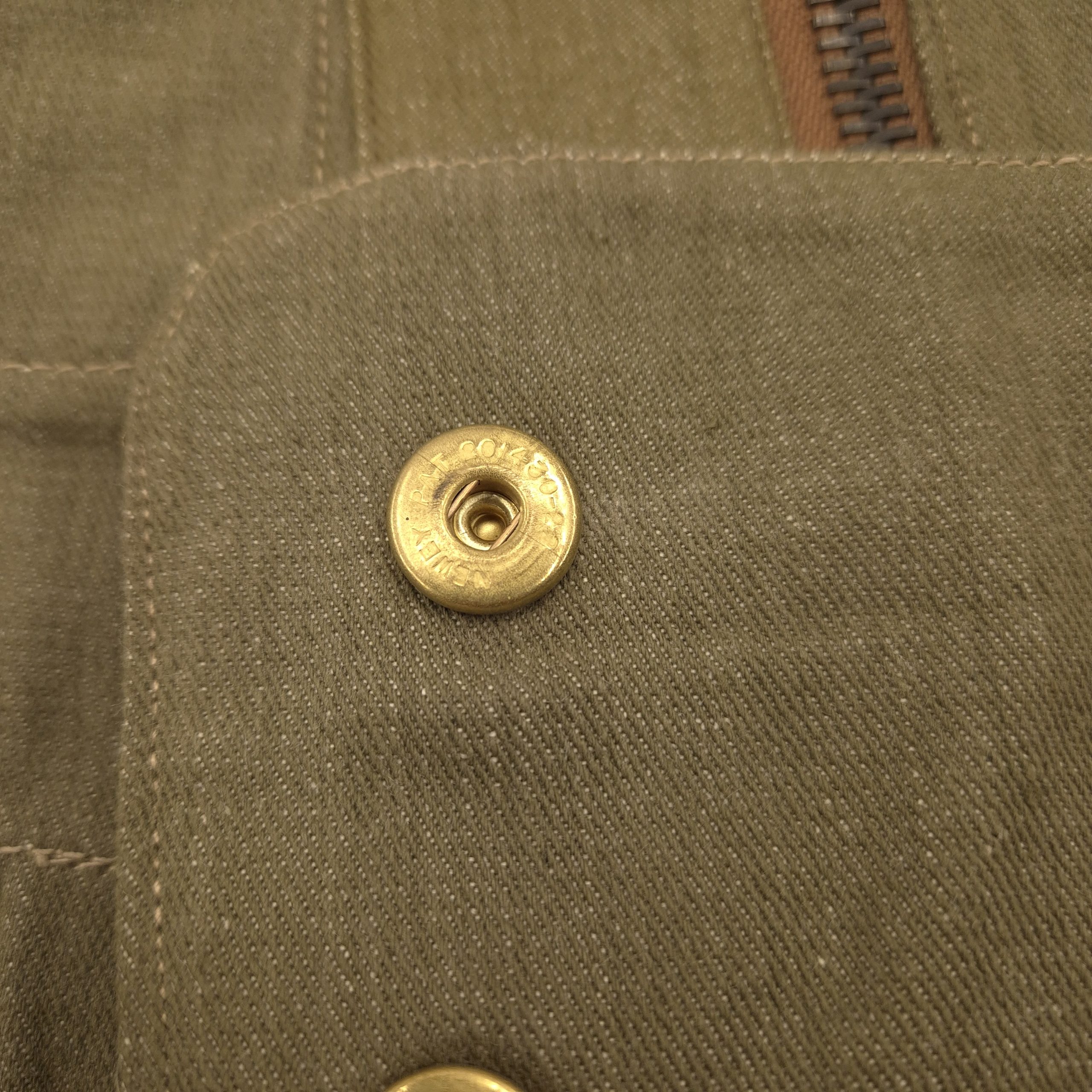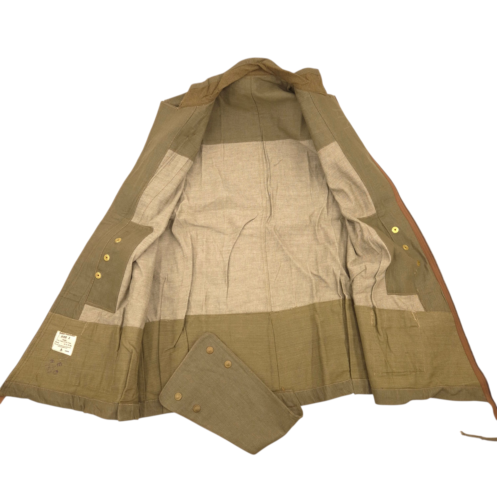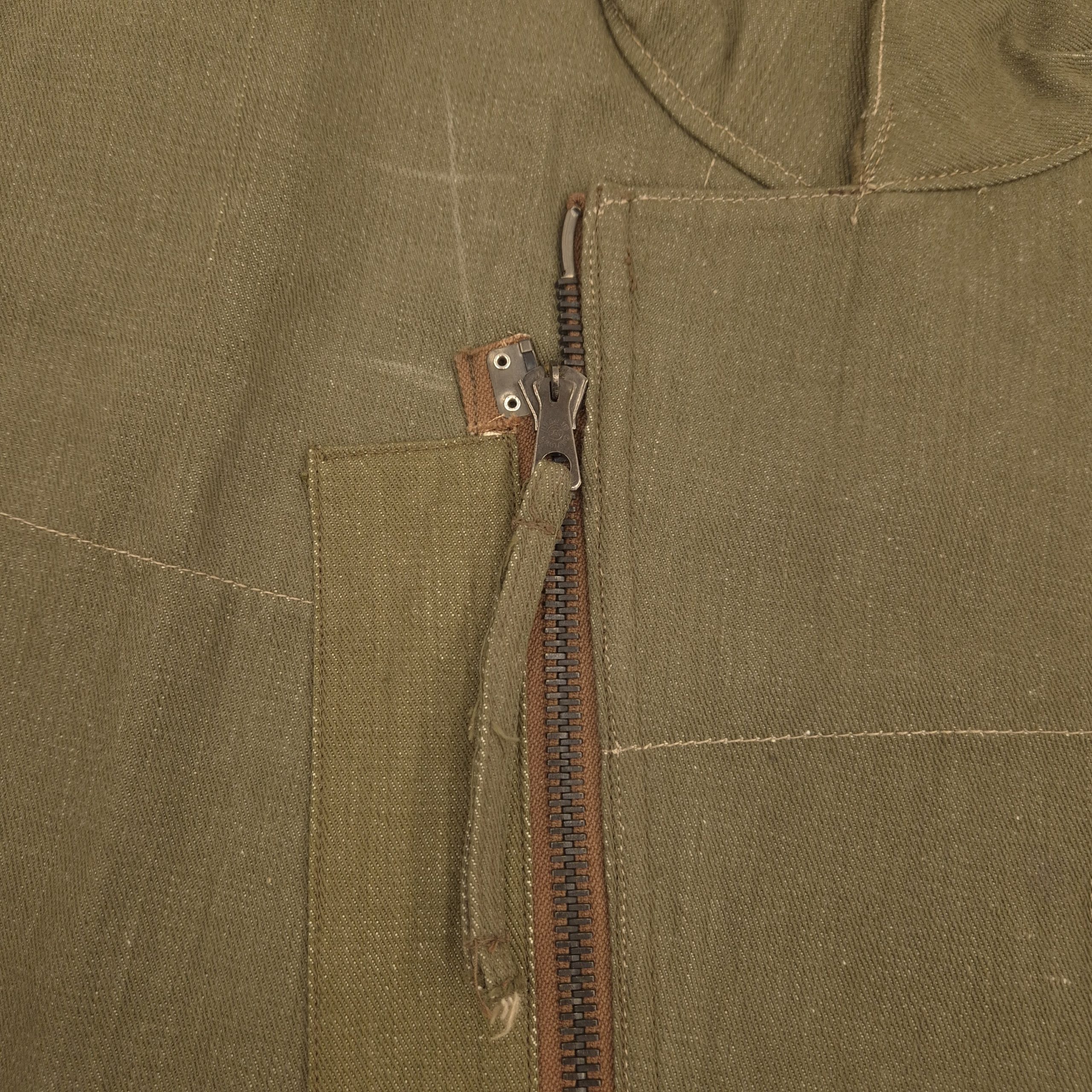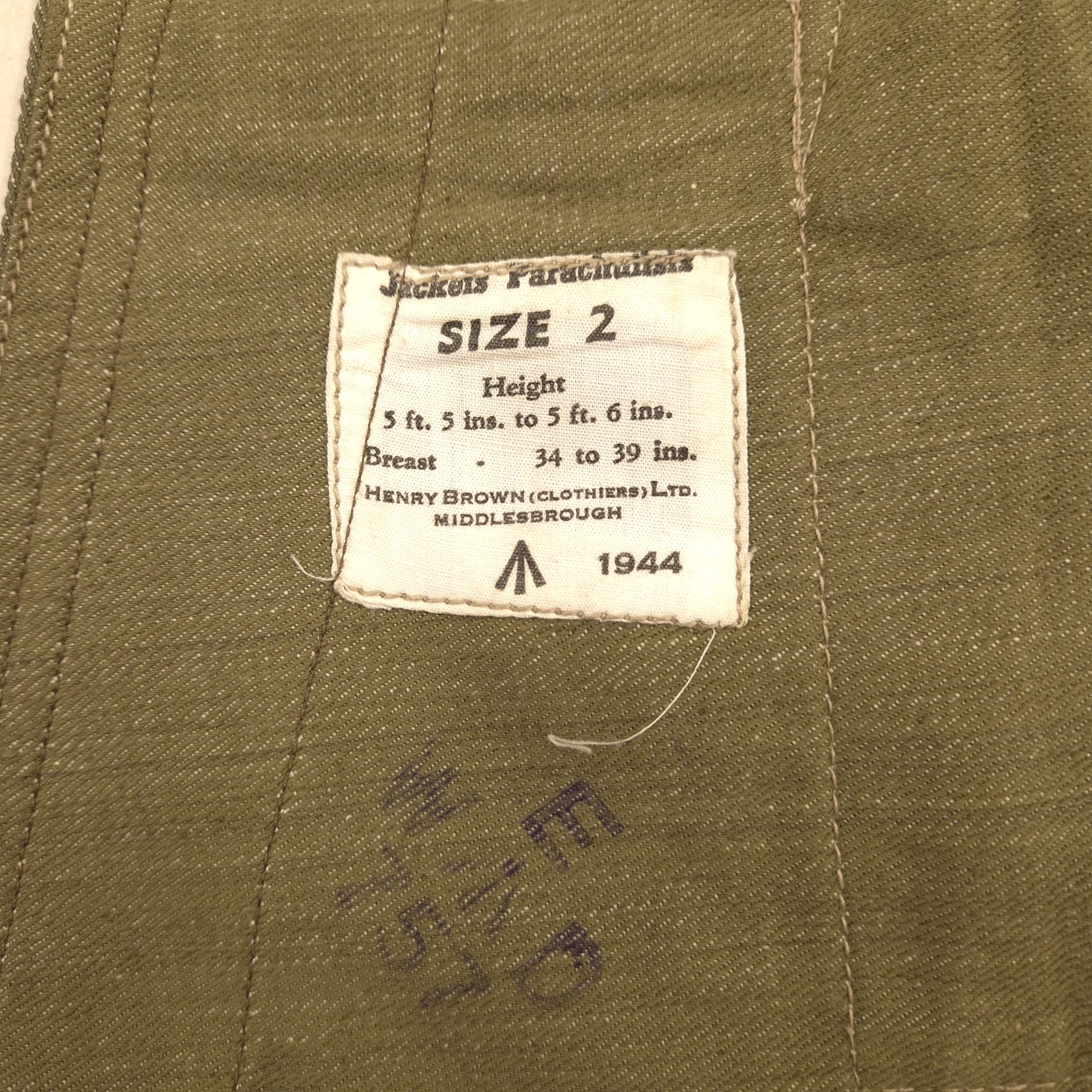 Original WWII British Airborne Oversmock (Parachutists Jacket), dated 1944. This is a 1944-dated example of the sleeveless green denim oversmock, also known as the Parachutists Jacket. It was worn over the Dension smock and full jump equipment. The garment features a working full-length zipper and two elasticated front “grenade” pockets. The original label remains intact, marked “Jackets Parachutists, Size No. 2,” with size details, and 1944 date, broad arrow acceptance mark “E” which is postwar. It was manufactured by the well-known firm Henry Brown Ltd. The brass Newey press-studded tail flap is intact. The piece is in very good overall condition.