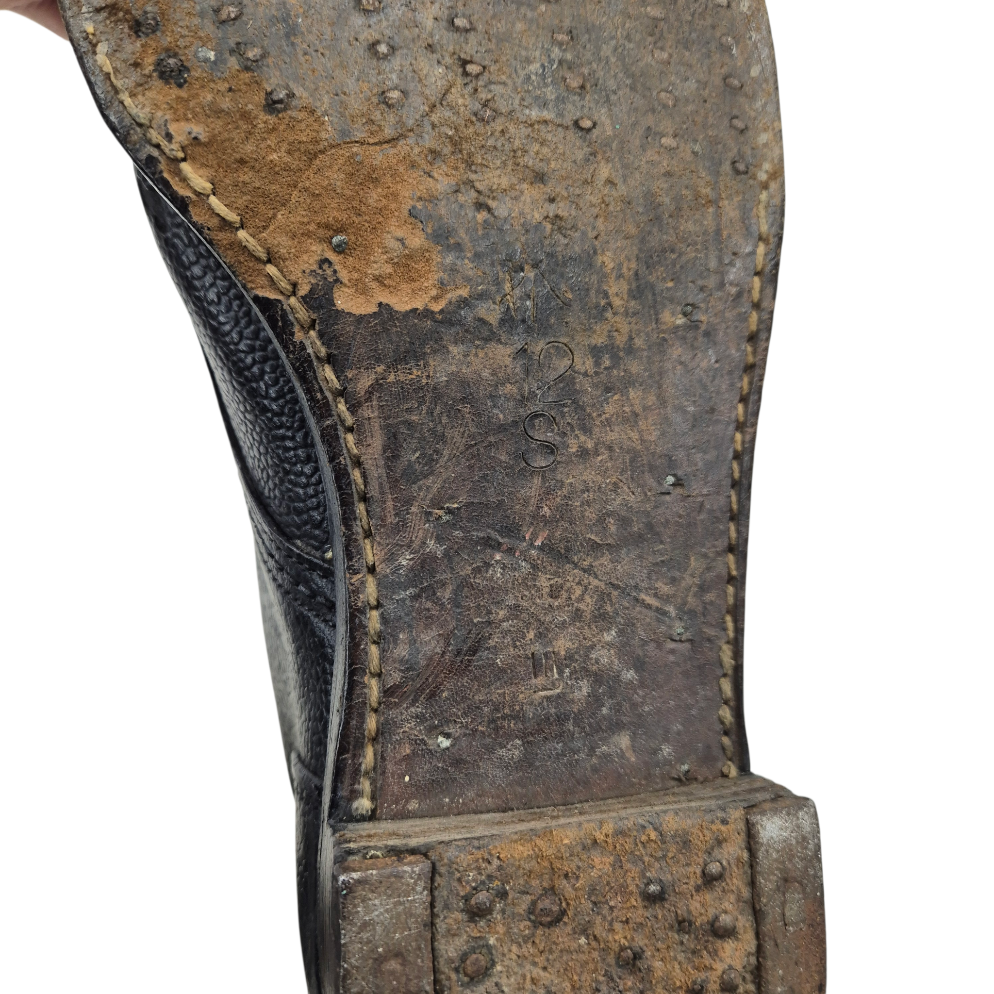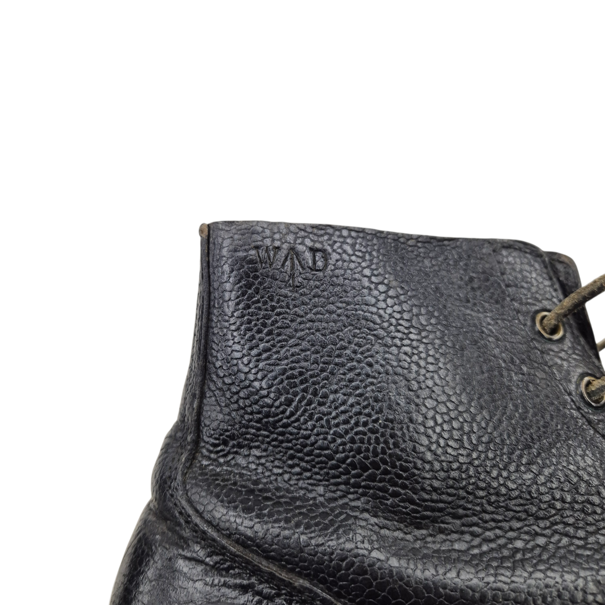 Original WWII British Army Ammo Boots. The boots are in good condition, showing normal signs of wear consistent with age and use. One side of the leather shows minor damage (see last photo). The boots are maker marked: Church & Co, early wartime dated 1940, in large size 12 S (small). The boots come complete with their original leather laces and retain their original soles. Boots are WD stamped.