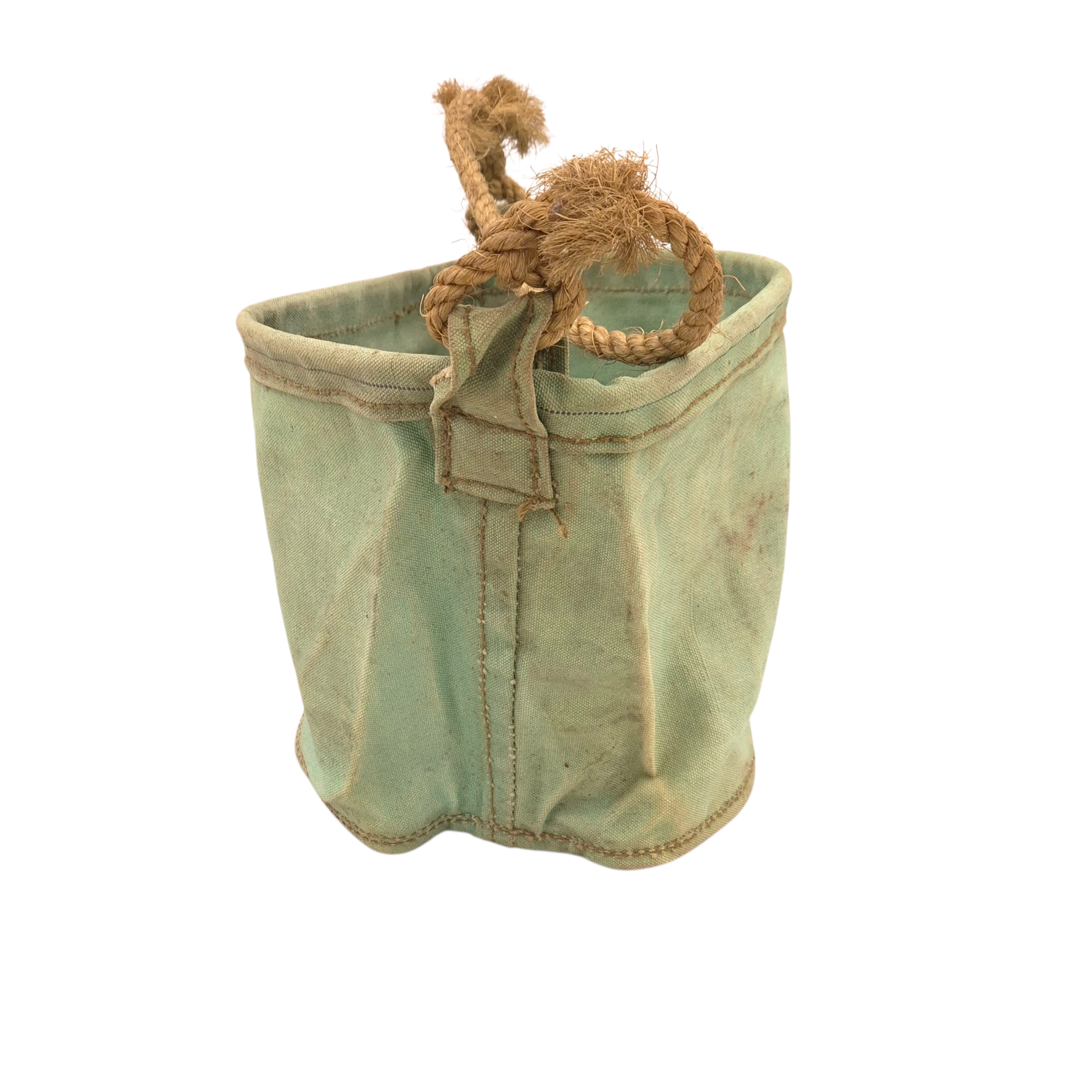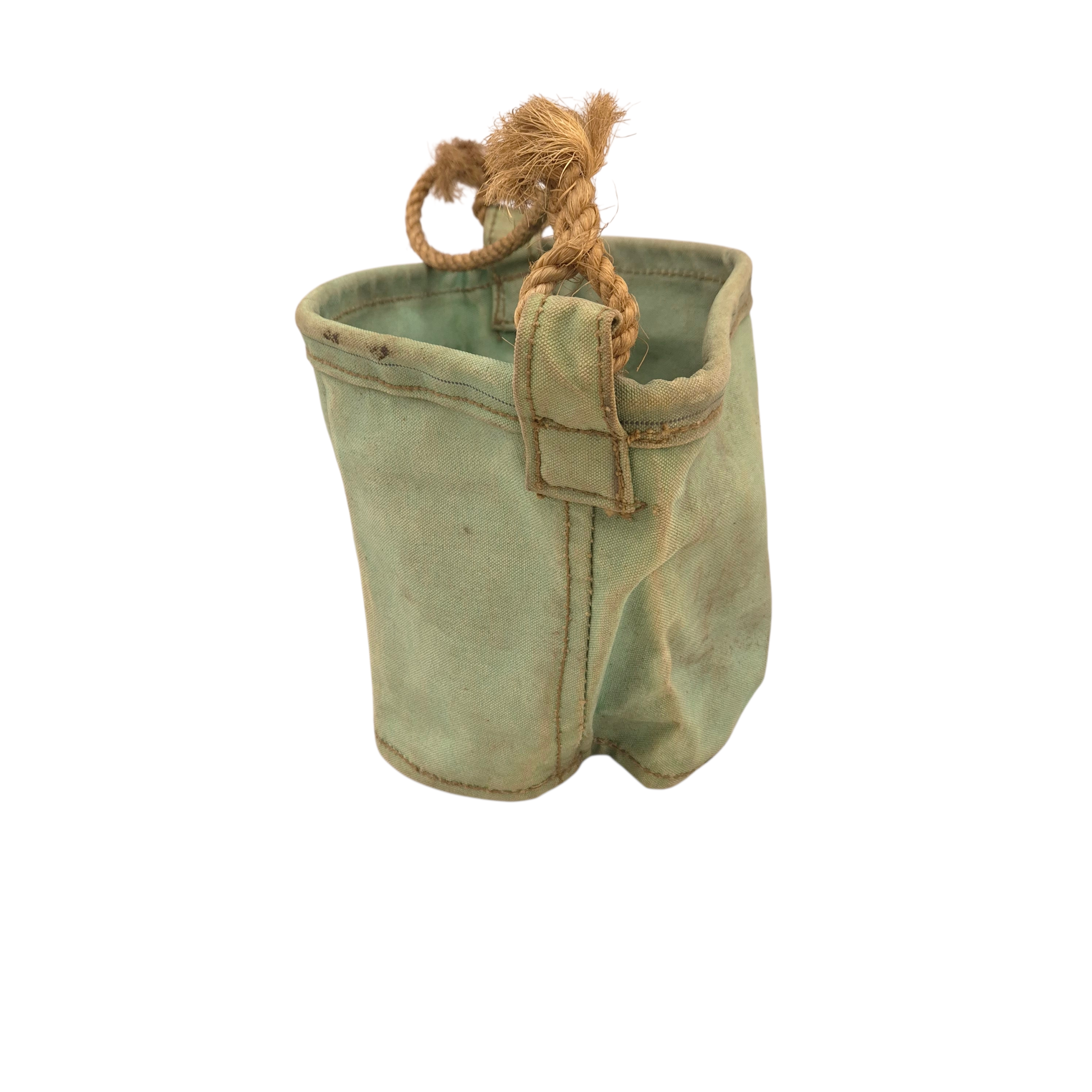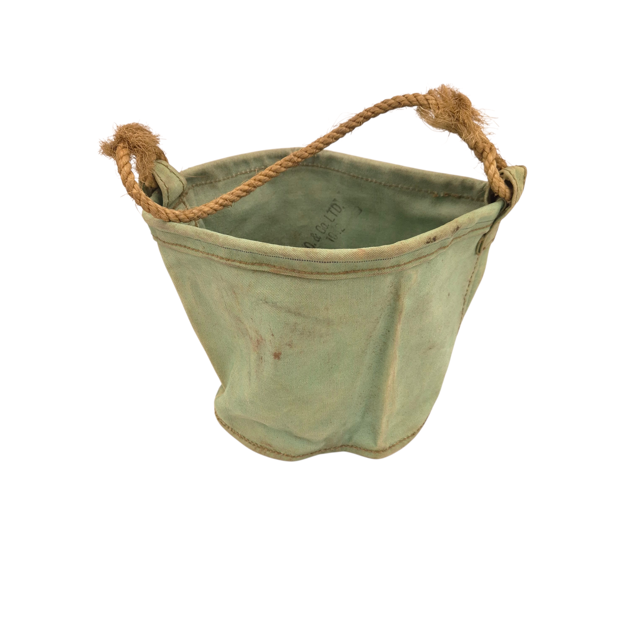 Original WWII British Army Water Bucket in unused condition. This British army canvas water bucket is made by O. & Co. Ltd showing just storage marks. Made of a blue-green canvas it has rope handle on the top which secures to the bucket through a pair of heavy duty sewn fastenings. The fibres in the fabric swelled when wet, preventing further water from penetrating through the fabric. It was lightweight, didn’t get squashed of dented like a metal bucket and could be folded flat so it didn’t take up much room. A scarce item.