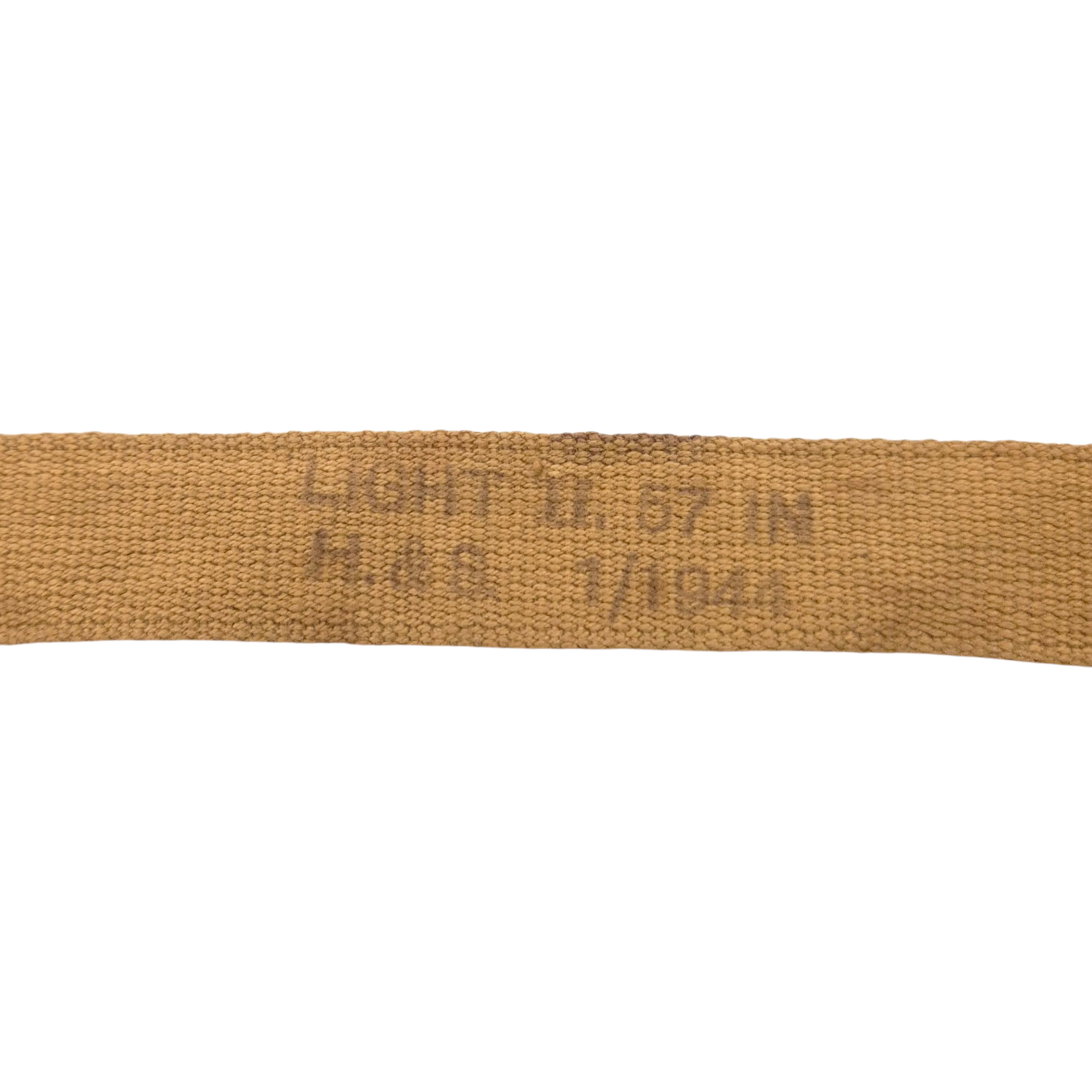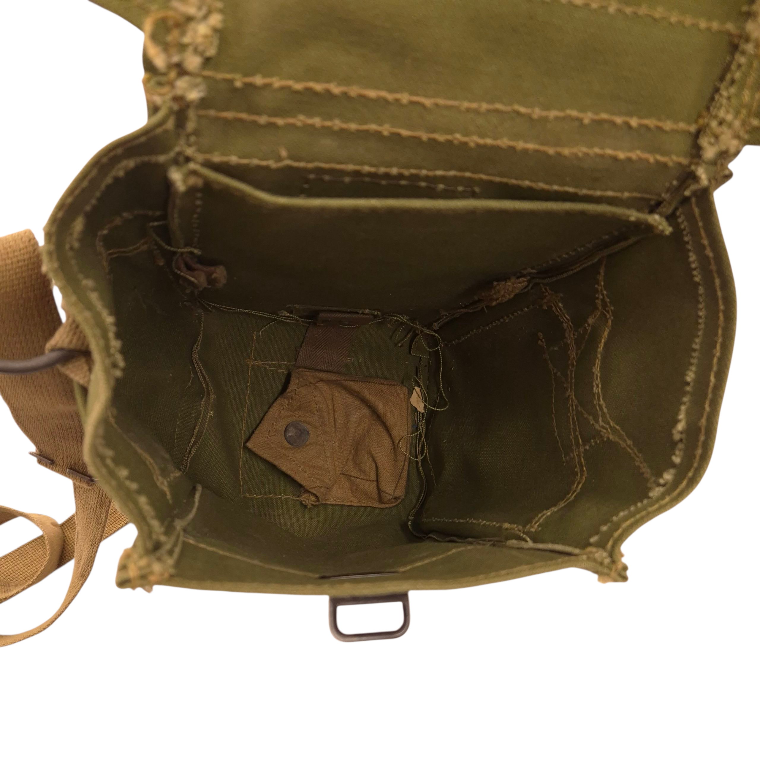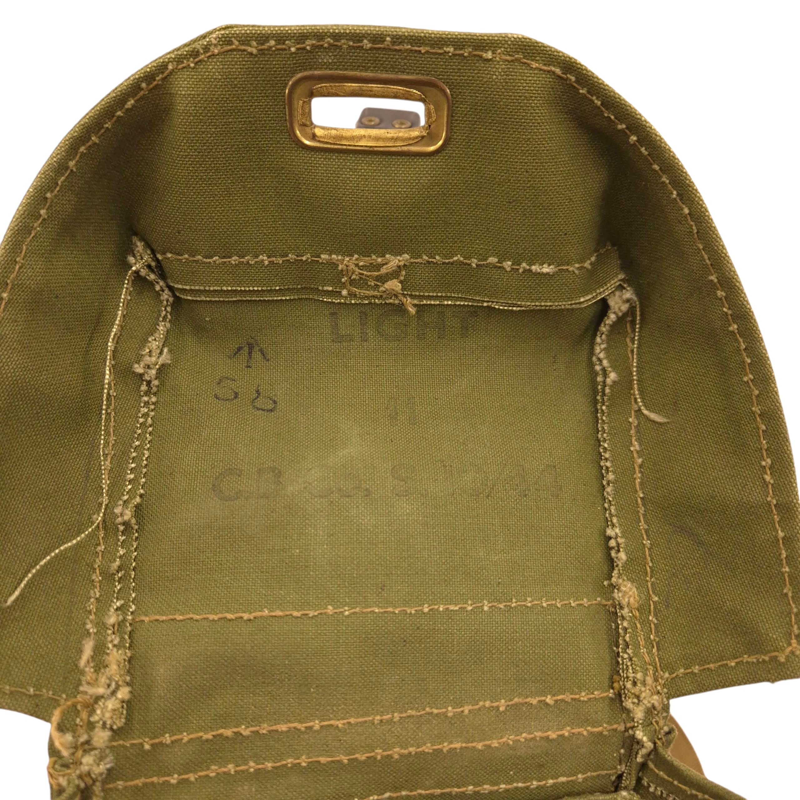 Original WWII British carrying bag for the light-respirator. The bag is maker marked, dated 1944. The carrying strap is also marked and dated.