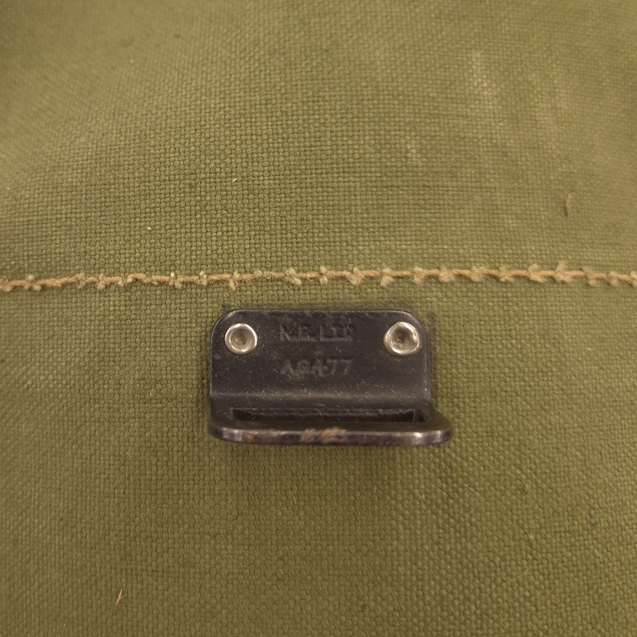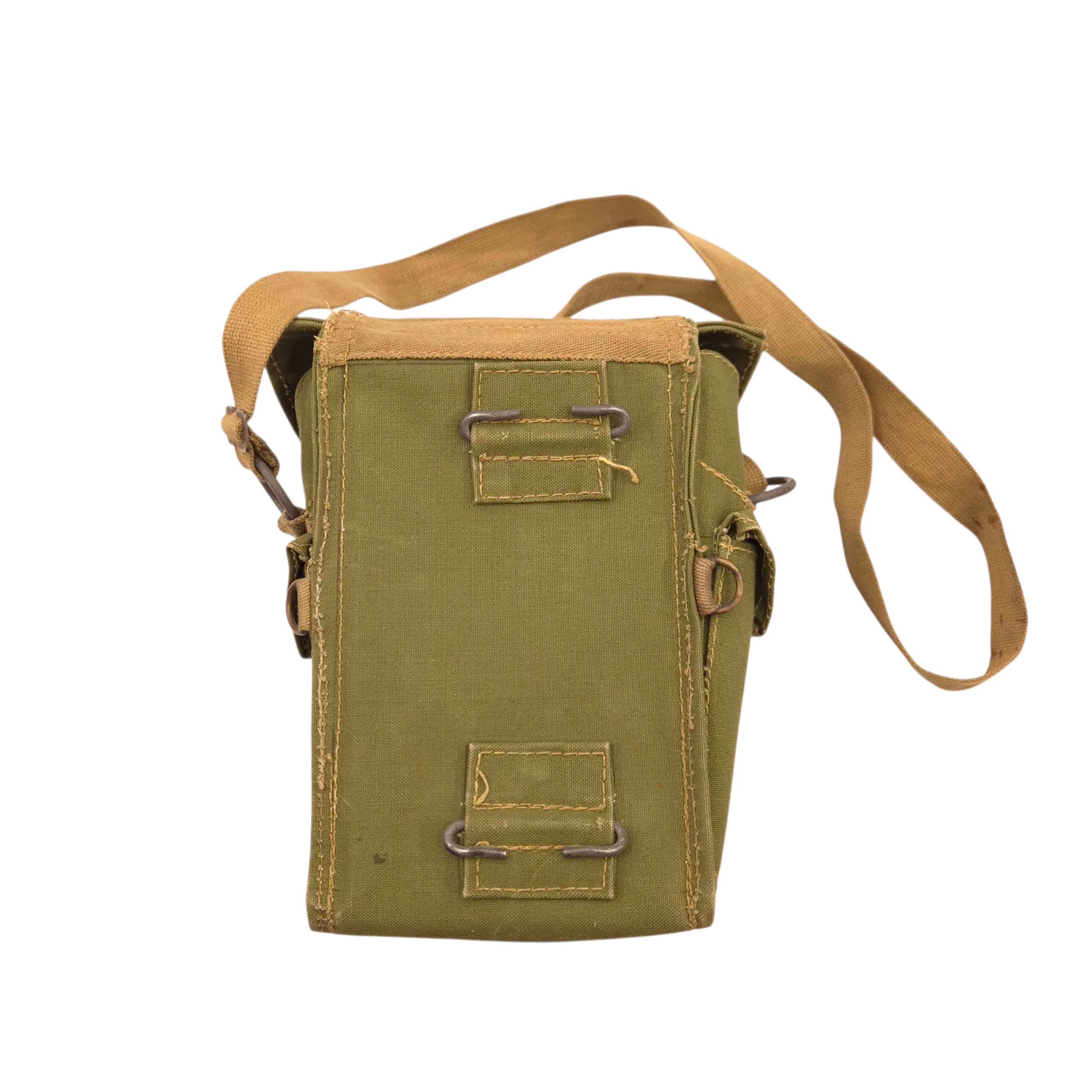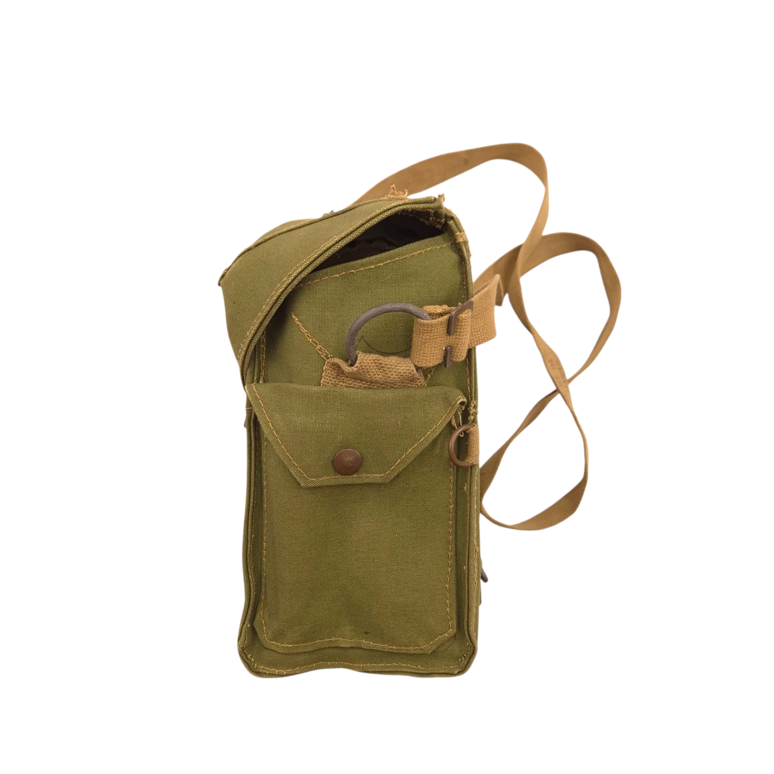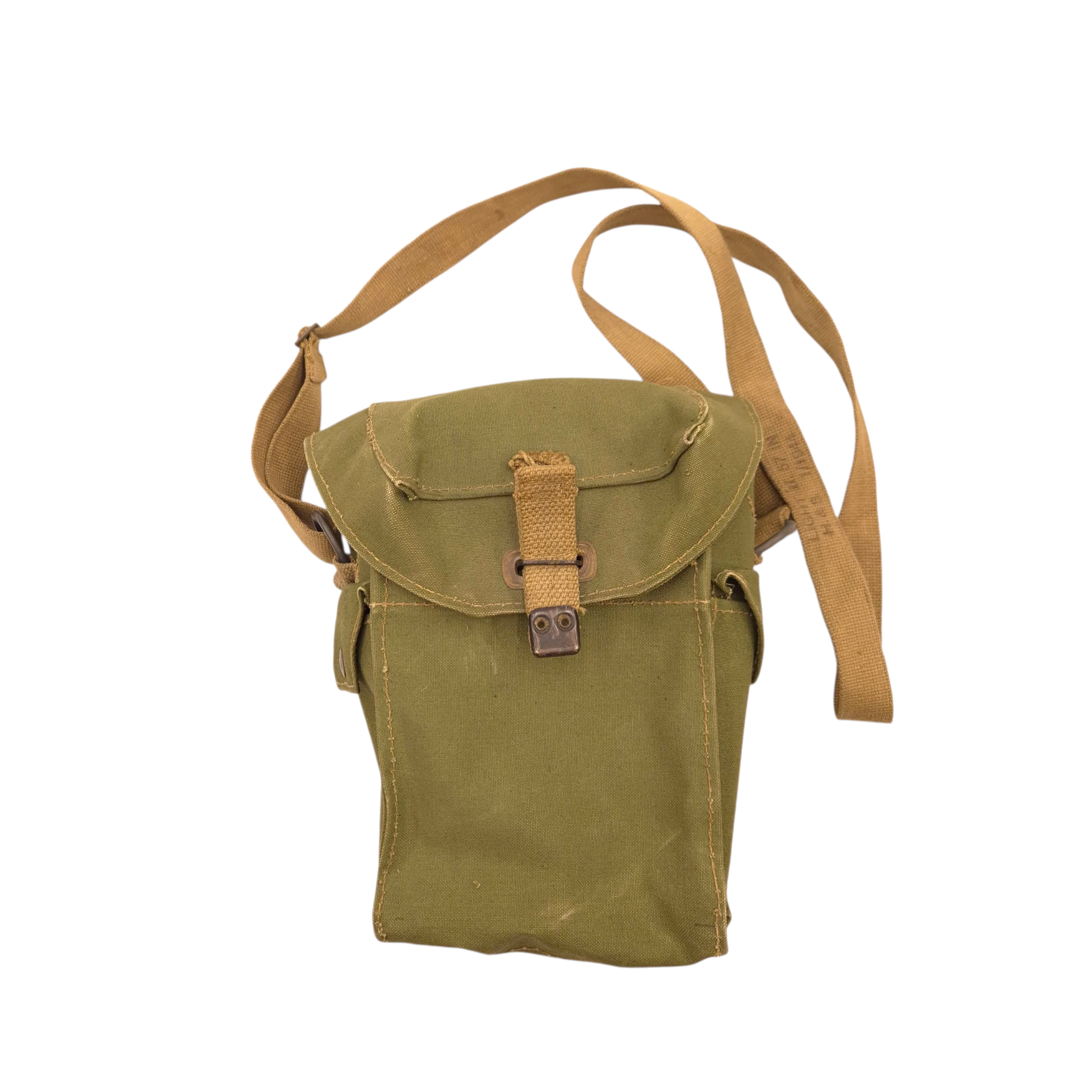 Original WWII British carrying bag for the light-respirator. The bag is maker marked, dated 1944. The carrying strap is also marked and dated.