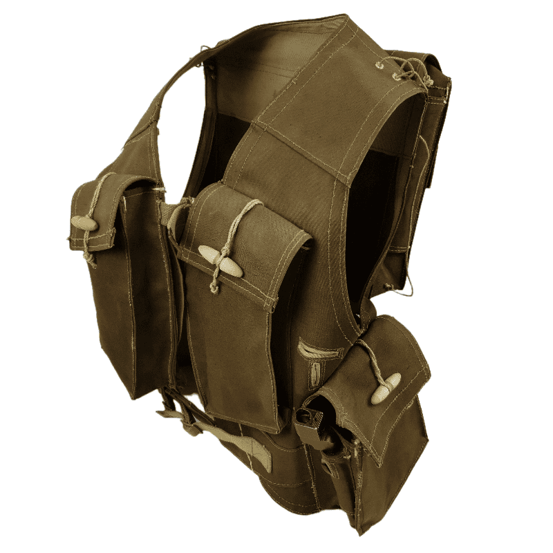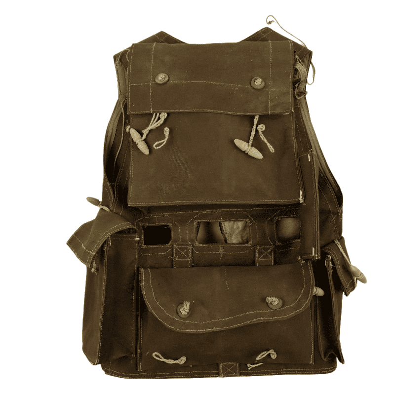 Hard to find original WW2 British Battle-Jerkin. The Battle Jerkin and was developed in 1942 by Colonel Rivers-MacPherson for the British Army and introduced in 1943. History has it that he disliked the Pattern 37 web gear in common use at the time and took the opportunity to design something he thought more efficient. The brown Battle-Jerkins were heavily issued to British and Canadian assault troops of the 21st Army Group. This Battle-Jerkin is in stunning condition! Maker marked by W&G and dated 1943 in size Medium. Strings for gascape are also present to both shoulders. Comes with a spike bayonet. Impossible to upgrade!
