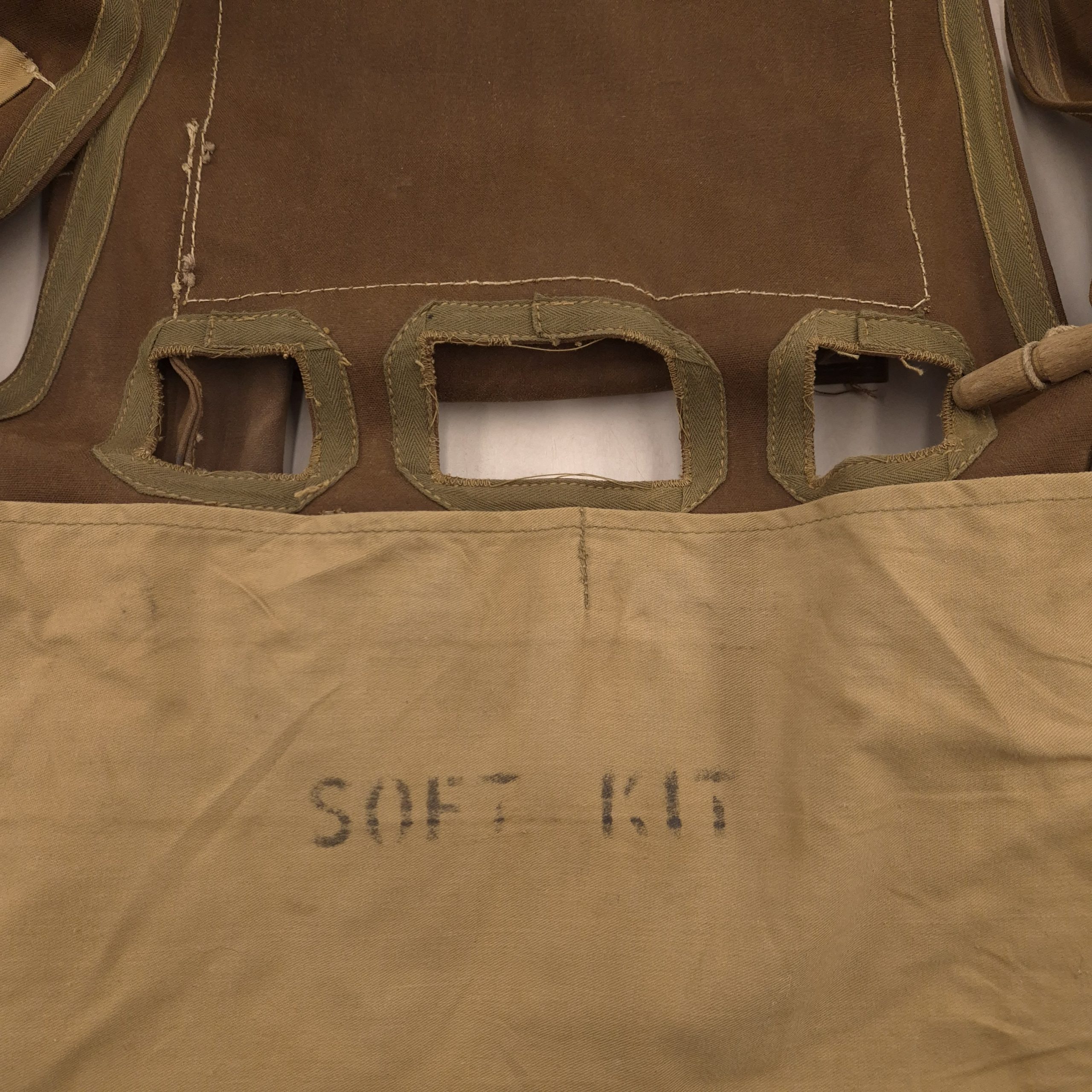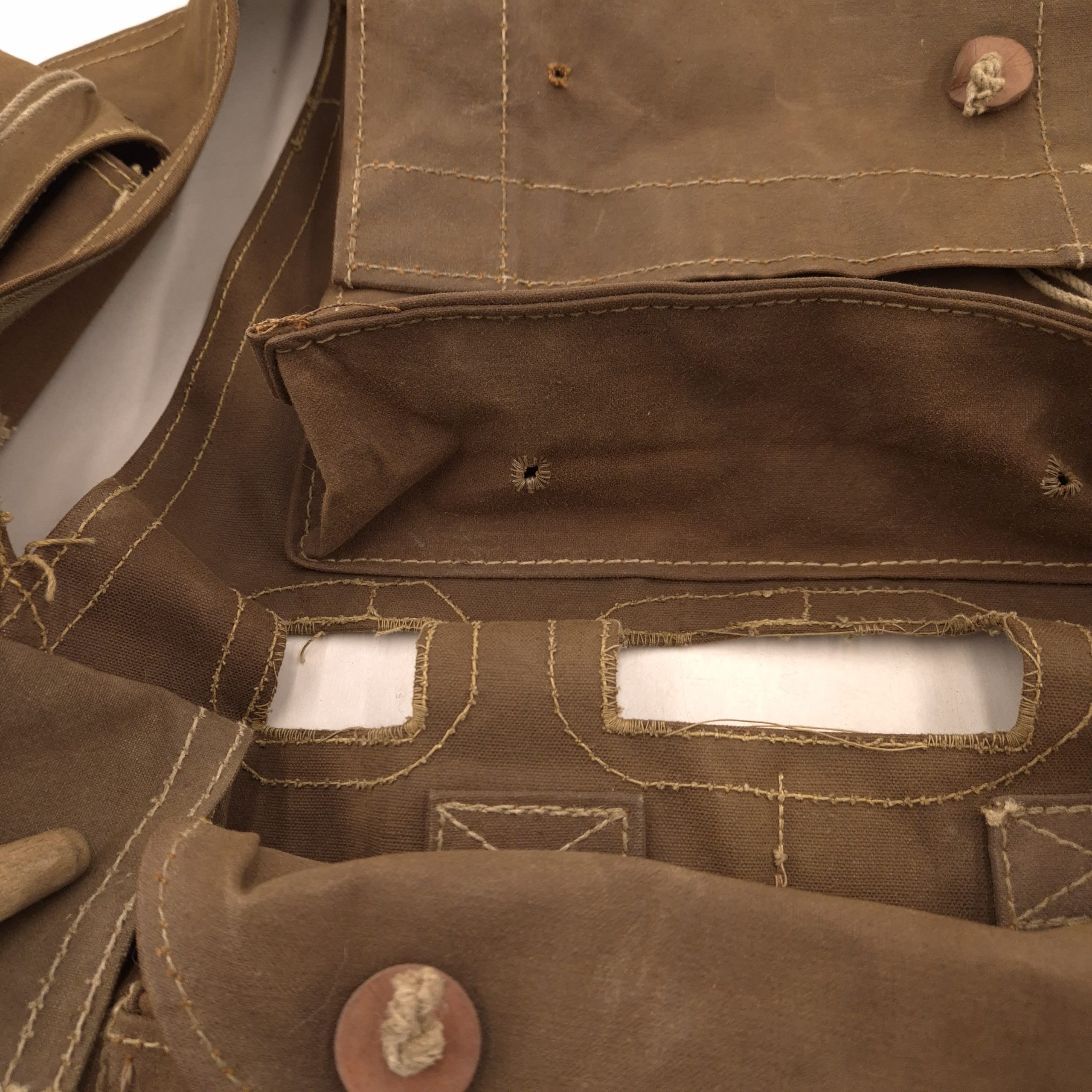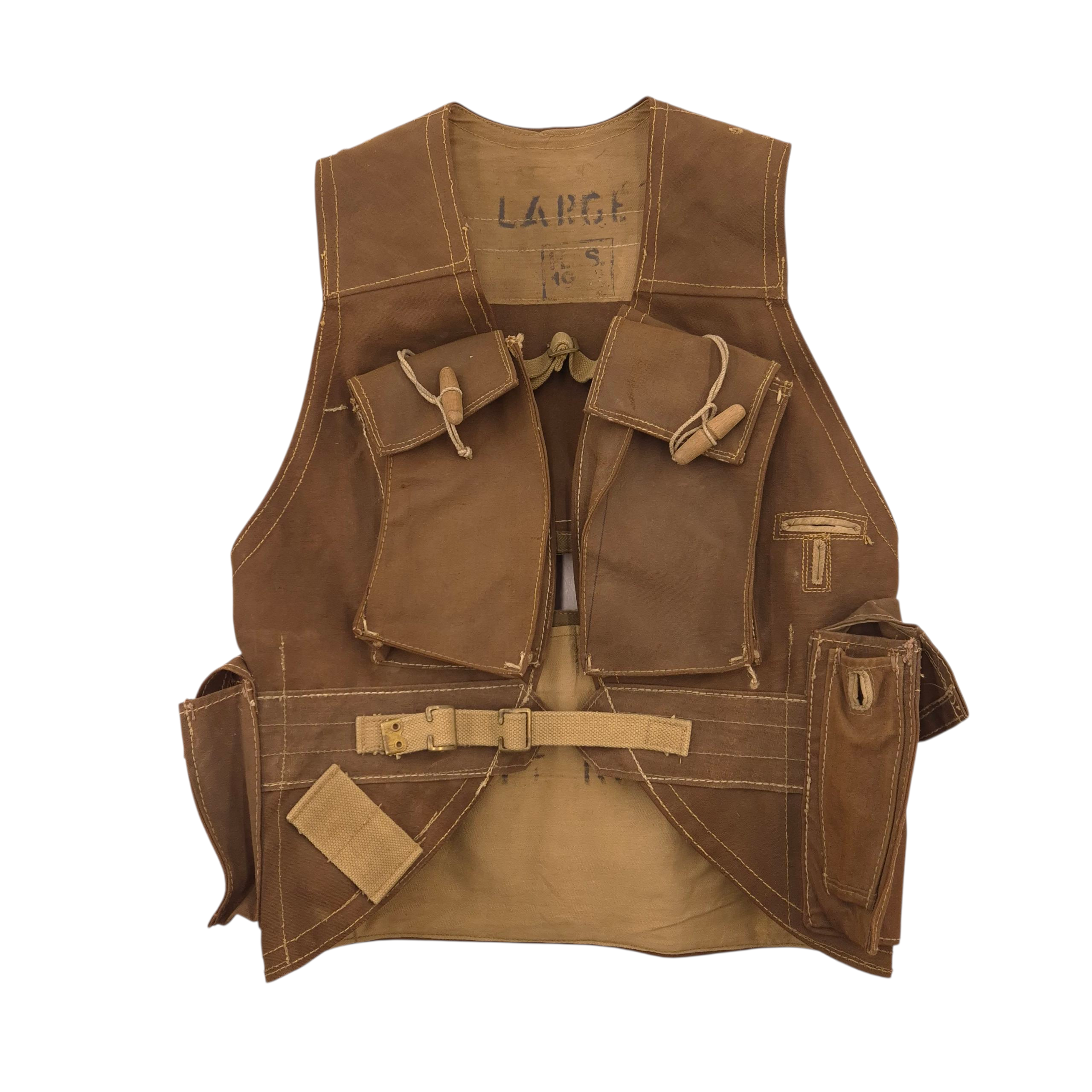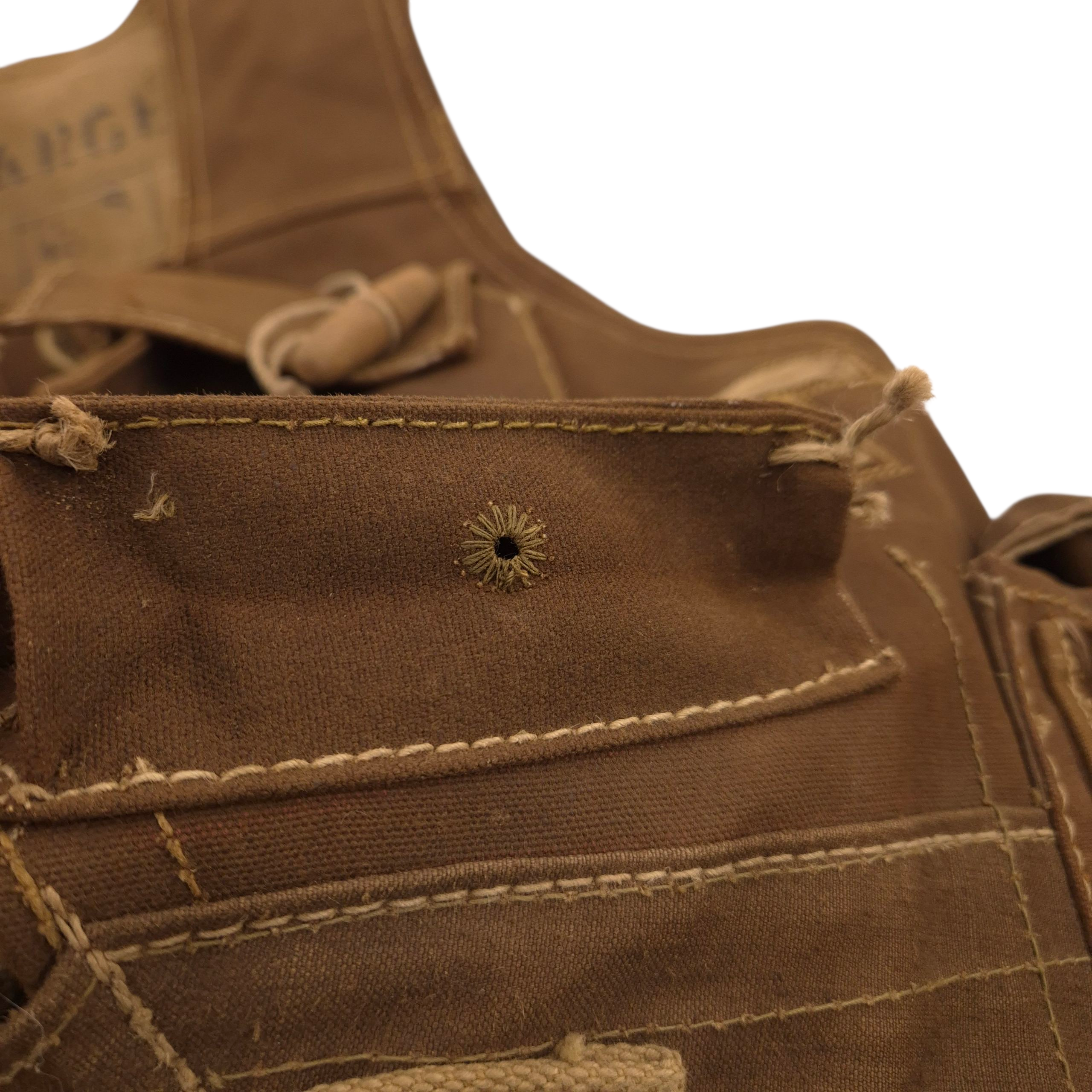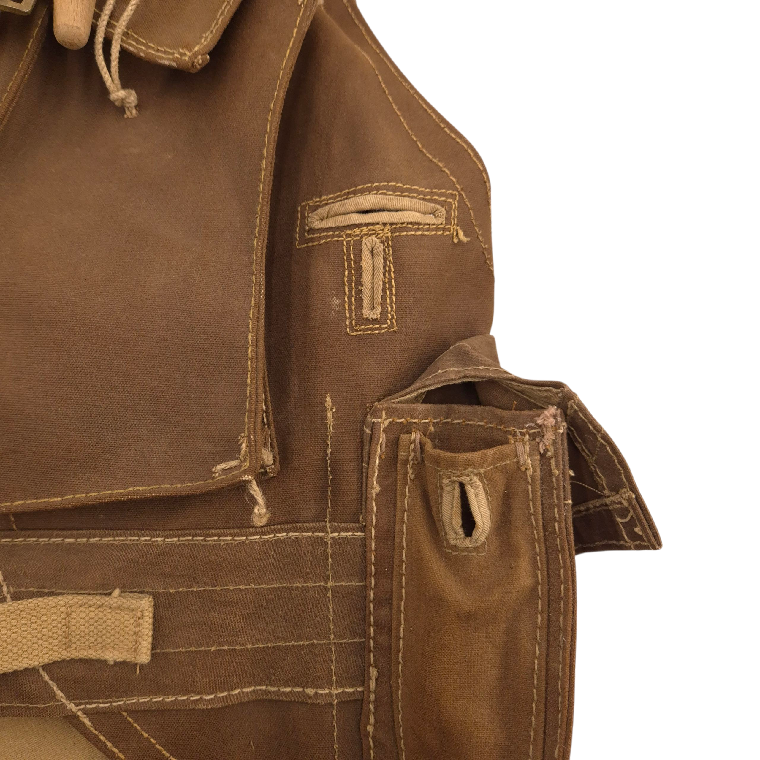 RARE original WWII British ‘Battle Jerkin’, also known as ‘Assault Jerkin’, in good used condition. The Battle Jerkin was developed in 1942 by Colonel Rivers-MacPherson for the British Army and introduced in 1943. History has it that he disliked the Pattern 37 web gear in common use at the time and took the opportunity to design something he thought more efficient. Typically made of heavy-duty canvas or similar materials, providing durability in combat conditions. It had multiple sewn-in pouches and pockets for carrying ammunition, grenades, and other essential equipment, making it more efficient than the belt-based webbing systems. The brown Battle-Jerkins were heavily issued to British and Canadian D-Day assault troops. This Battle-Jerkin shows normal traces of wear. Maker marked by H&S and dated 1943 (faded, but visible if you know where to look) in size Large. Strings and toggles are present; one wooden toggle on the backpack is missing. Otherwise complete.