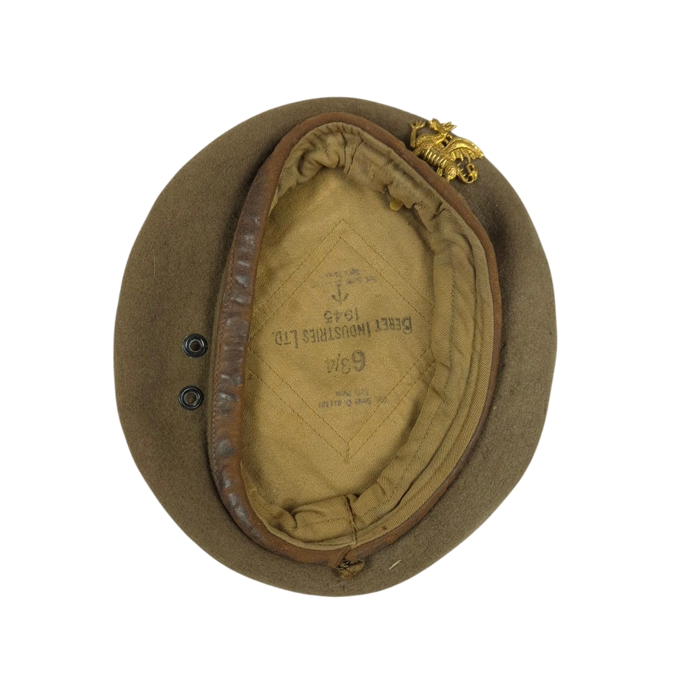 Original WWII British ‘brown’ Beret. This original brown beret, as worn by Reconnaissance Corps personnel, Officers, and select other units, is in good used condition. Nicely maker-marked by Beret Industries Ltd. dated 1945, and sized 6 3/4. It appears to be named, though the writing is difficult to make out.