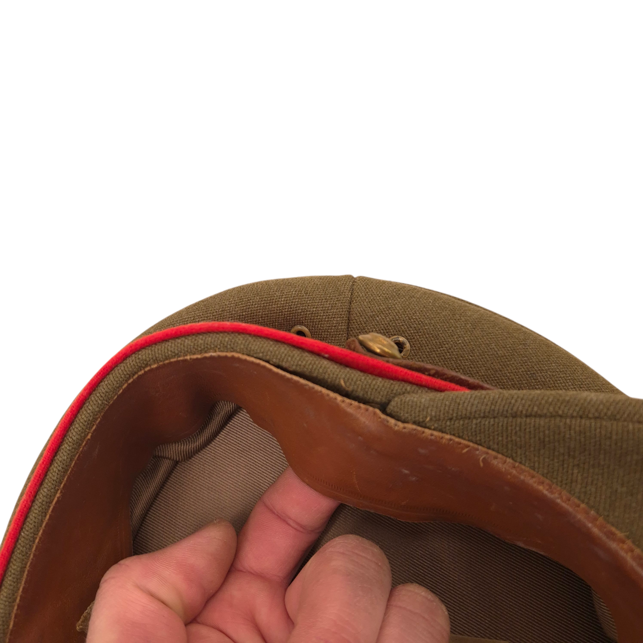 Original WWII British Brigadier/Colonel’s Service Dress cap. A very good British officers’ Service Dress cap, suitable for the rank of Brigadier or Colonel. Features a high-quality bullion insignia on the front, with a red band and brown leather chinstrap. The interior lining bears the tailor label: “Edward Smith, London”. The sweatband shows slight looseness on both sides but remains in good overall condition. Free from moth damage. A good sized example, approximately size 57. A desirable piece for collectors of British WWII headgear.