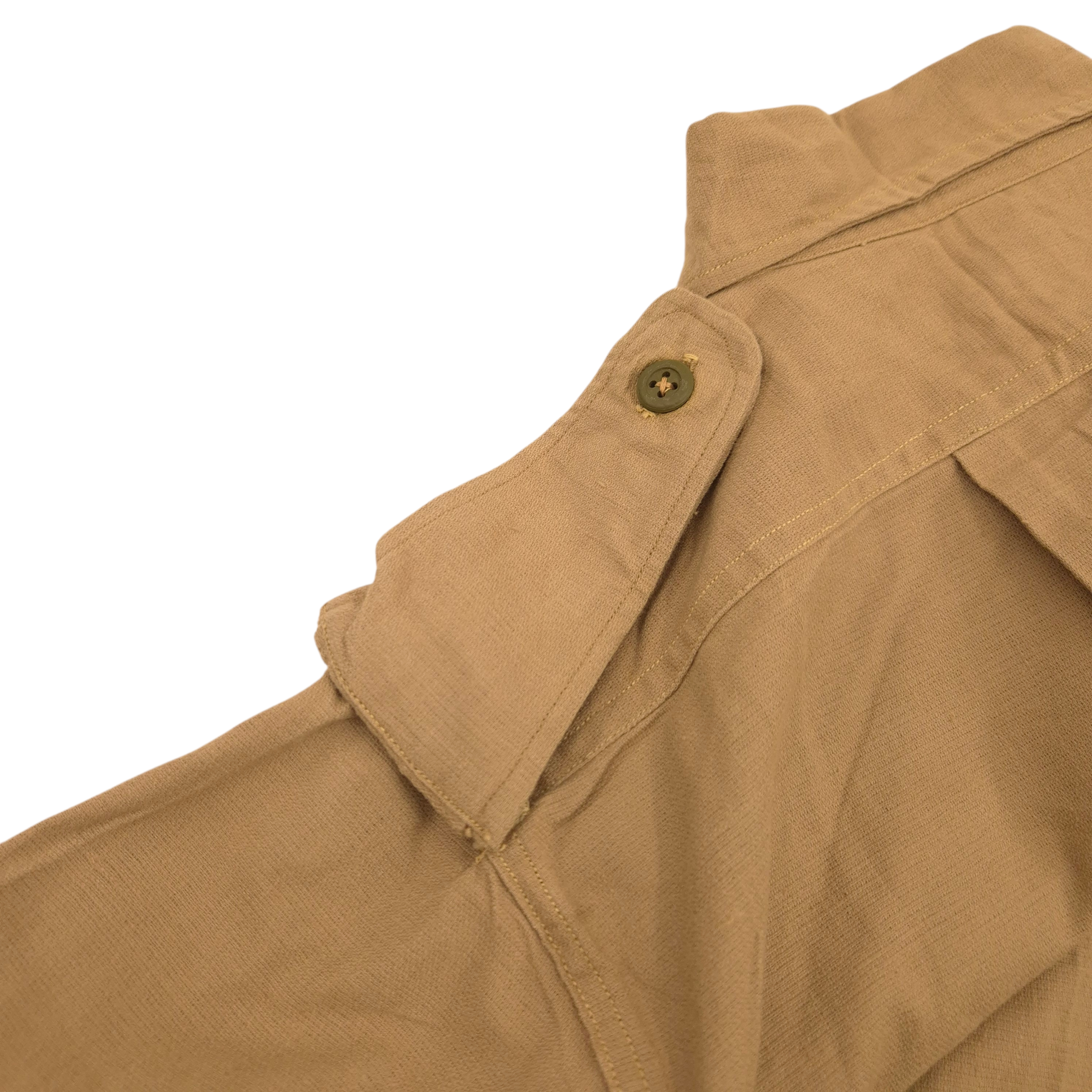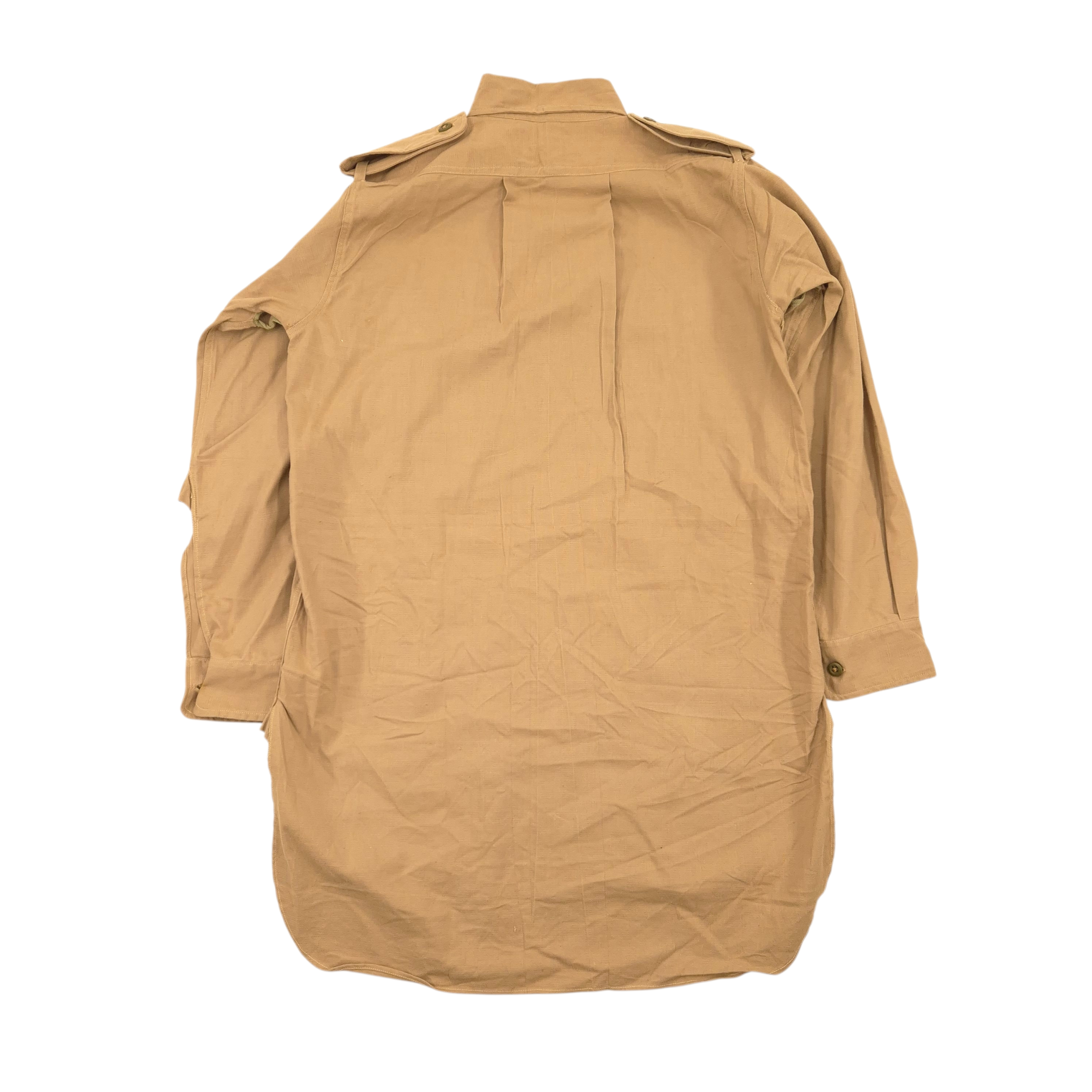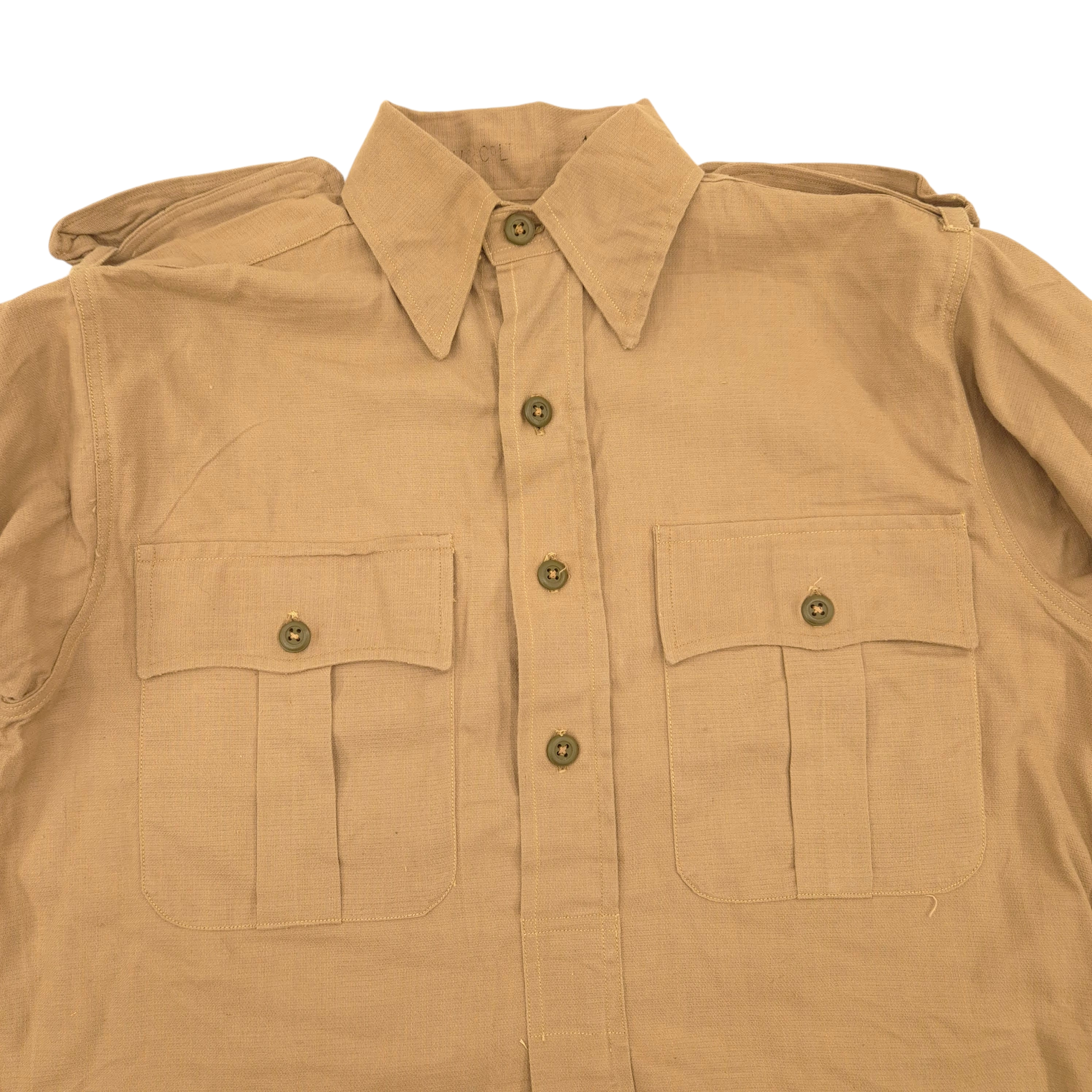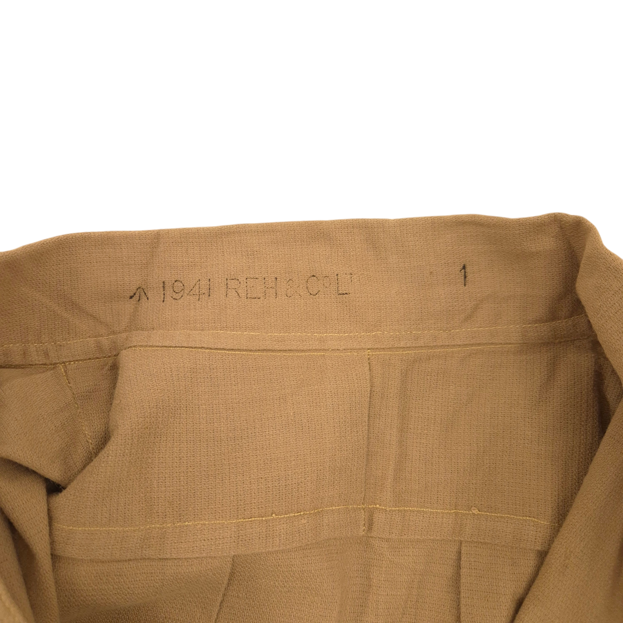 Original WWII British Bush Shirt. This type of Bush Shirt was produced during 1941/1942. It is a pullover style with four buttons used to close up the front and the collar. The two breast pockets have scalloped flaps. All of the buttons are made of rubber. The shoulder straps are removeable and are pulled through a loop of cloth on the shirt at the shoulder seam and buttoned down near the neck. Made by REH & Co Ltd, dated 1941. Very good condition.