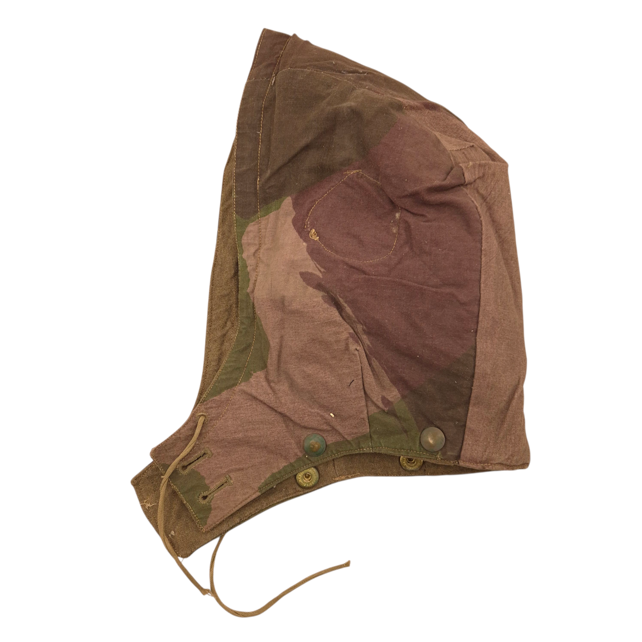 Original WWII British Camouflage hood for the Tanker’s Oversuit (Pixie Suit). Good condition with string, all brass press-studs are present. An item that is often missing from the tanker’s oversuit.