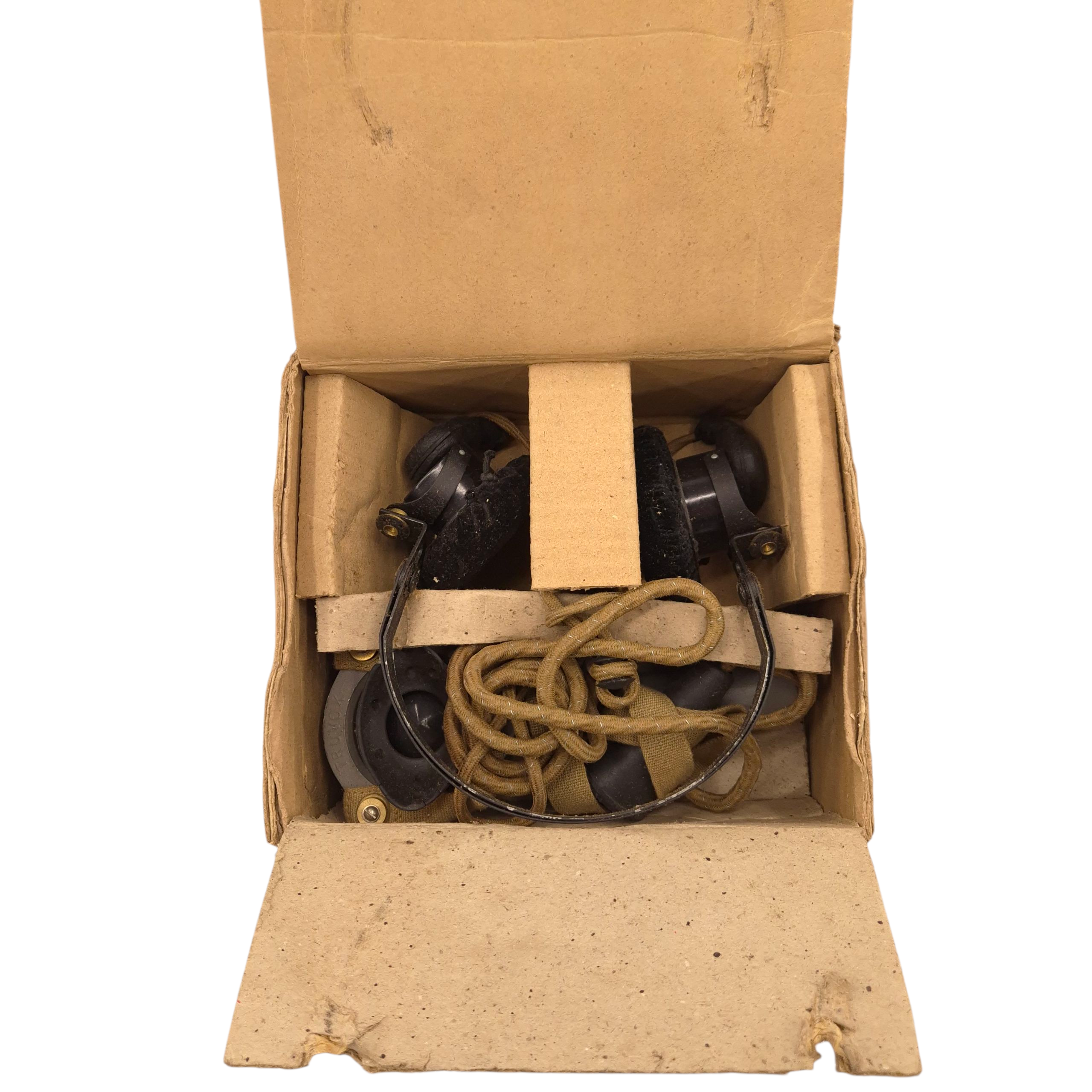 Original WWII British/Canadian headphones and microphone set in its original cardboard box, ZA-2905. The set is in unused condition. The microphone’s rubber mouthpiece is in good condition, complete set. Comes with its original plug. Used by tank crews and radio operators.