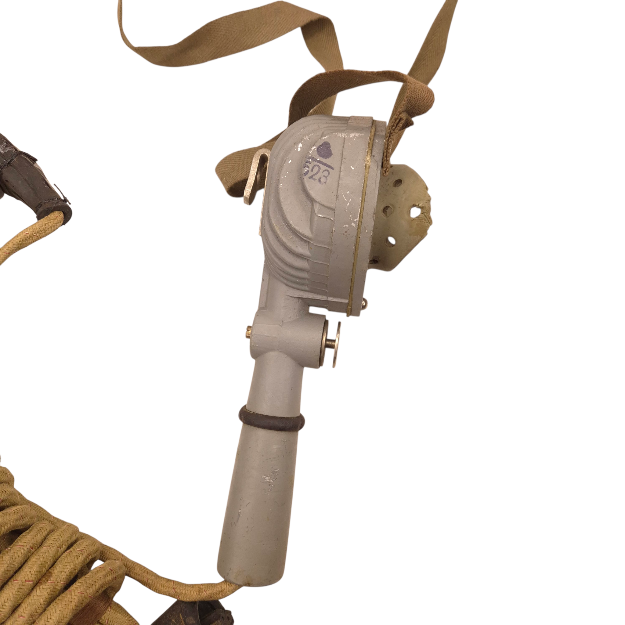 Original WWII British/Canadian headphones and microphone set in its original cardboard box, ZA-2905. The set is in unused condition. The microphone’s rubber mouthpiece is in good condition, somewhat dry as a result of long storage, complete set. Comes with its original plug. Used by tank crews and radio operators. We recently discovered a crate dated 1944 that still contains the headphones.
