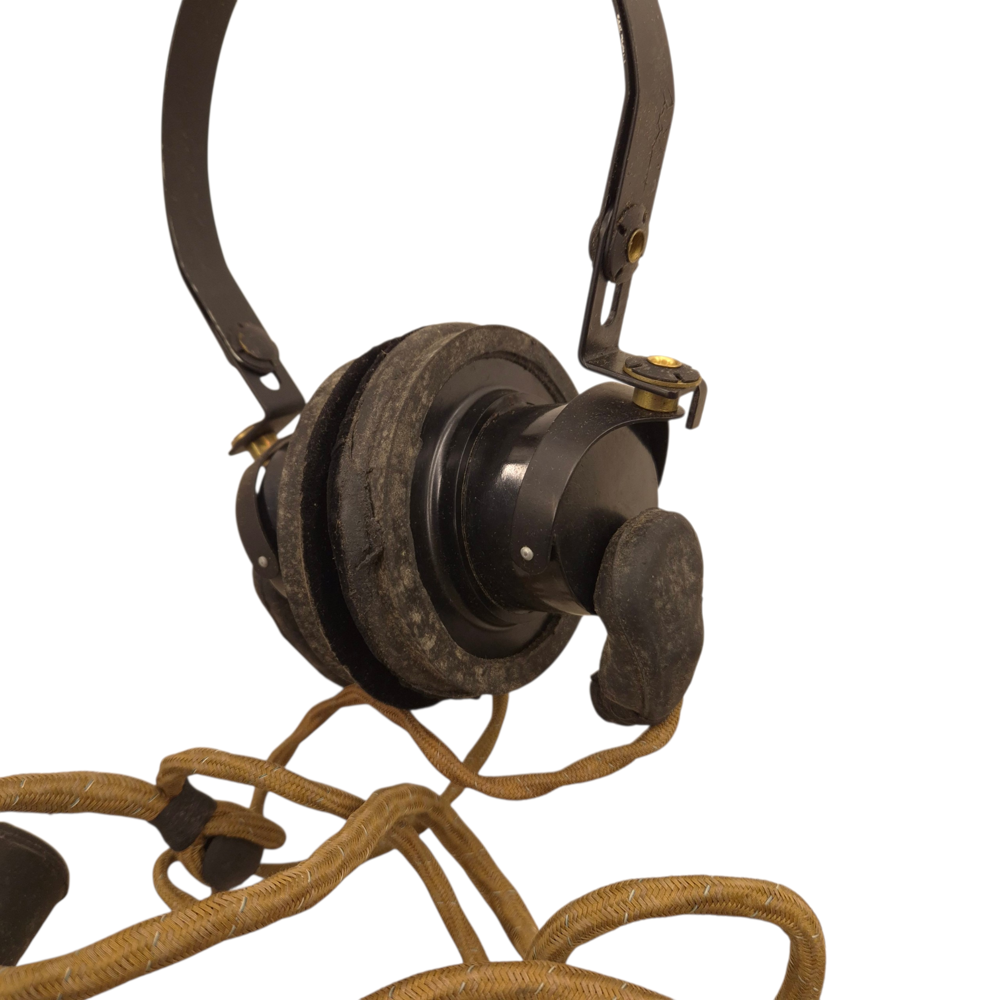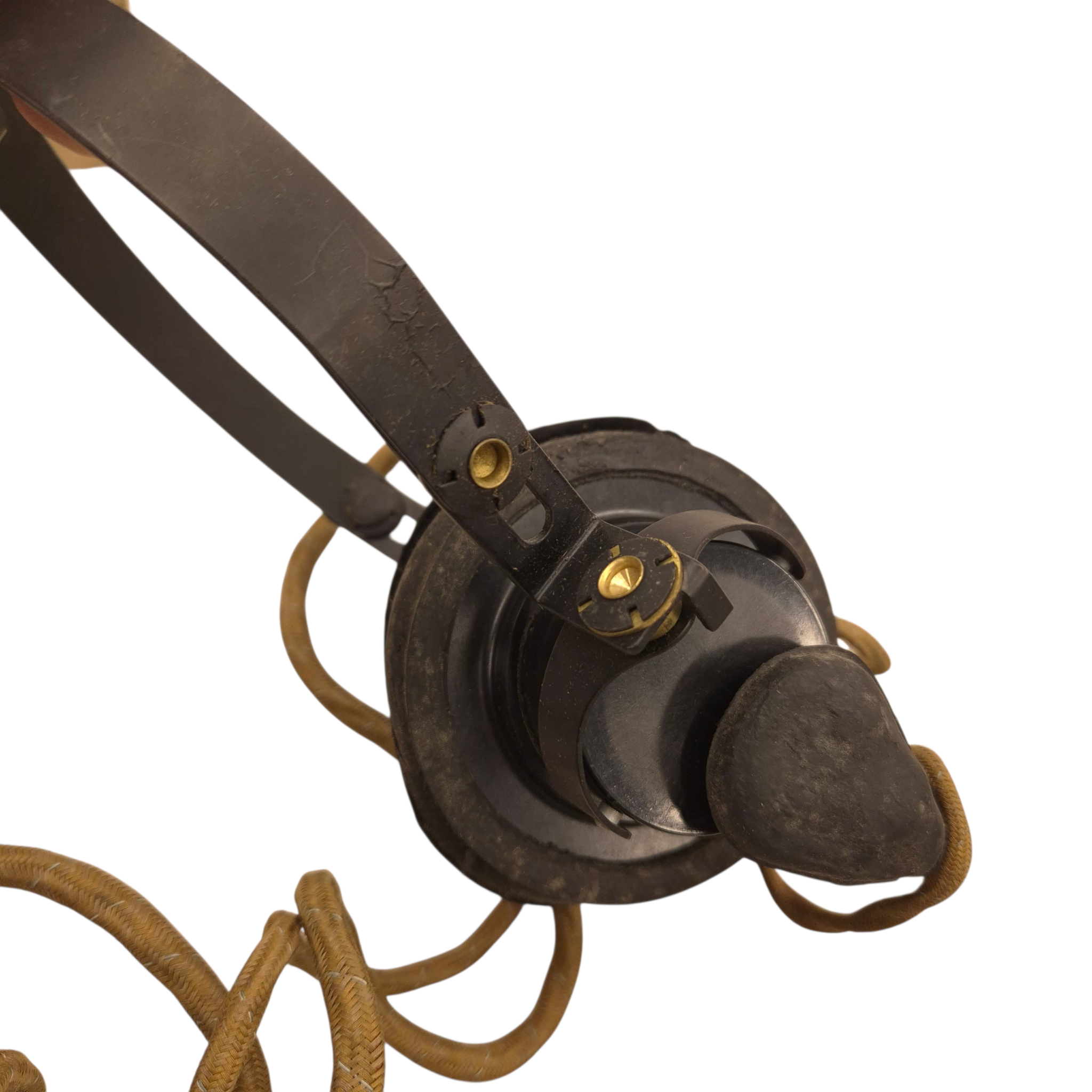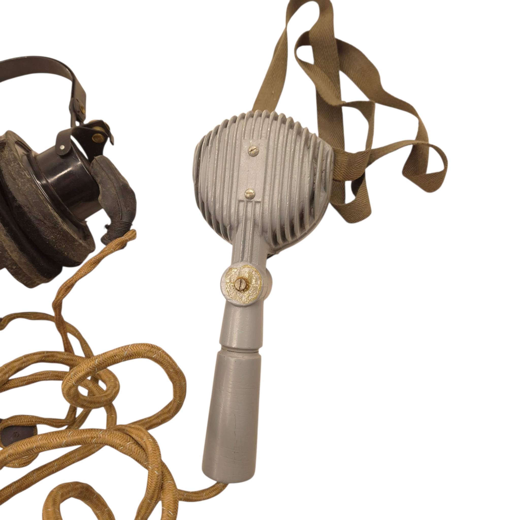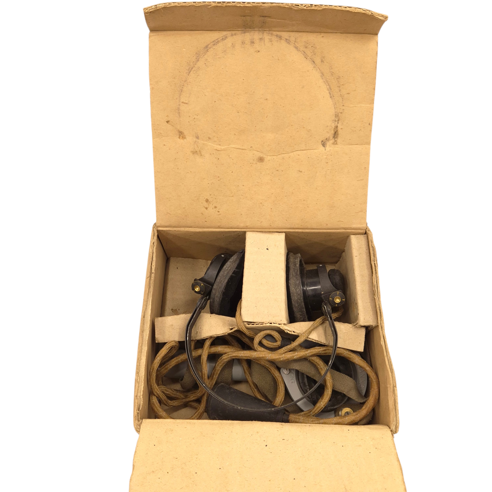 Original WWII British/Canadian headphones and microphone set in its original cardboard box, ZA-2905. The set is in unused condition. The microphone’s rubber mouthpiece is in good condition, somewhat dry as a result of long storage, complete set. Comes with its original plug. Used by tank crews and radio operators. We recently discovered a crate dated 1944 that still contains the headphones.