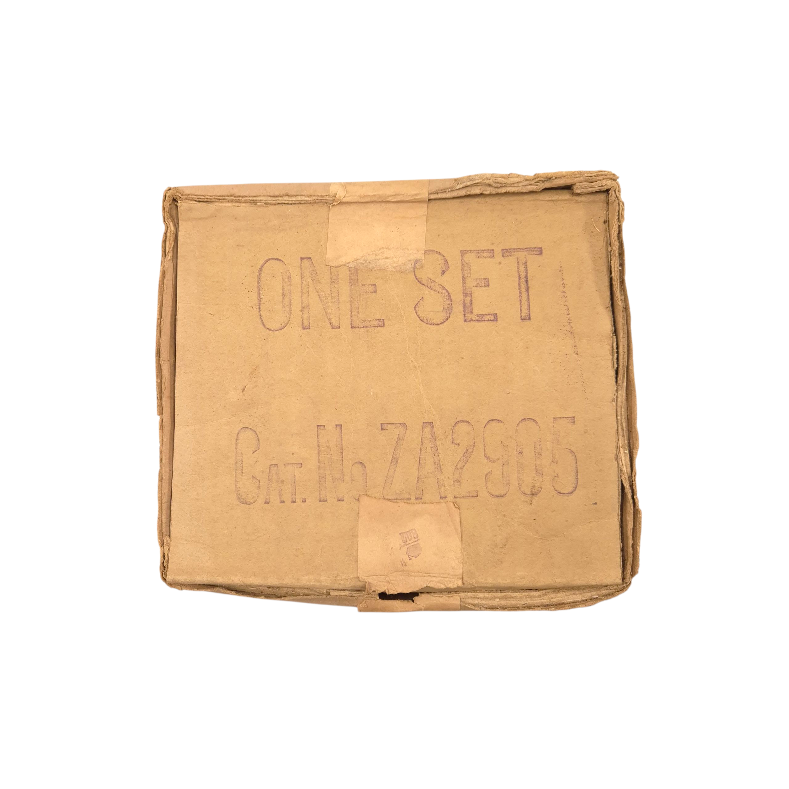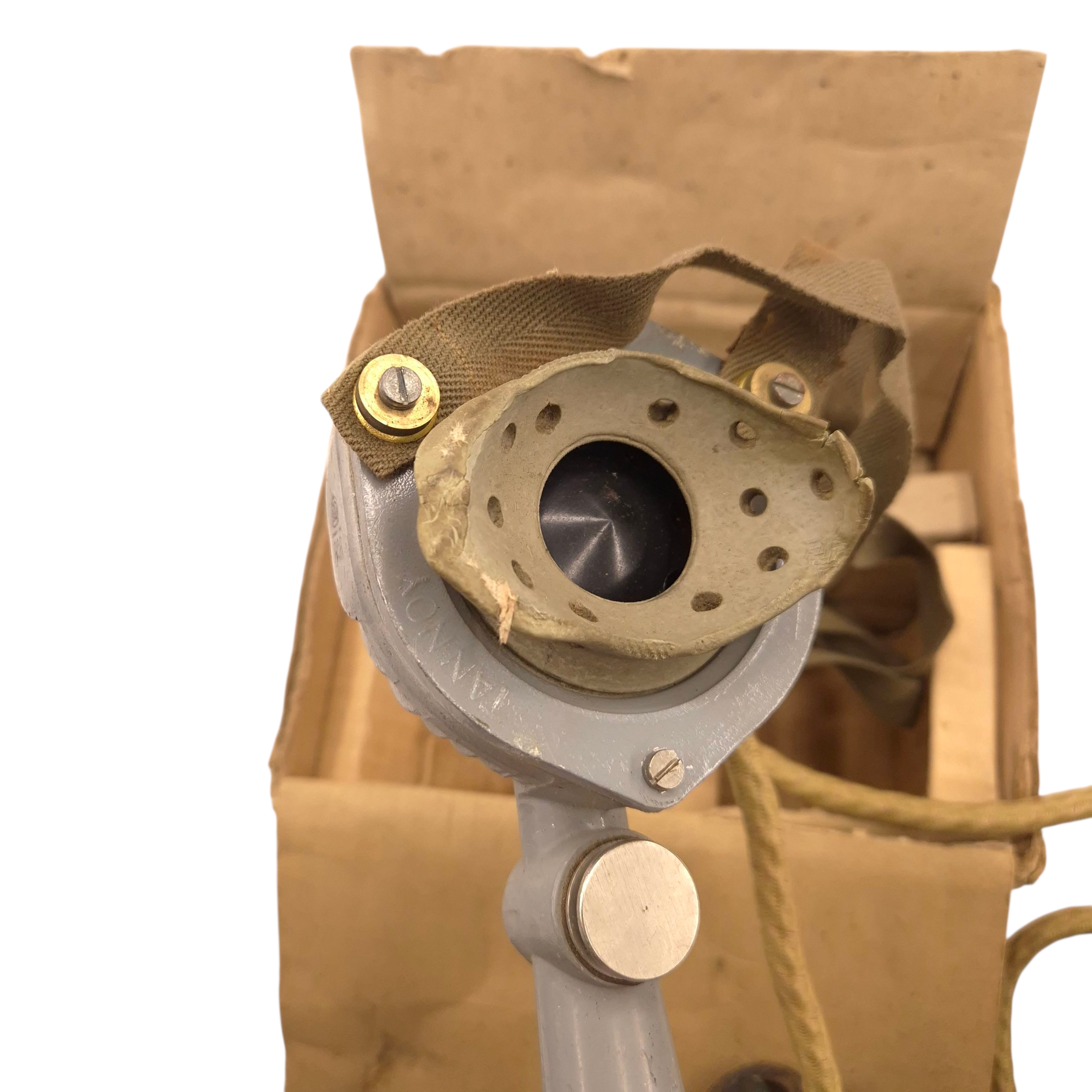 Original WWII British/Canadian headphones and microphone set in its original cardboard box, ZA-2905. The set is in unused condition. The microphone’s rubber mouthpiece shows some storage-related damage, but overall it remains a very nice, complete set. Comes with its original plug. Used by tank crews and radio operators.