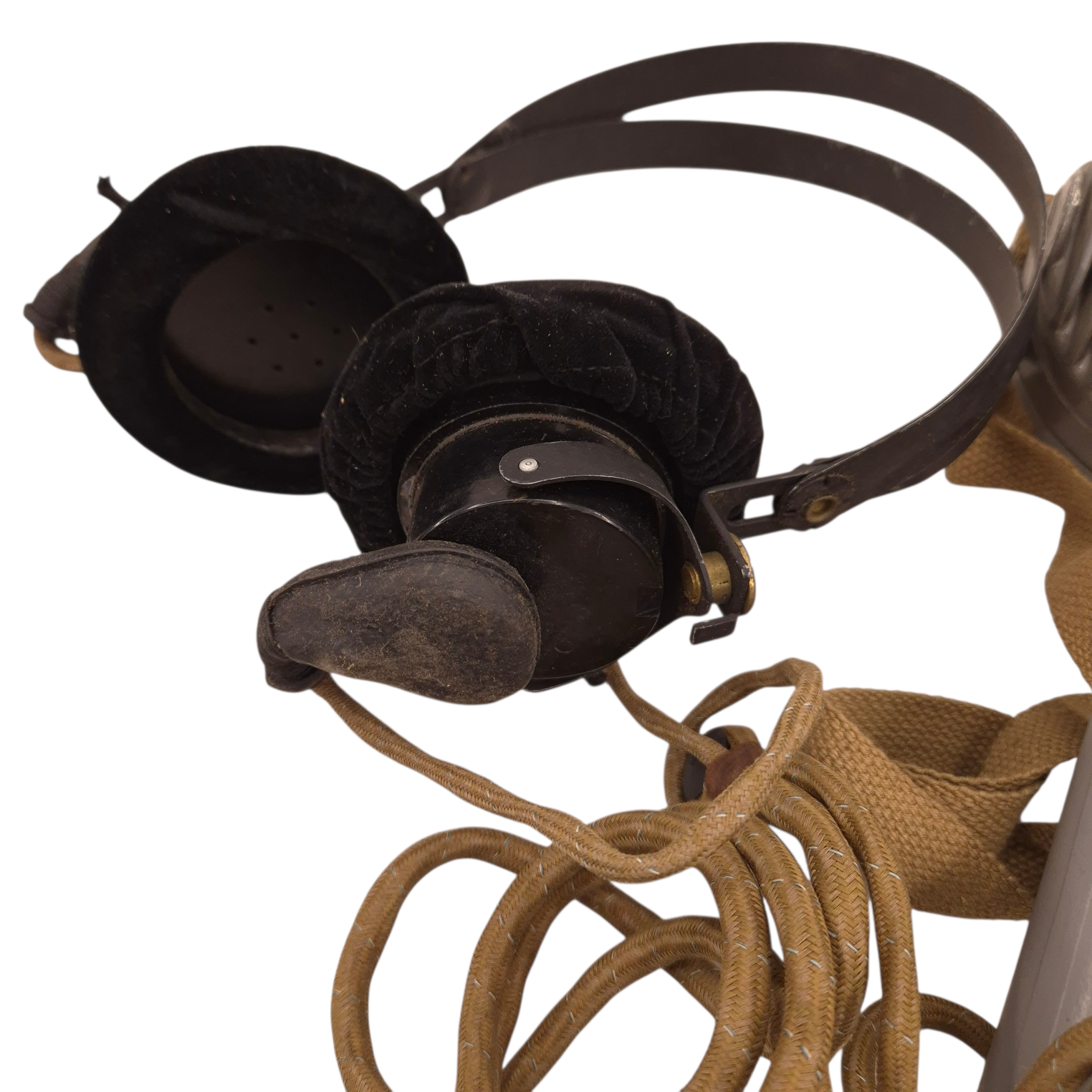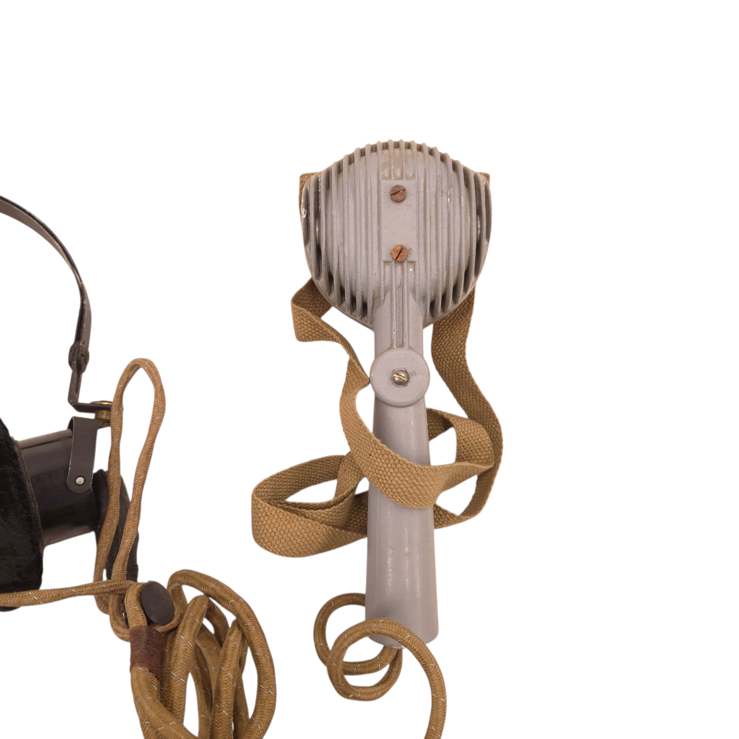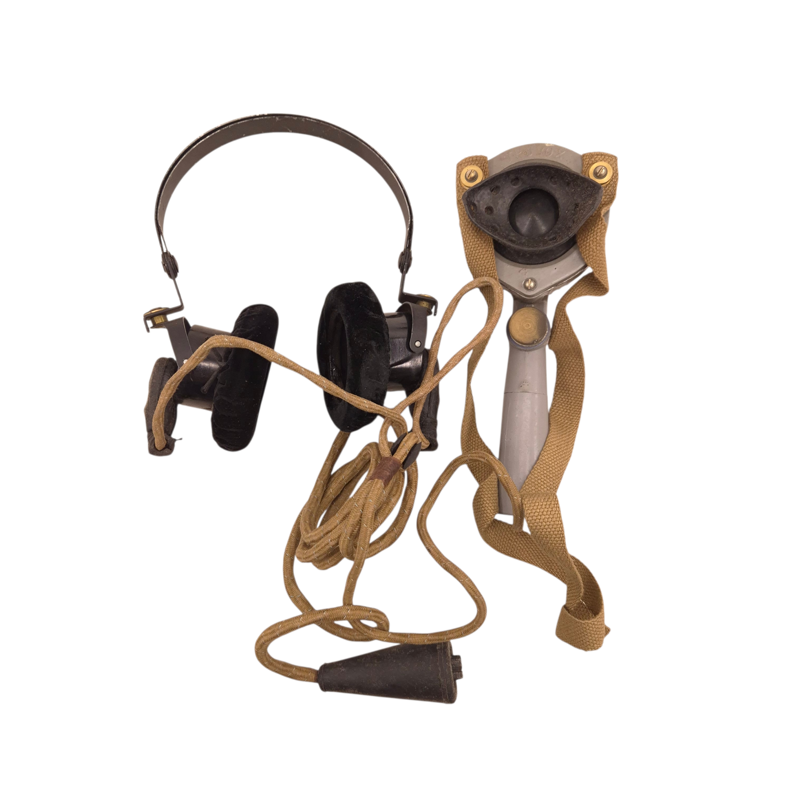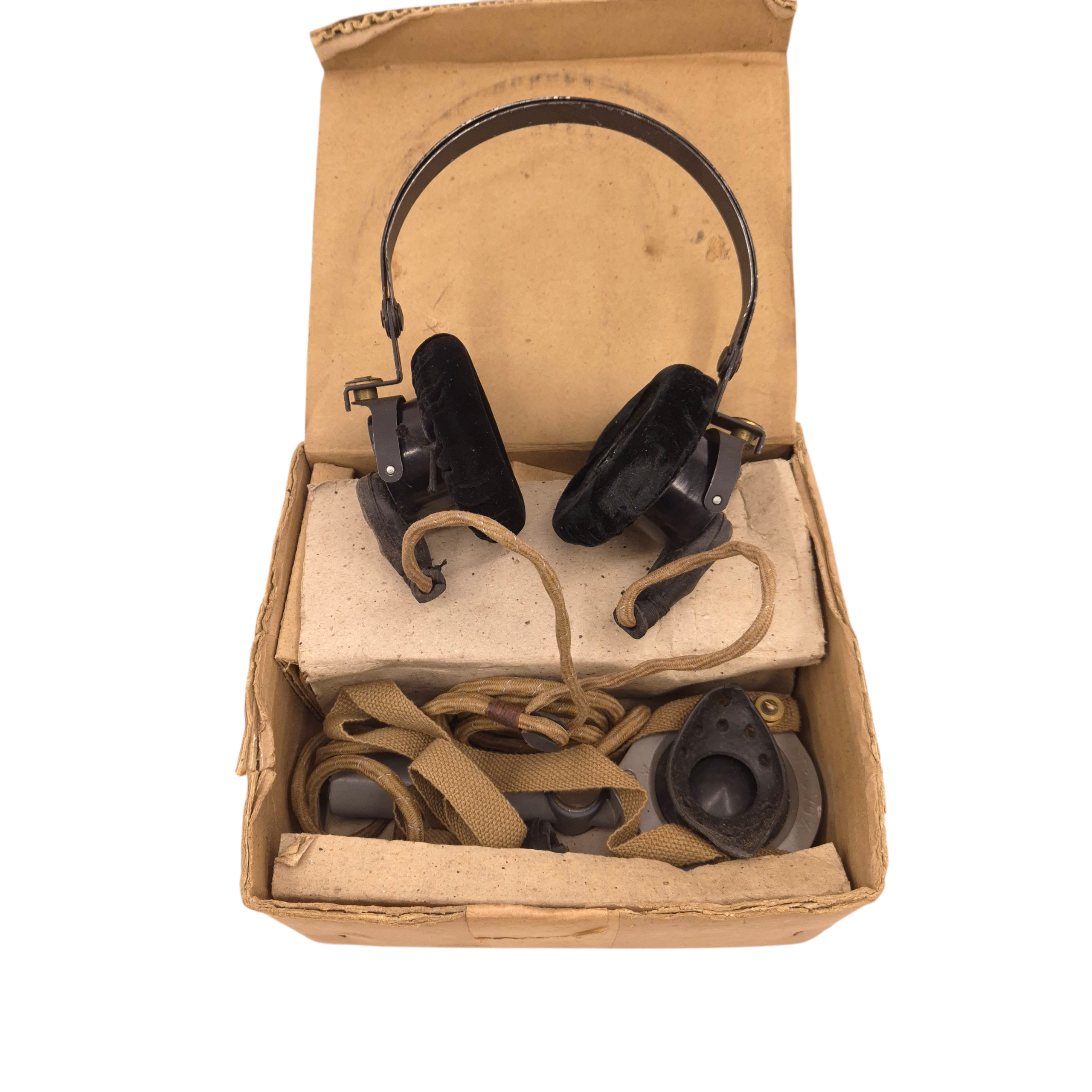 Original WWII British/Canadian headphones and microphone set in its original cardboard box, ZA-2905. The set is in unused condition. The microphone’s rubber mouthpiece is in good condition, somewhat dry as a result of long storage, complete set. Comes with its original plug. Used by tank crews and radio operators. We recently discovered a crate dated 1944 that still contains the headphones.