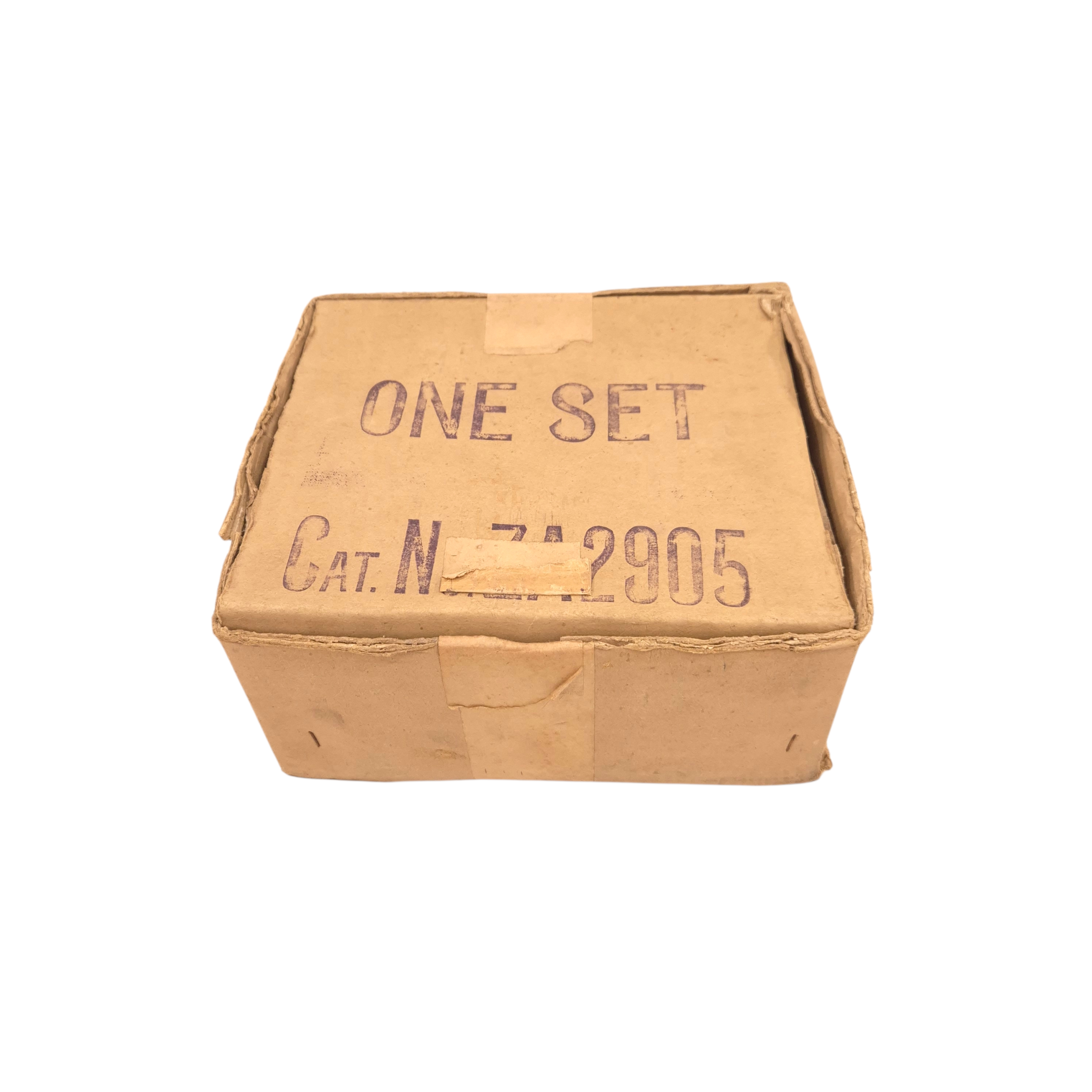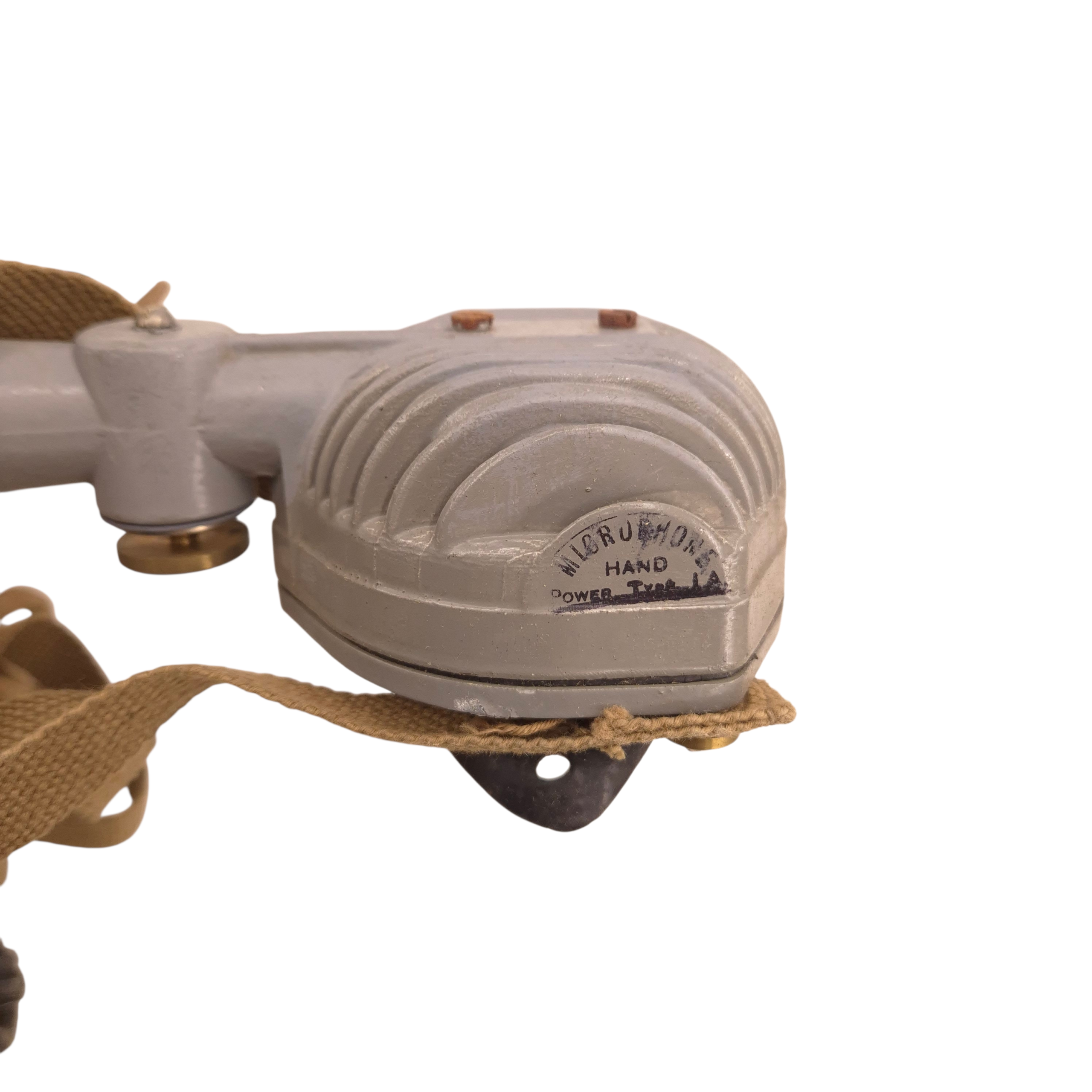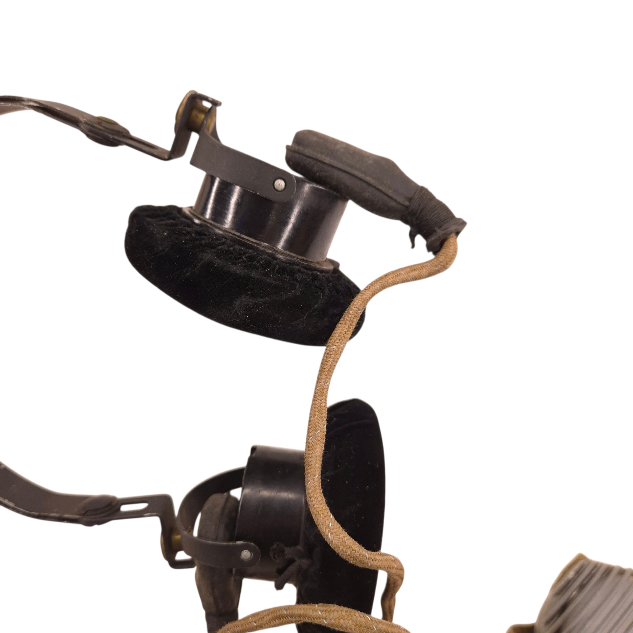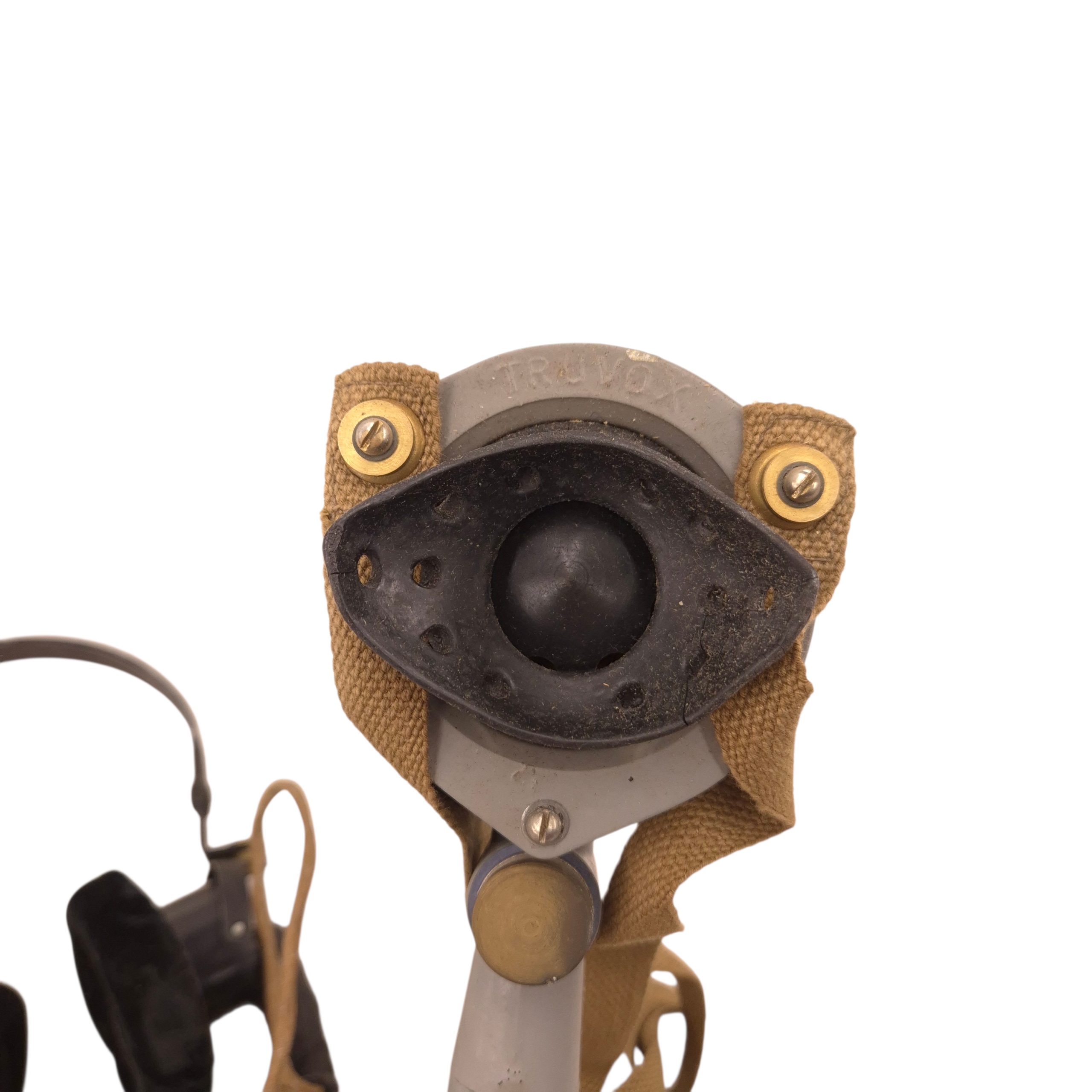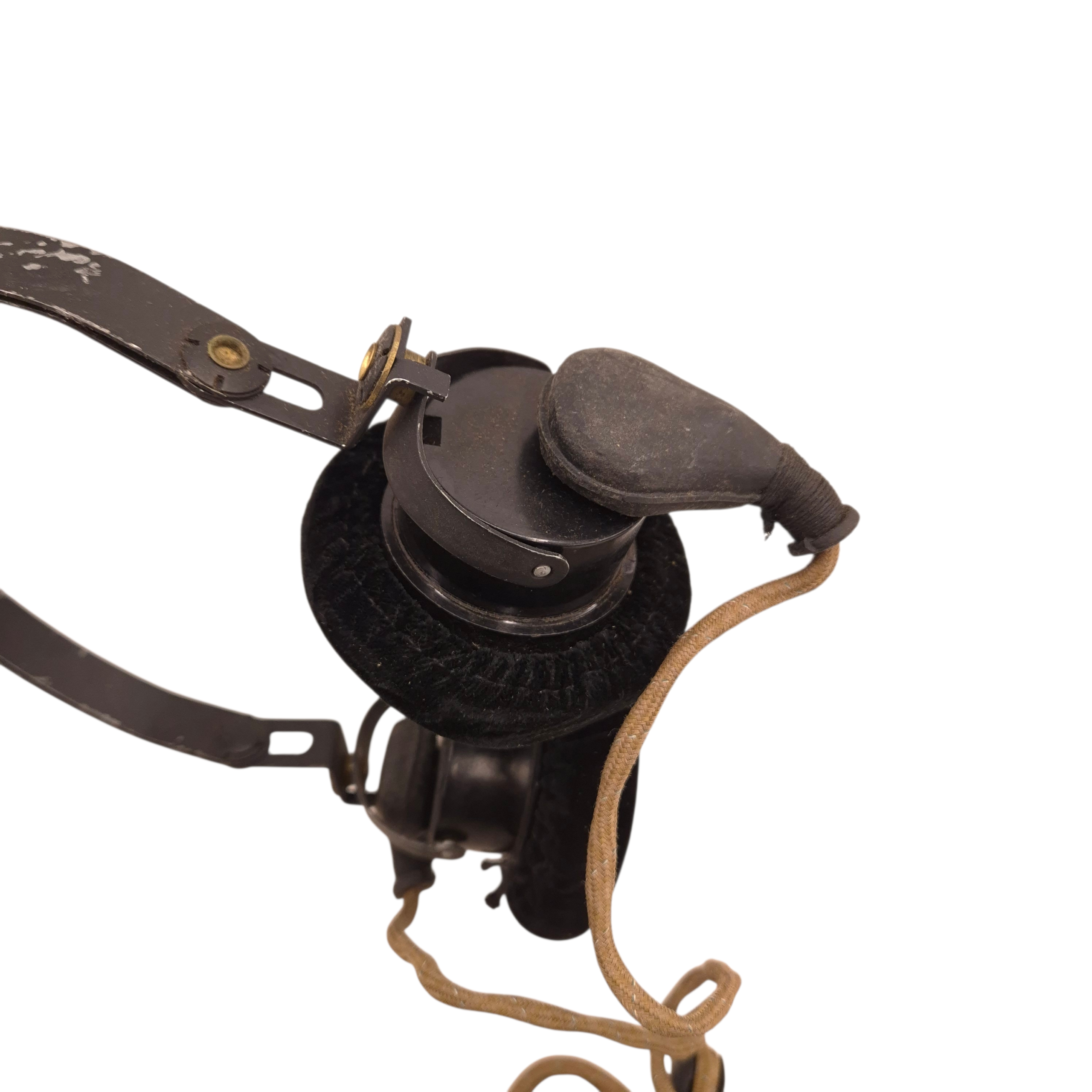 Original WWII British/Canadian headphones and microphone set in its original cardboard box, ZA-2905. The set is in unused condition. The microphone’s rubber mouthpiece is in good condition, somewhat dry as a result of long storage, complete set. Comes with its original plug. Used by tank crews and radio operators. We recently discovered a crate dated 1944 that still contains the headphones.