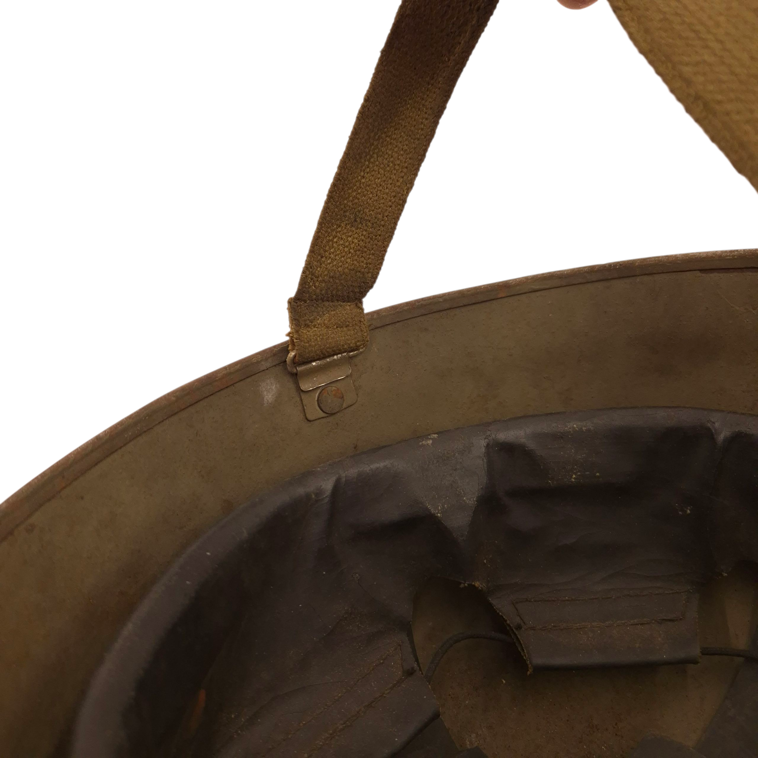 Original WWII British (Canadian) RAC helmet with a second layer of dark green/black paint. The liner is maker-marked BMB and dated 1940. The helmet retains its original chinstrap. A nice, honest example in good used condition.