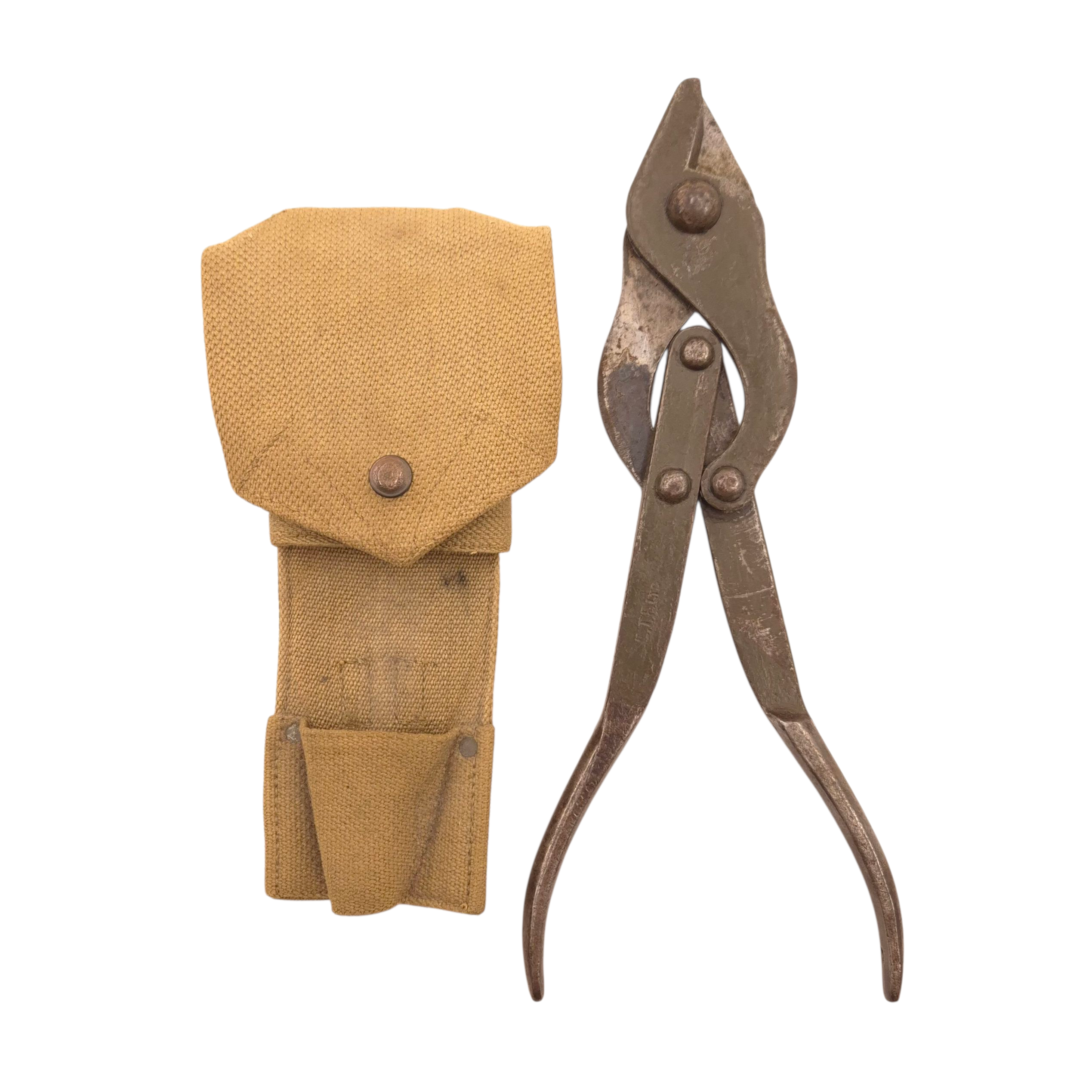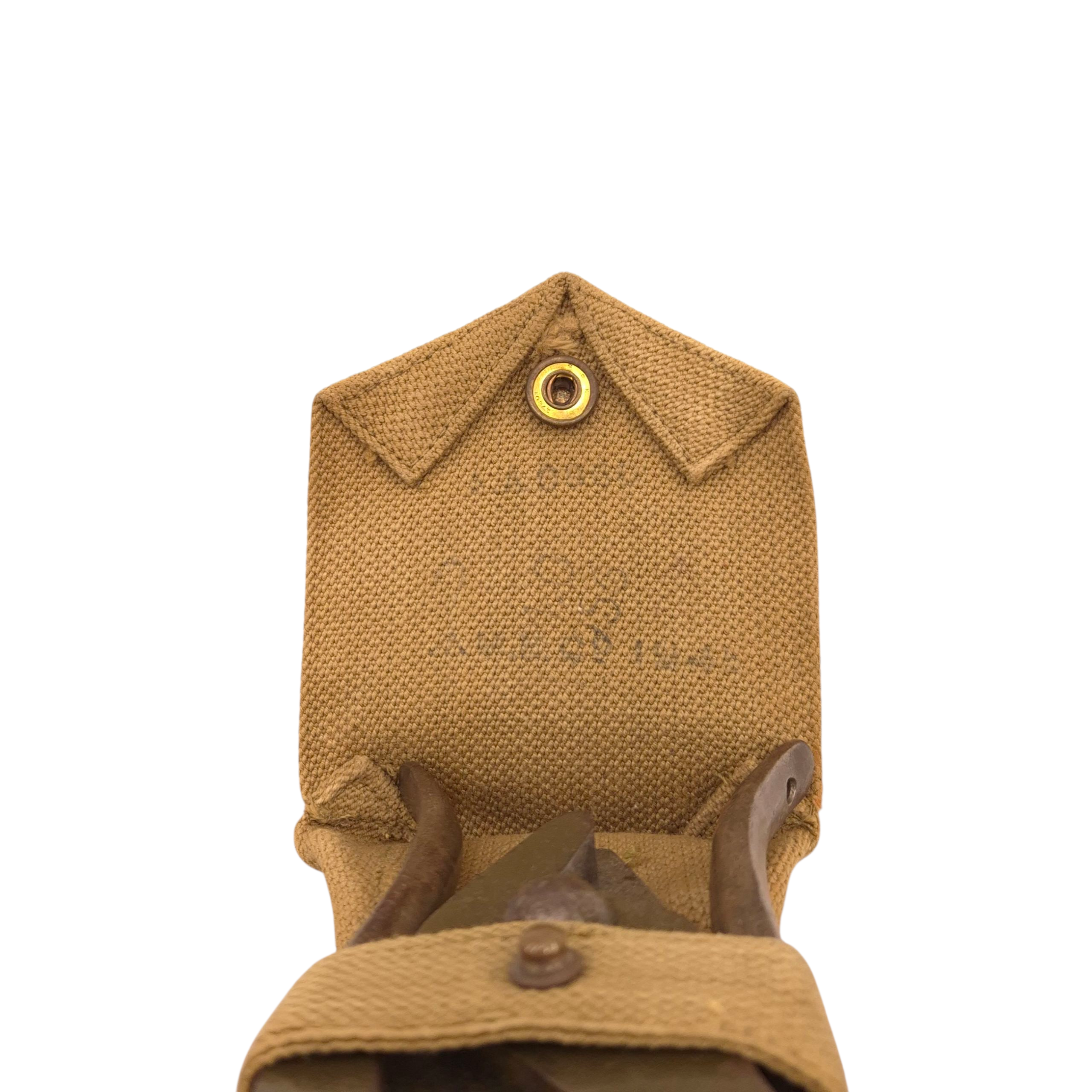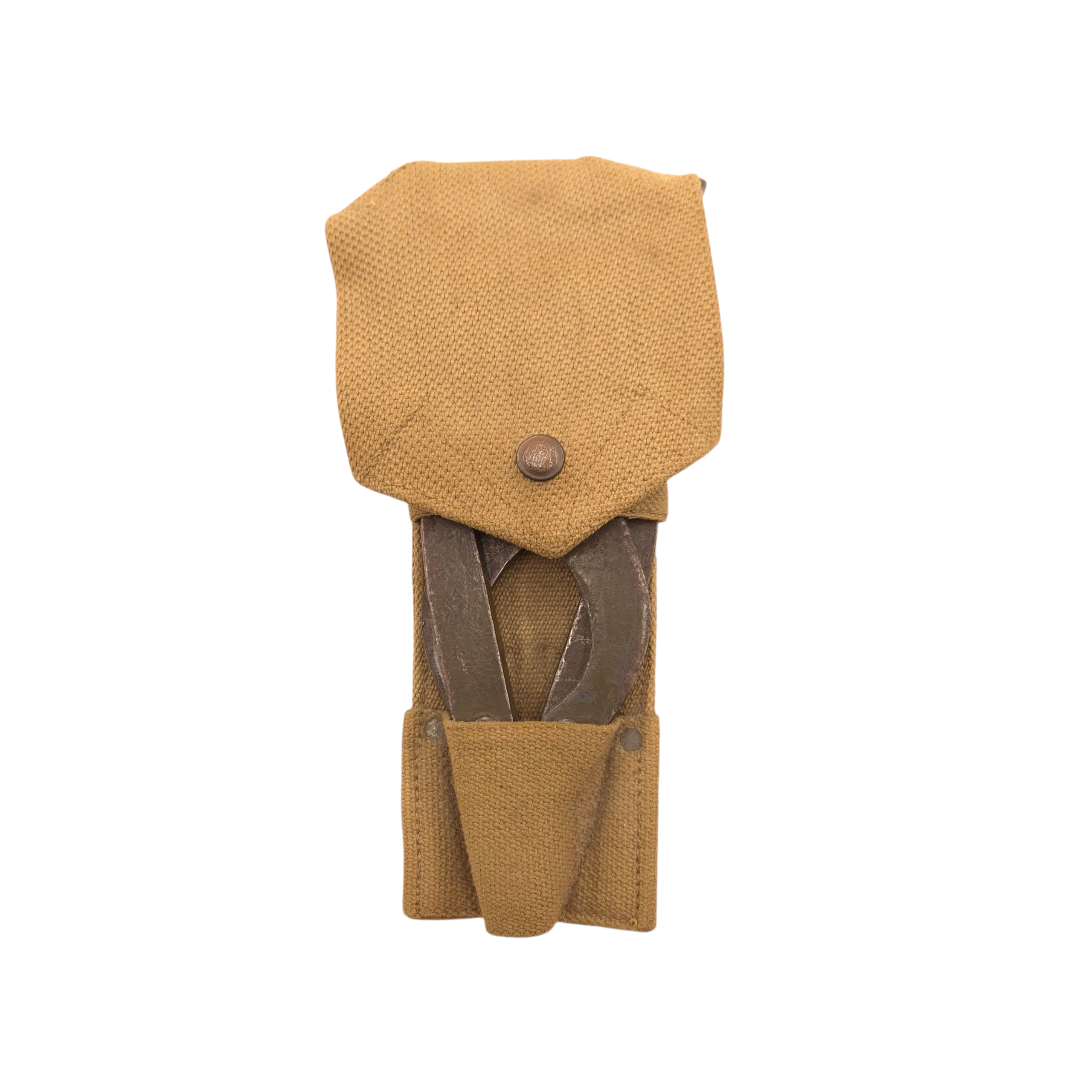 Original WWII British/Canadian issue wire cutter complete with its web carrying pouch. The wire cutter is C-broad arrow stamped and made by E.T.F. Ltd. The pouch’s maker marking is faint, but it is dated 1943. Both pieces remain in good condition.