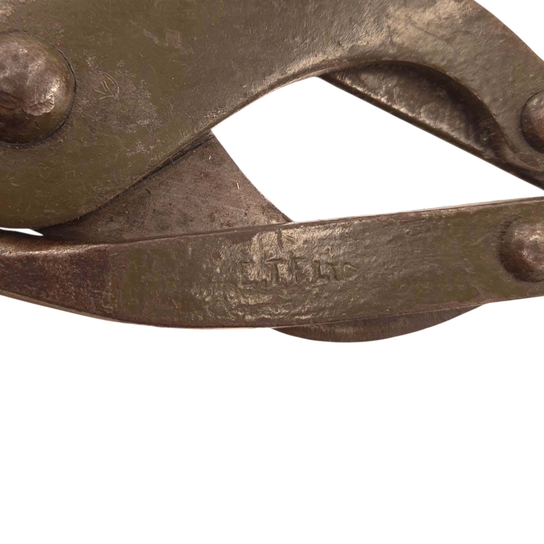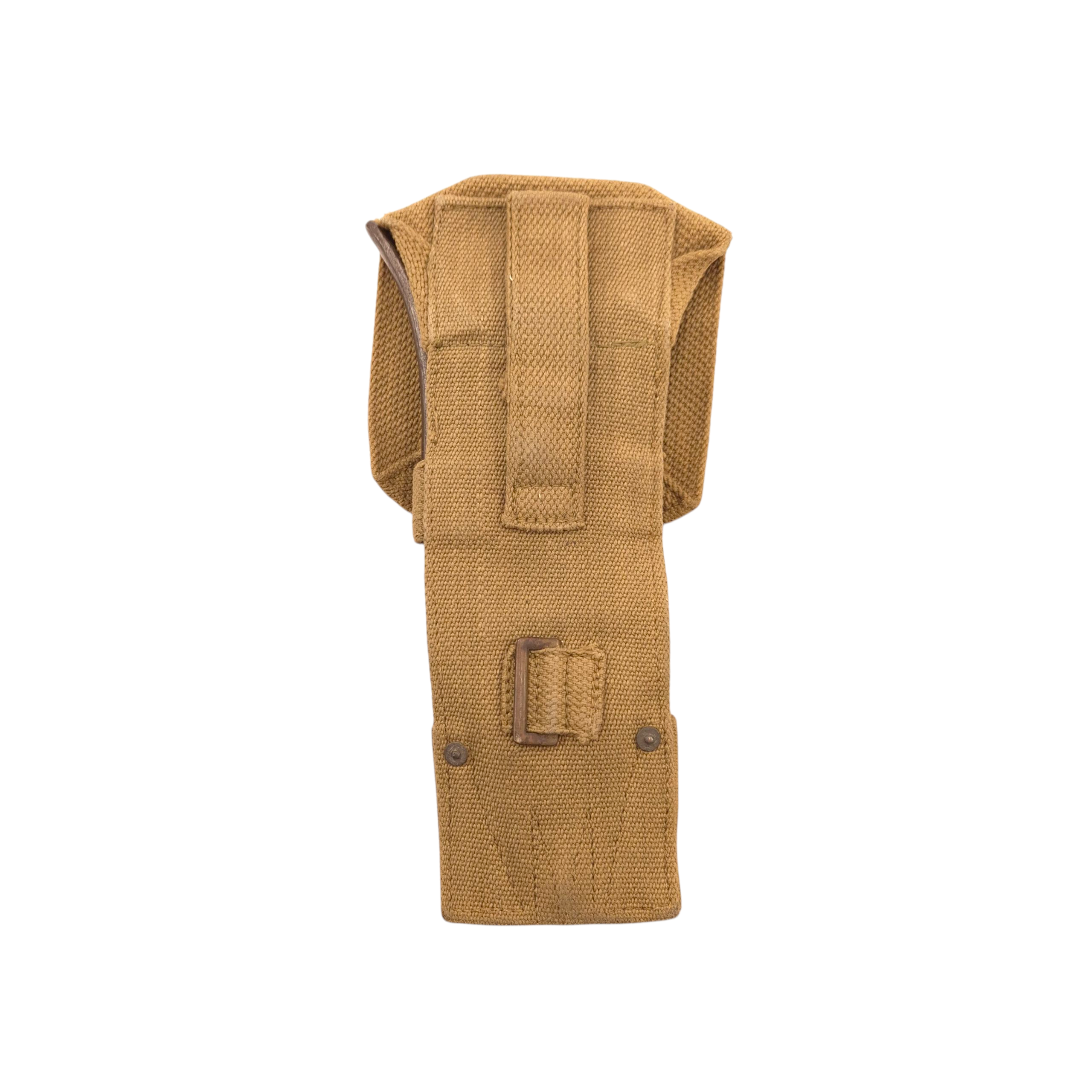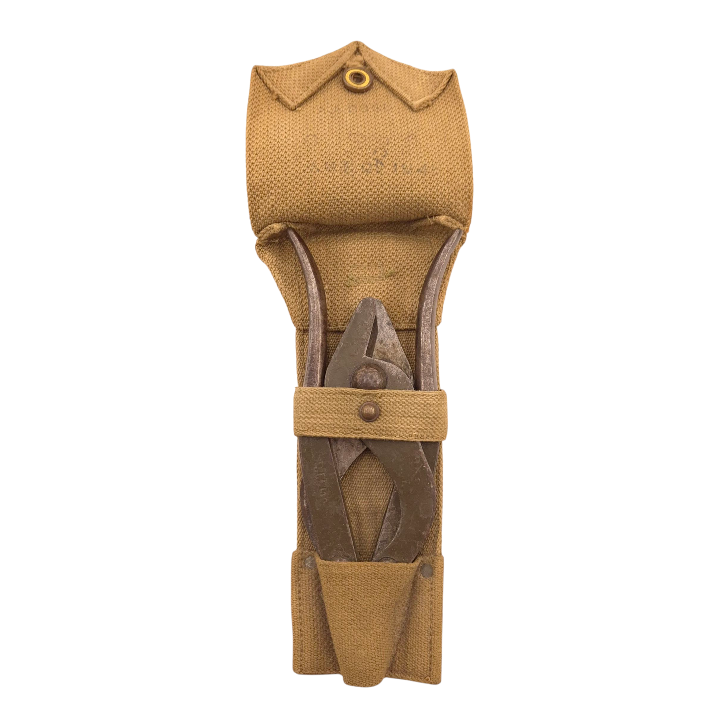 Original WWII British/Canadian issue wire cutter complete with its web carrying pouch. The wire cutter is C-broad arrow stamped and made by E.T.F. Ltd. The pouch’s maker marking is faint, but it is dated 1943. Both pieces remain in good condition.