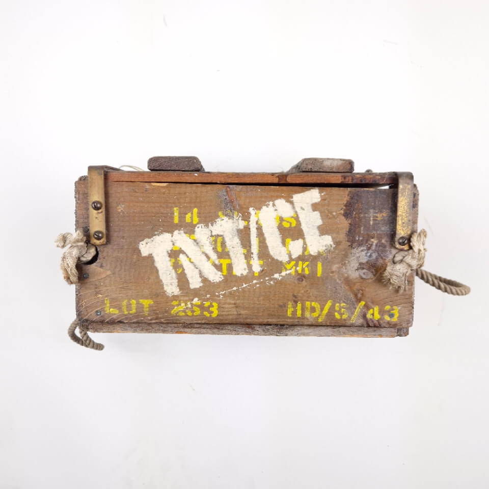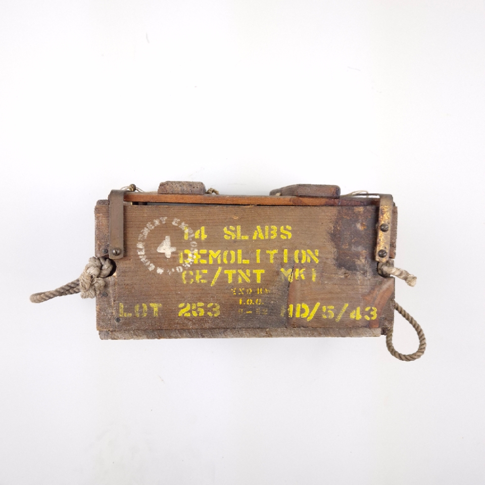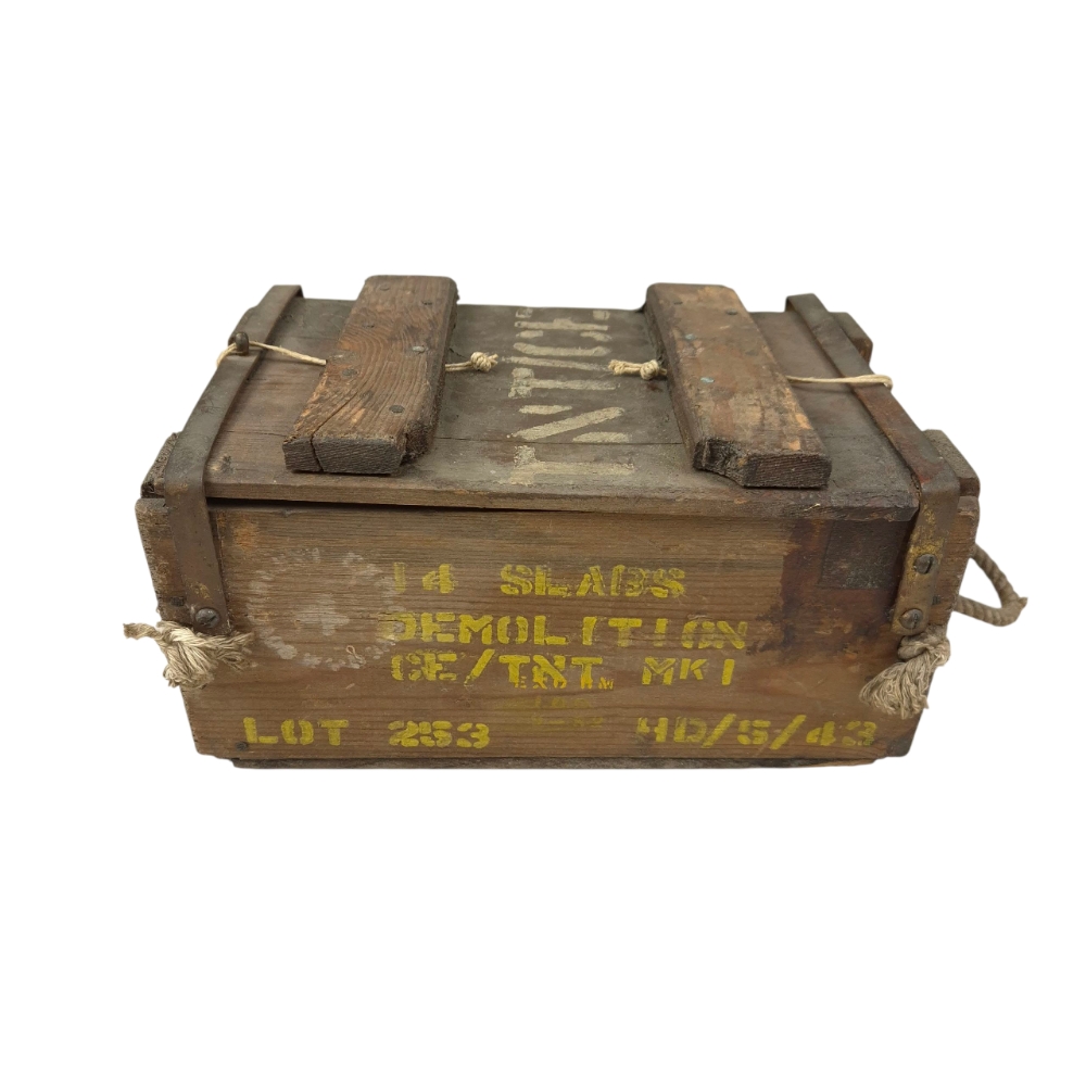 Original WWII British CE/TNT MkI wooden crate. The empty crate is dated May 1943, originally contained 14 “slabs” of CE/TNT MkI, which were issued to Demolition/Royal Engineer teams and also used by resistance and SOE. The CE (Composition Exploding) was apparently an integral fuse primer to detonate the TNT. The crate/box is 30cm long, 19cm wide and 16cm tall and very well-marked on all sides. The crate/box is in good condition. It has the cotter pin locks present.
