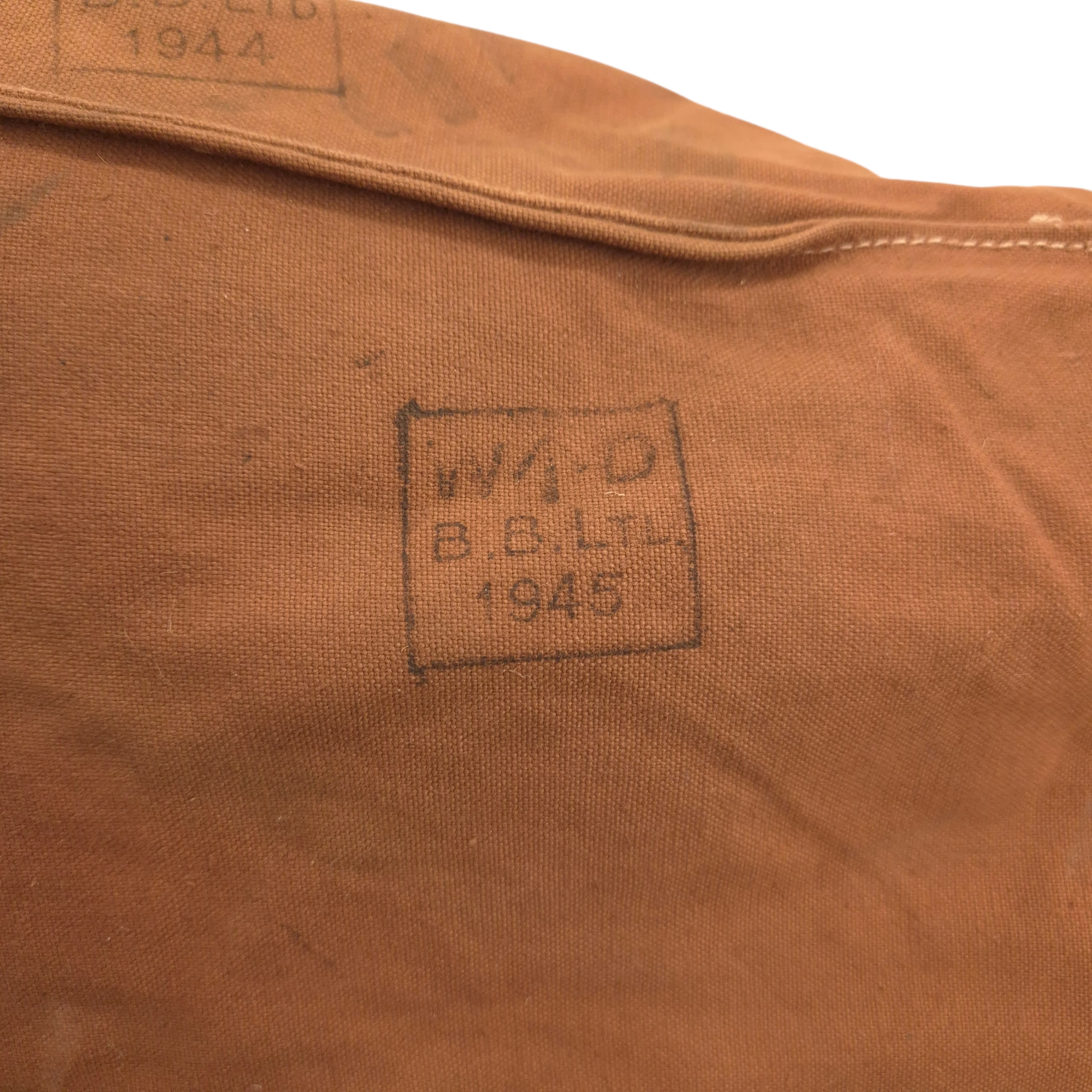 Original WWII British-made cushion, also used with the SOE jumpsuit. Made of strong khaki canvas and padded with horsehair. Maker-marked B.B. Ltd, stamped with the “War Department arrow,” and dated 1944 and a second stampmwith 1945. A scarce piece in good condition.