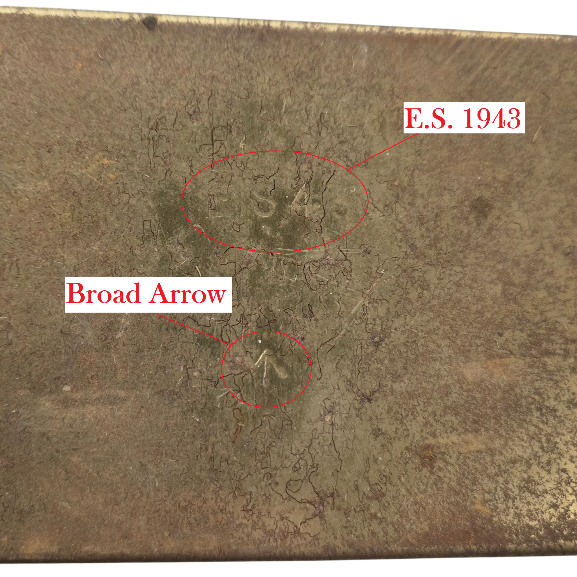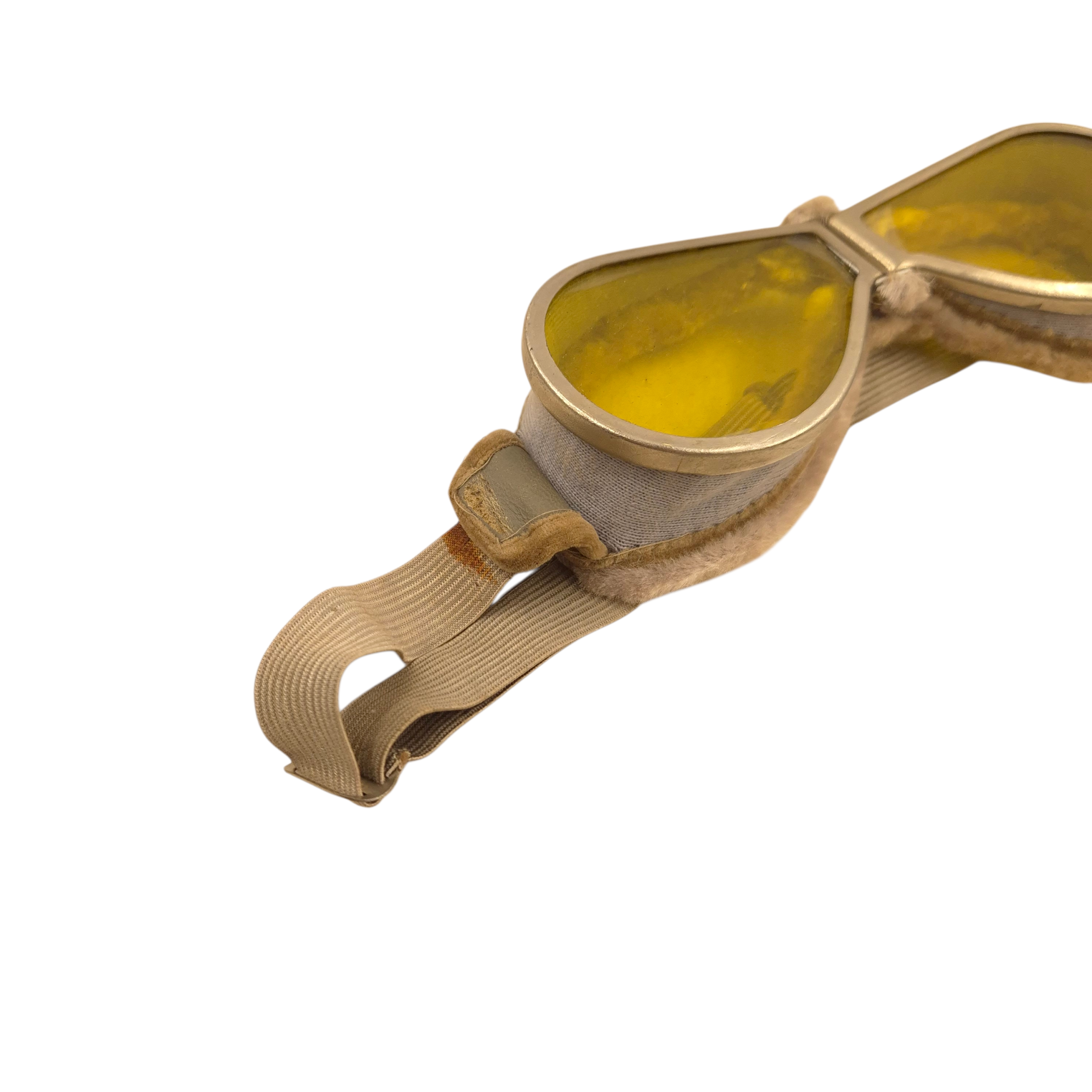 Original WWII British Goggles in metal box, dated 1943. These are standard-issue type dust goggles used by Dispatch Riders, Tank Crew Members, and other vehicle drivers. The goggles retain their original adjustable strap and are not maker-marked (as is typical), shows some traces from storage. They feature orange-tinted lenses for protection against sunlight. These goggle were worn by British, Polish and Canadian troops. Its original metal box is made by E.S. and dated 1943 with broad arrow, shows some rust.