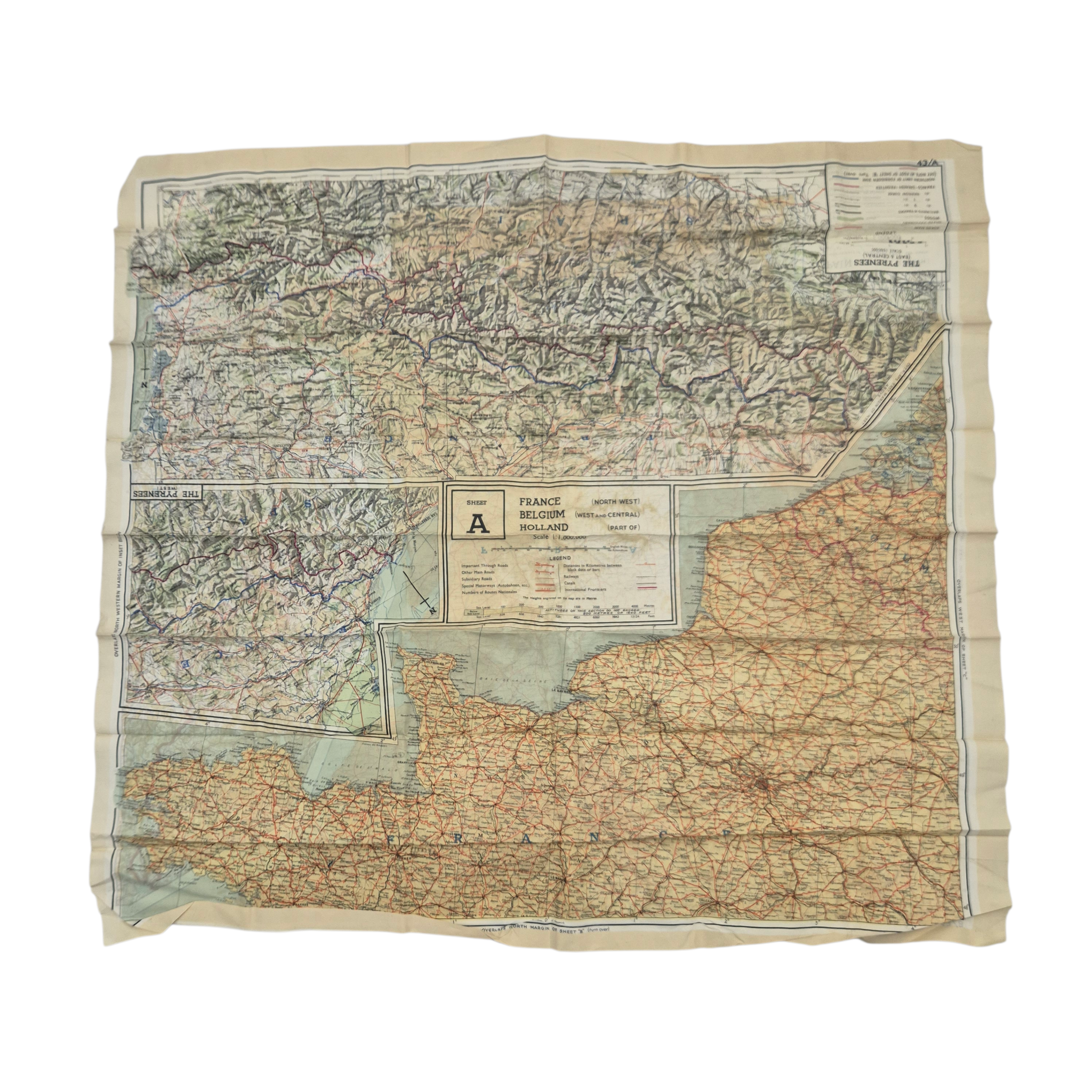 Original WWII British Escape & Evasion Silk Map, Europe, Sheets A & B. This is a scarce example, showing various areas: Sheet A – France, Belgium, and the Netherlands; Sheet B – German-Swiss border, France & Spain, and the Pyrenees. It could be folded and hide easily when captured and would stay readible when becoming wet. Overall in good, clean condition.