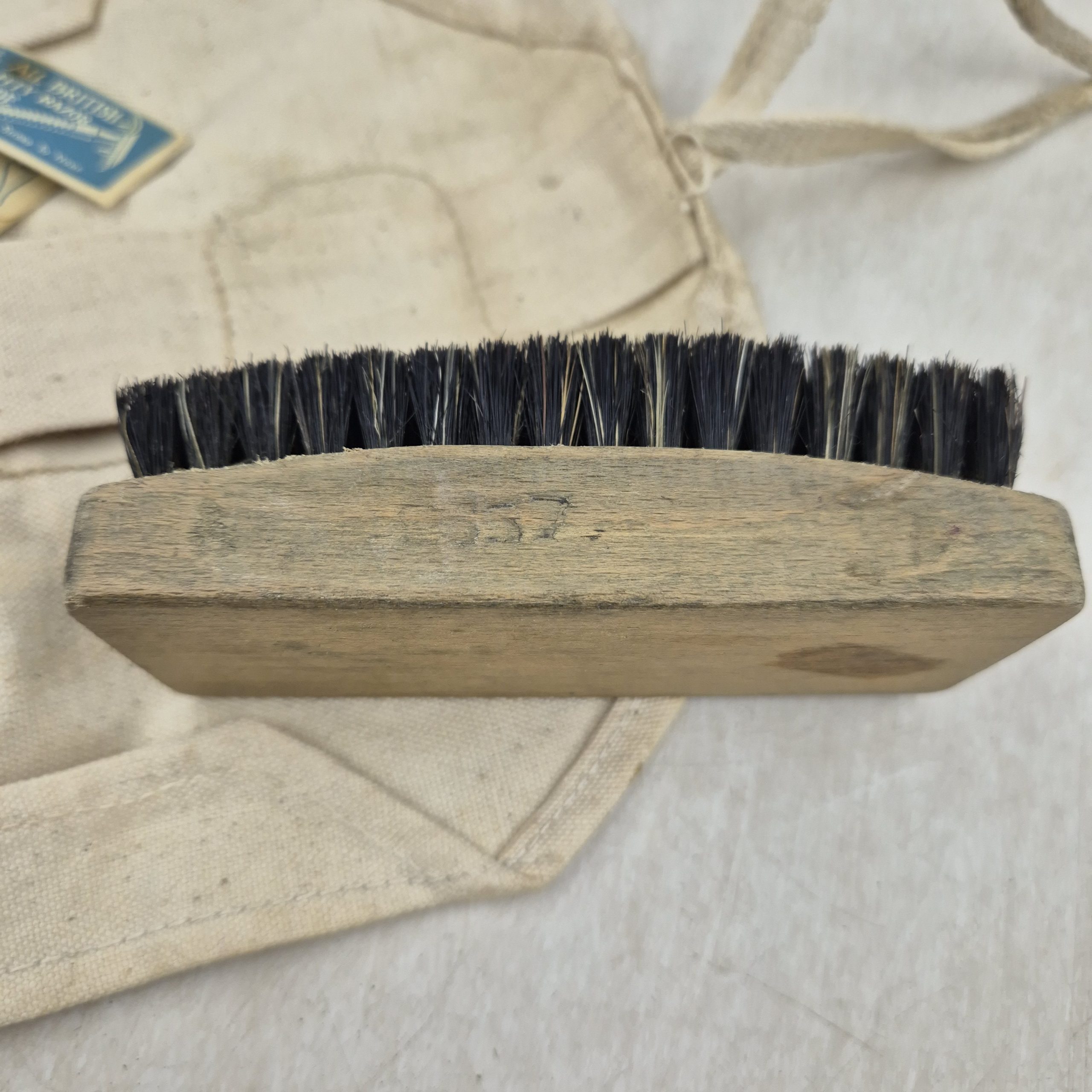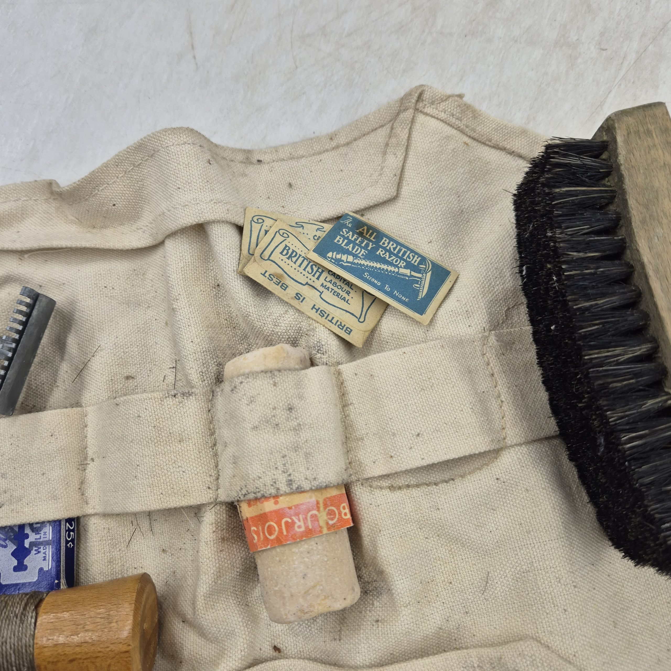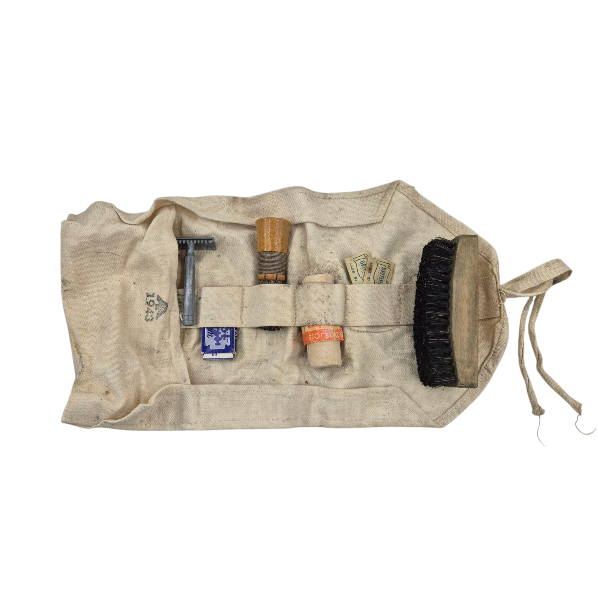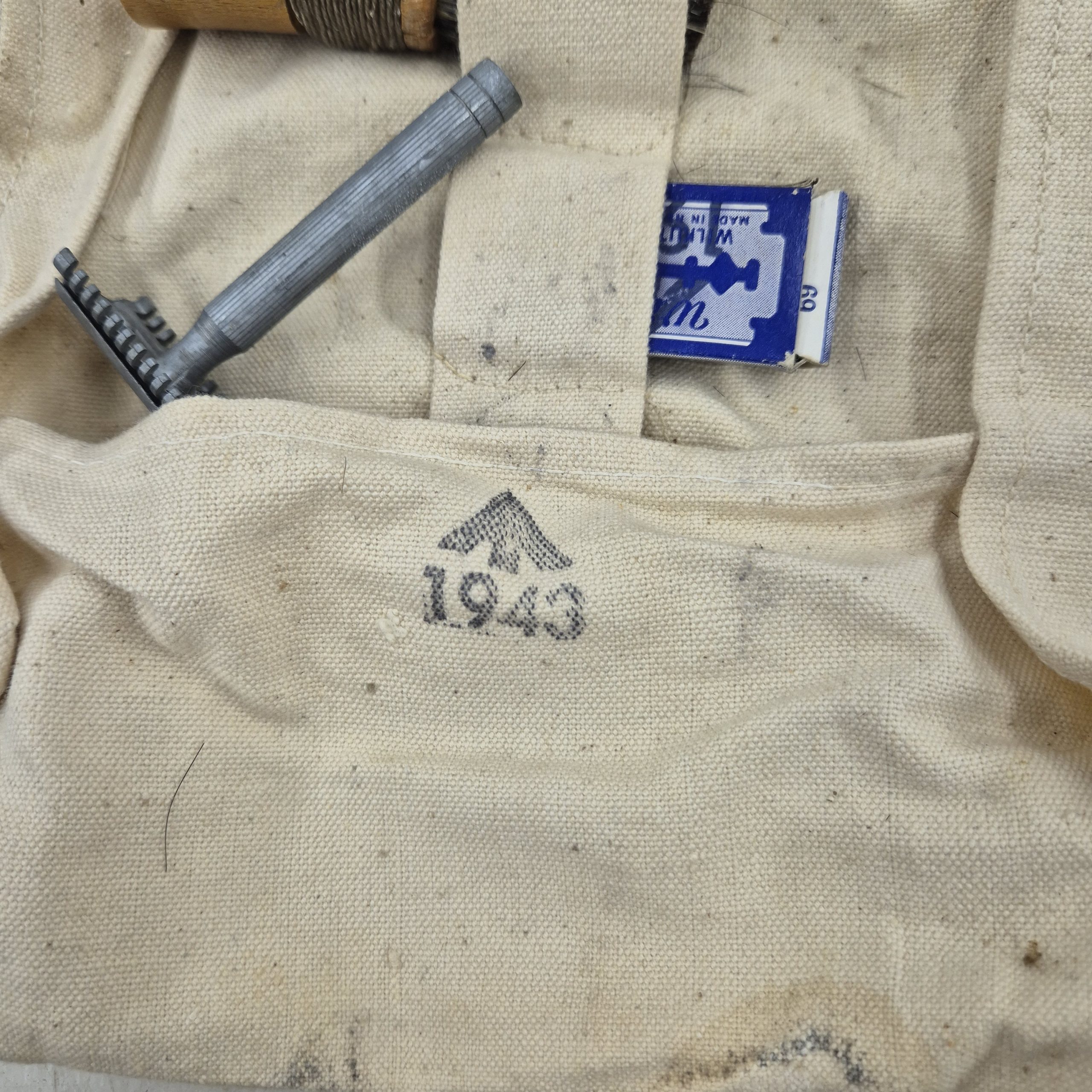 Original WWII British Holdall. The holdall contains a soap stick, a brush, razor blades, and a shaving brush dated 1940. The holdall is used, dated 1943 with broad arrow.