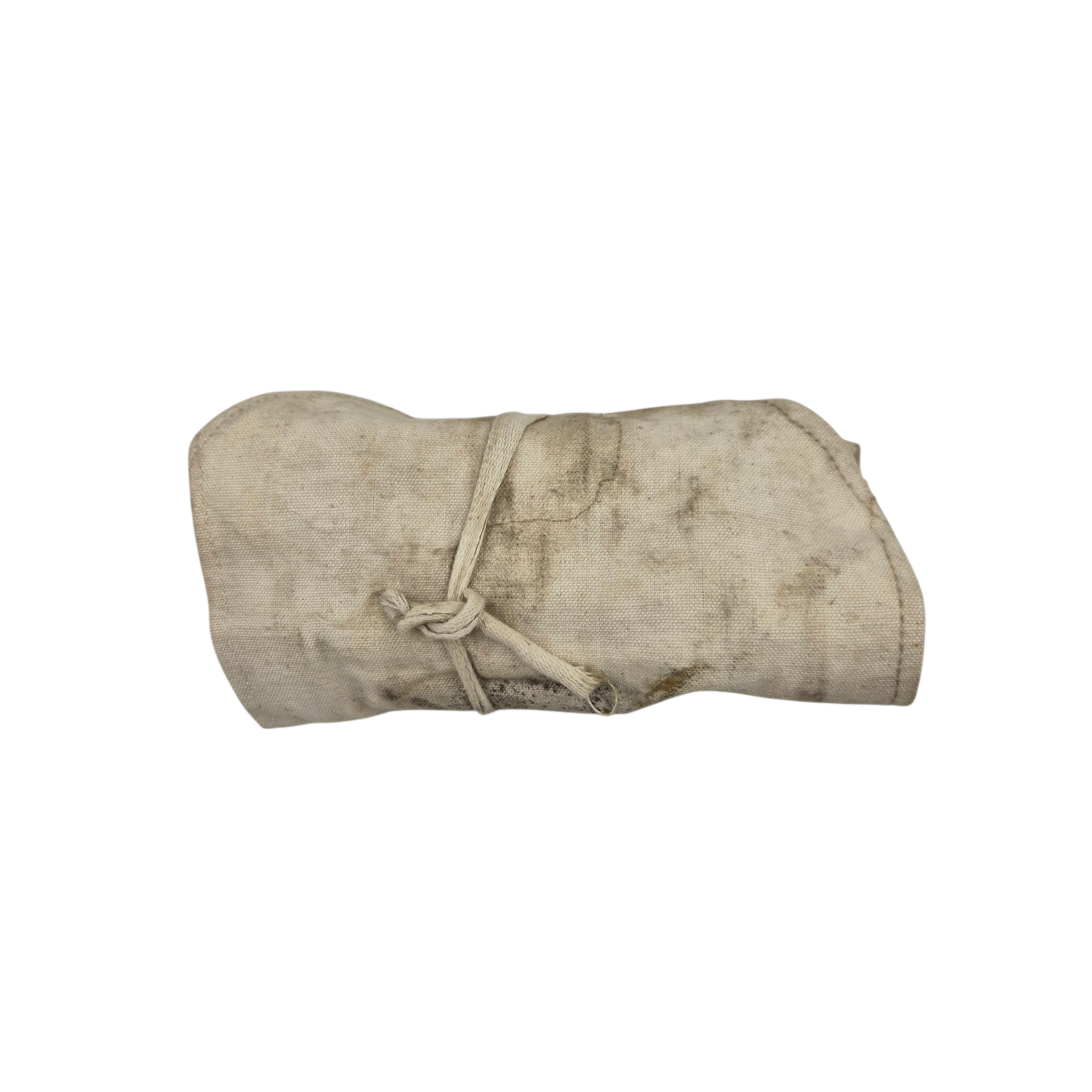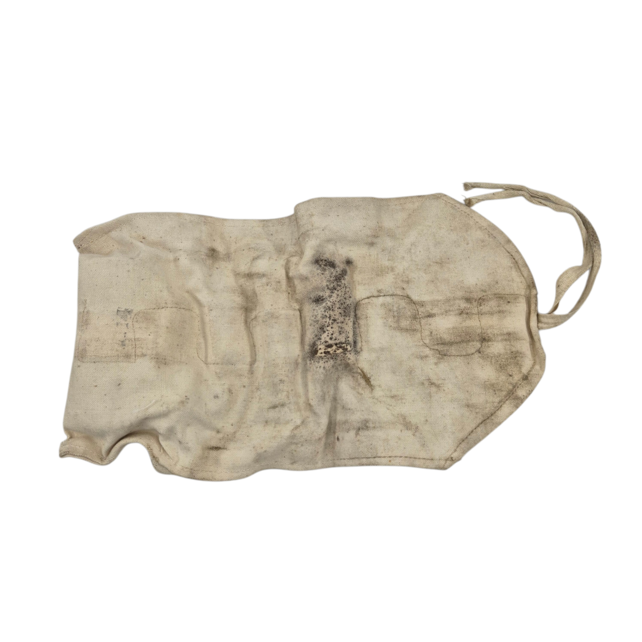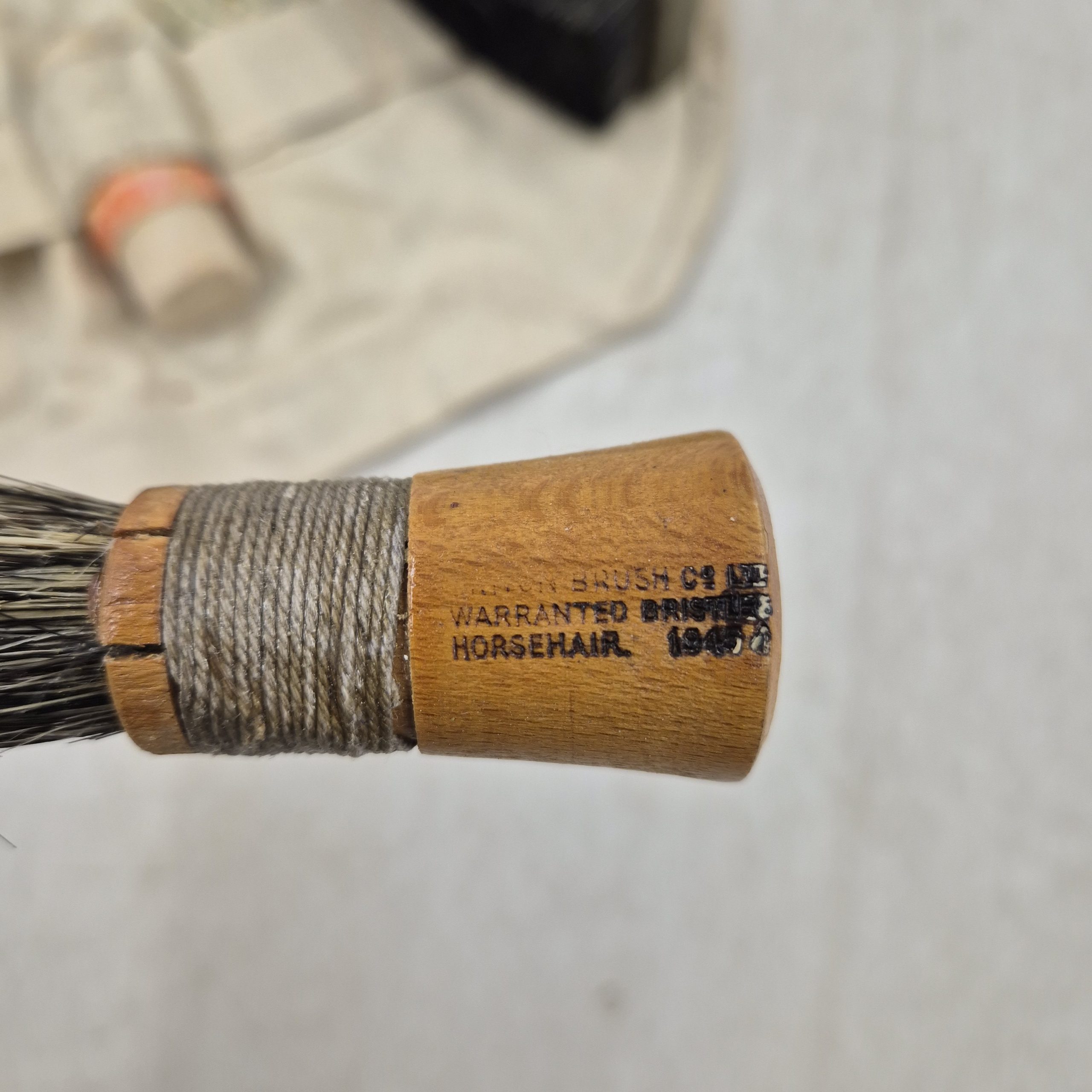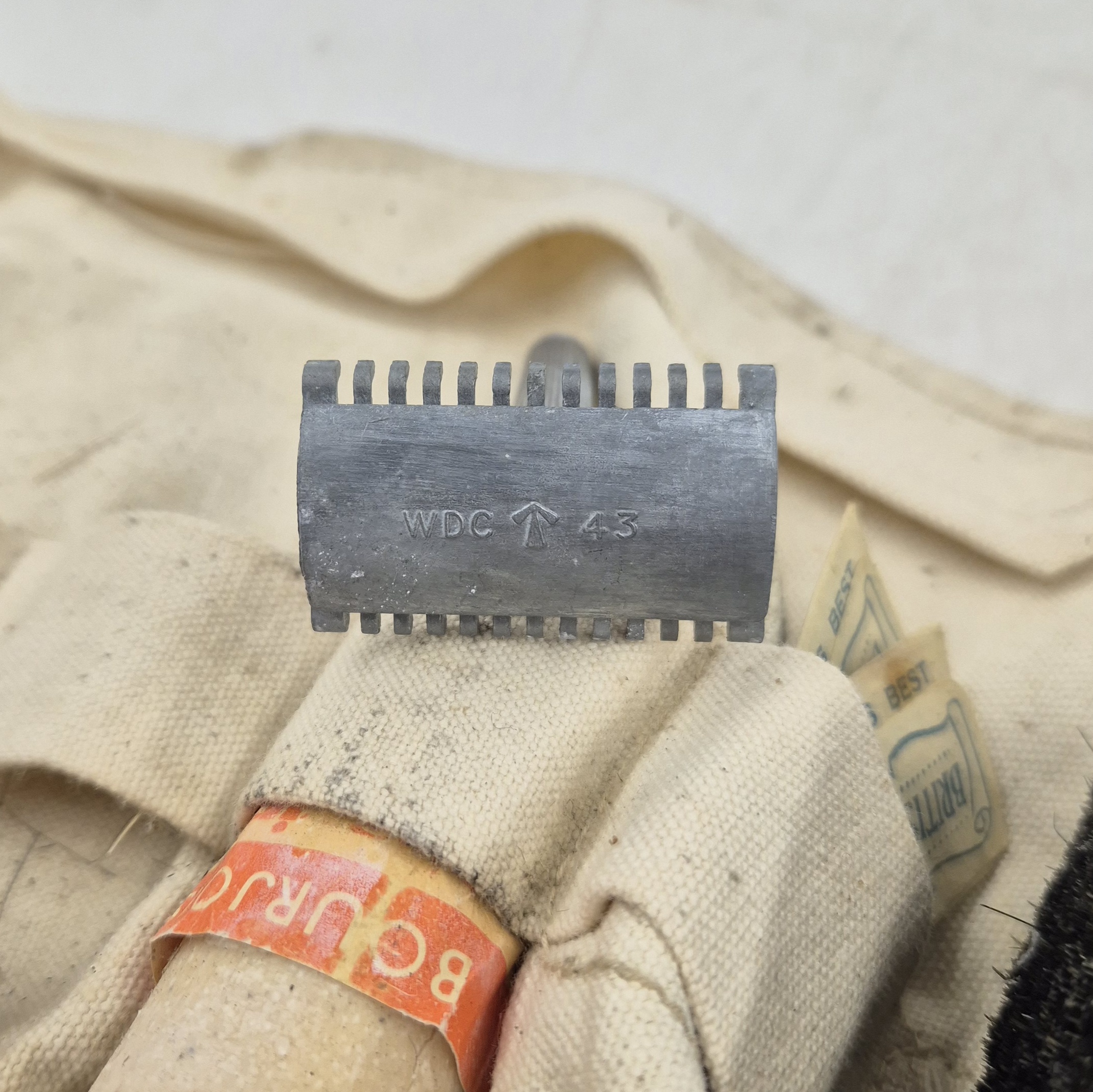 Original WWII British Holdall. The holdall contains a soap stick, a brush, razor blades, and a shaving brush dated 1940. The holdall is used, dated 1943 with broad arrow.