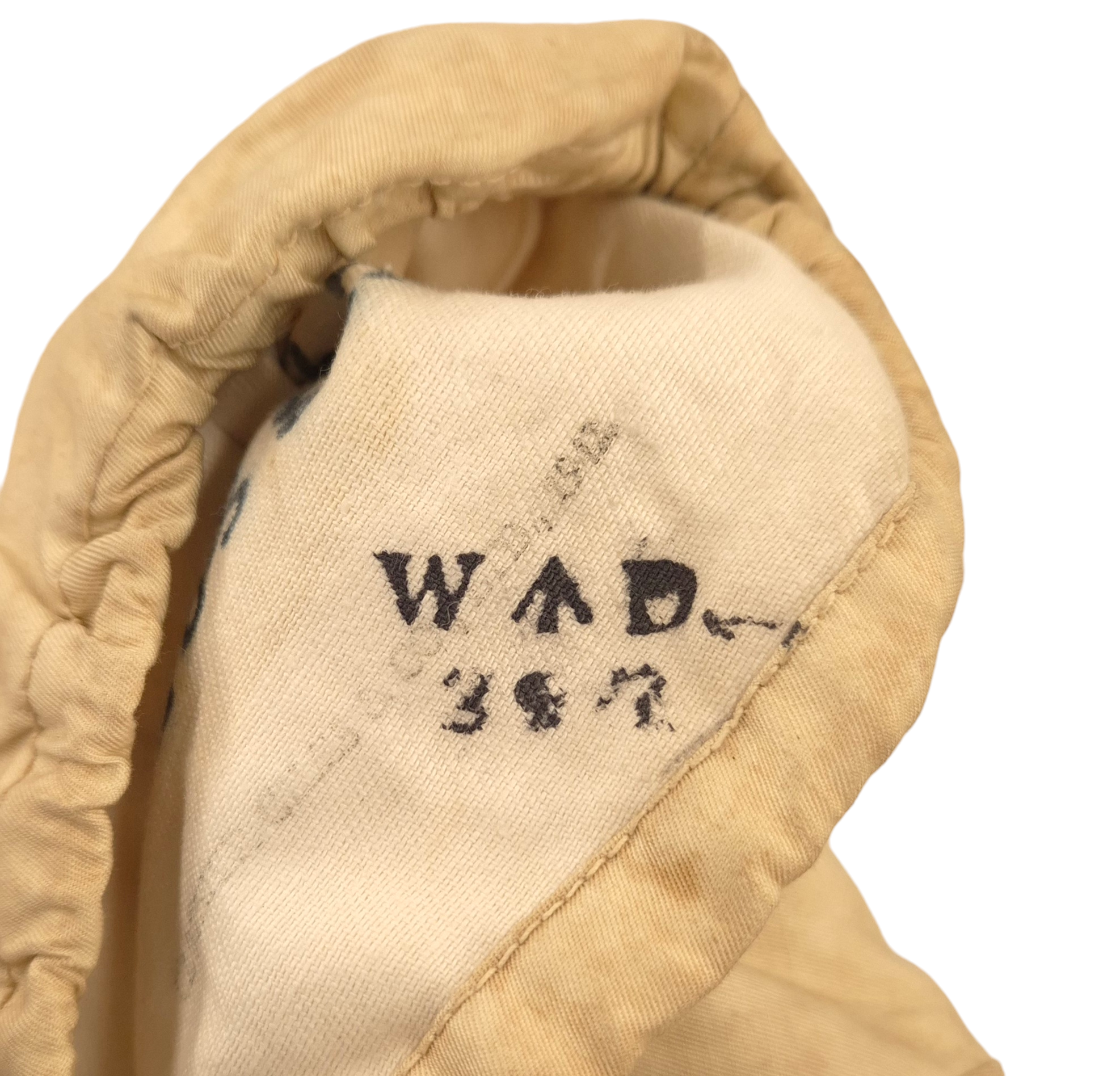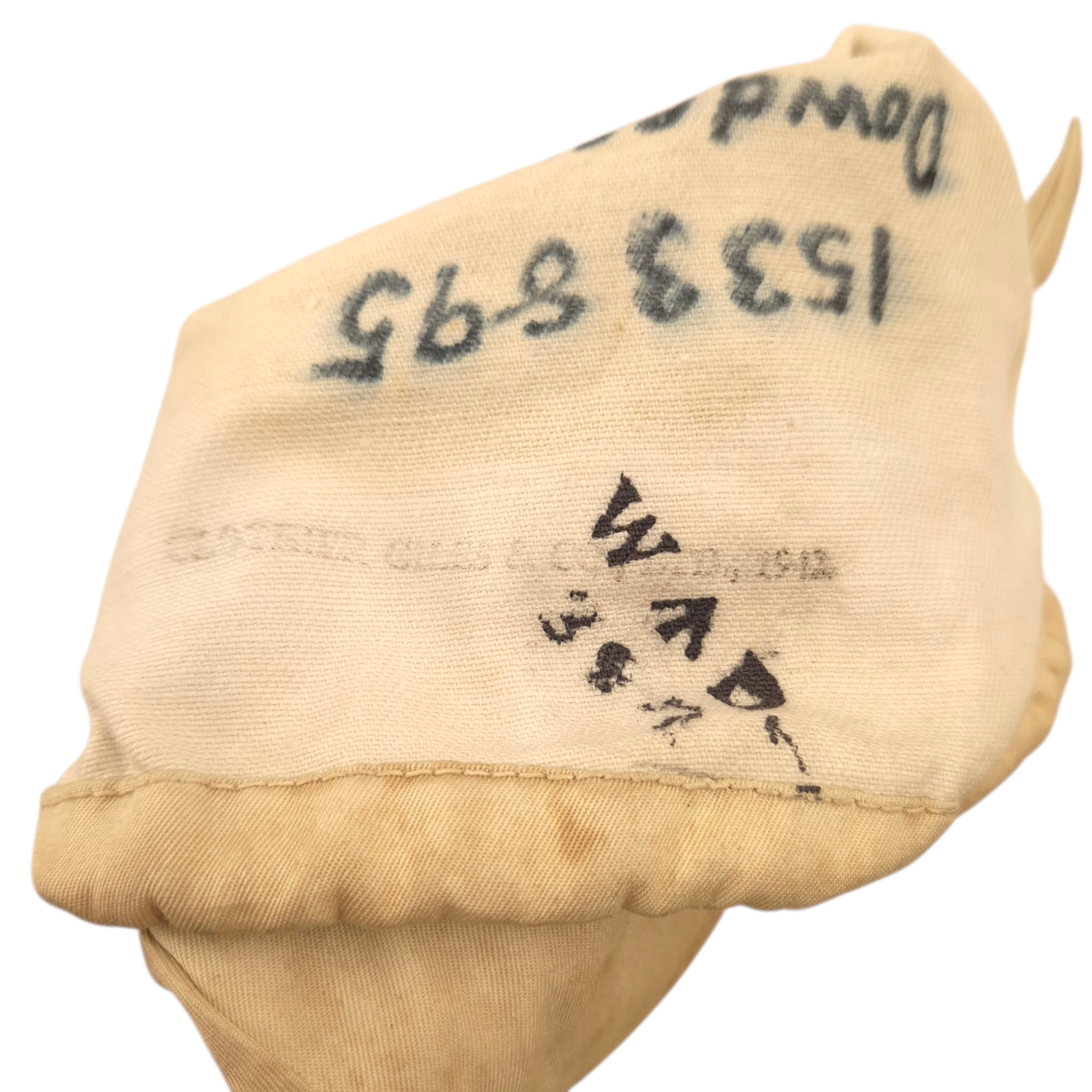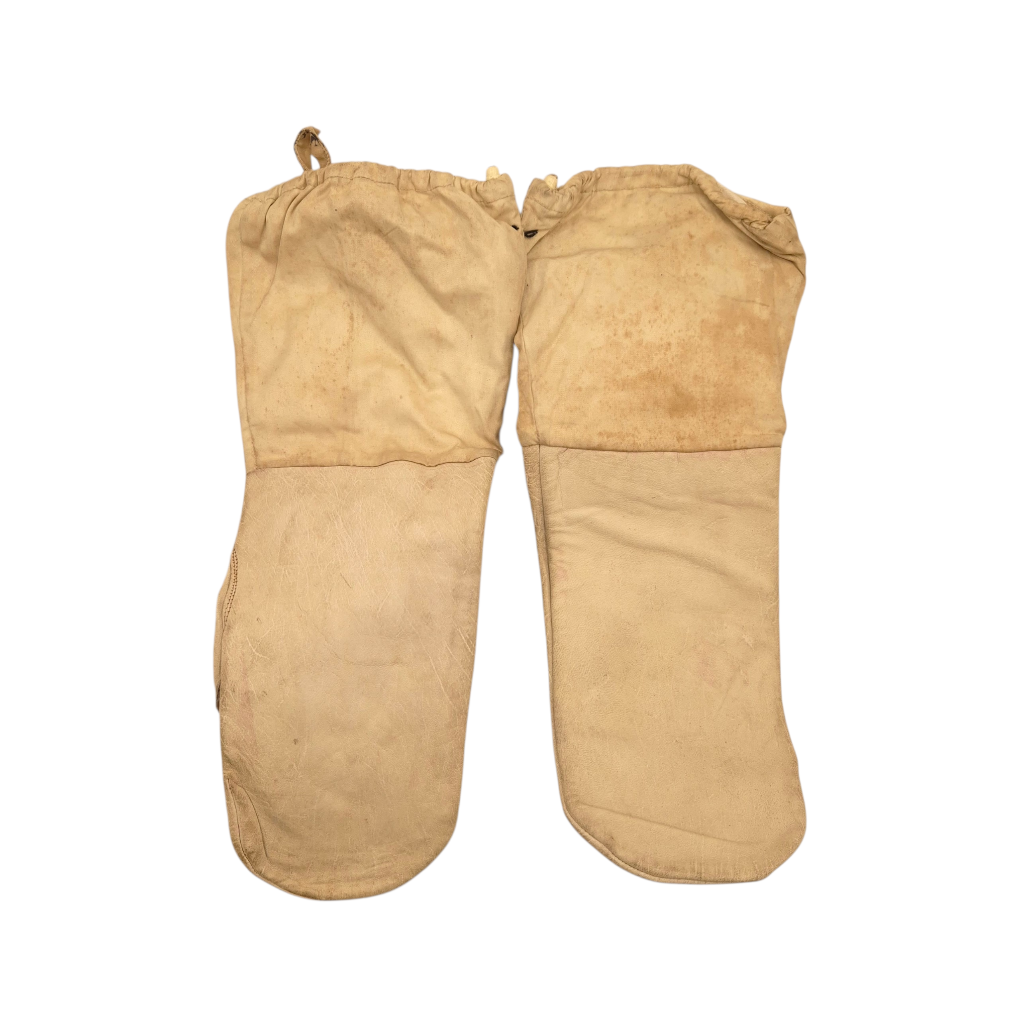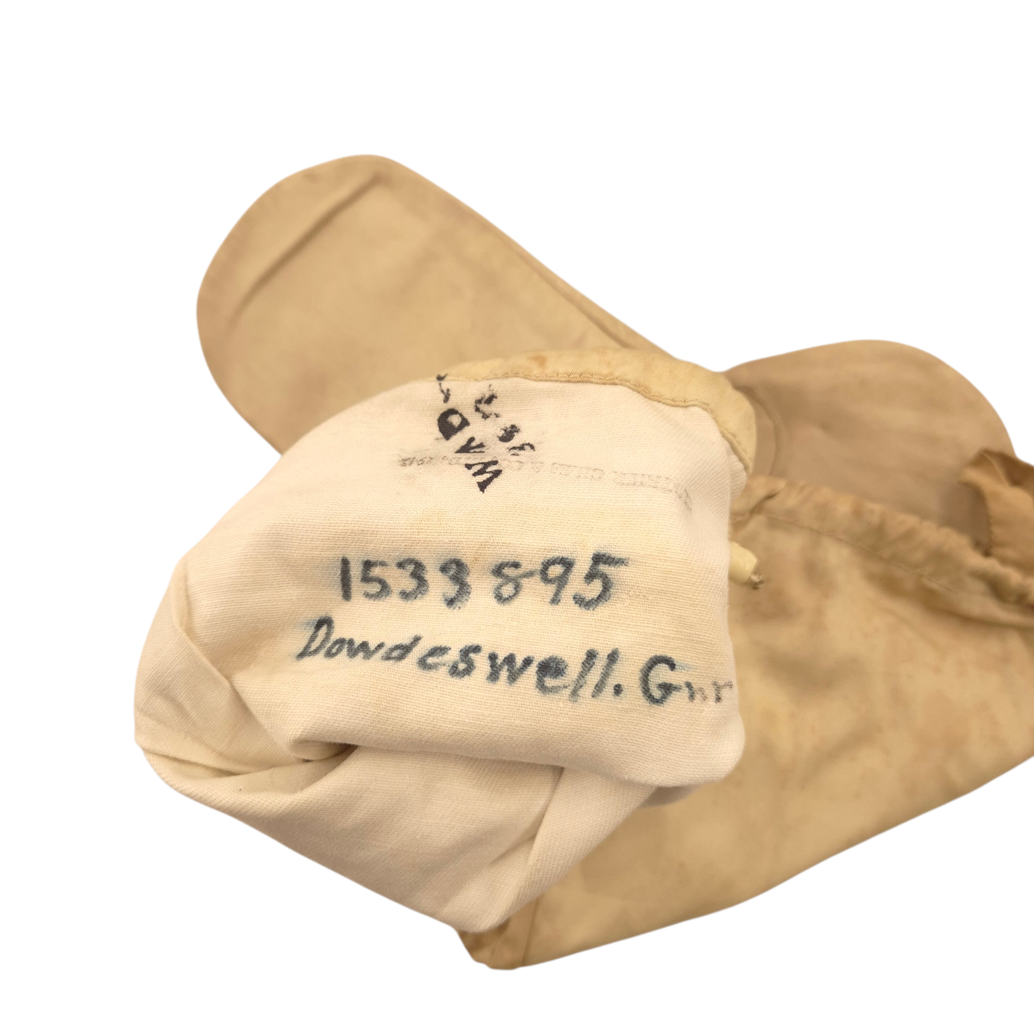 Original WWII British Issue Winter Gloves. Leather tops with material gauntlet style bottoms with each glove connected with a long material retaining strap. Both well maker marked to the interiors, dated 1942 with a WD stamp. Named to Gunner Dowdeswell, 1533895. In excellent and unused condition.