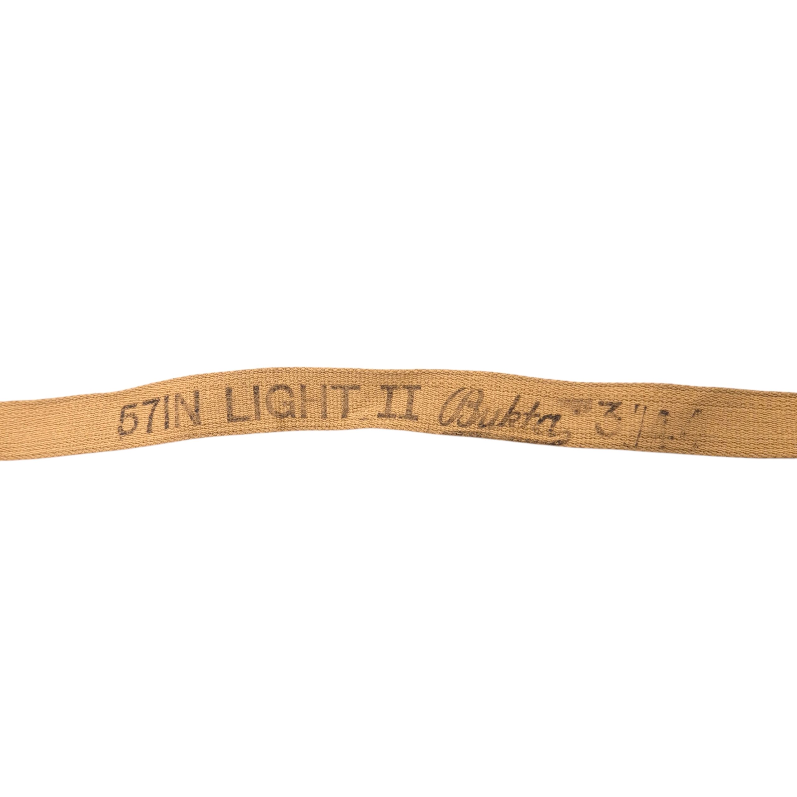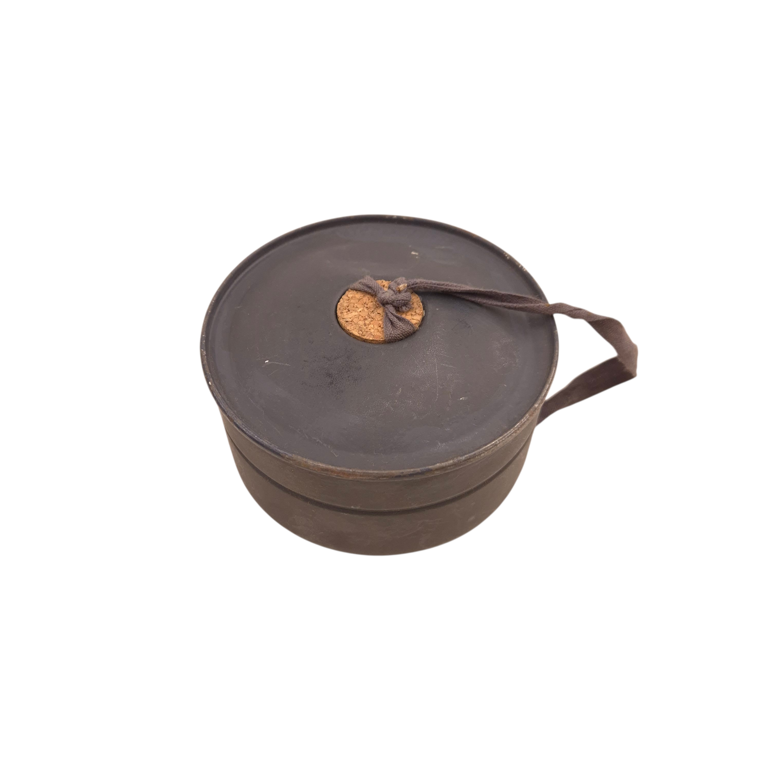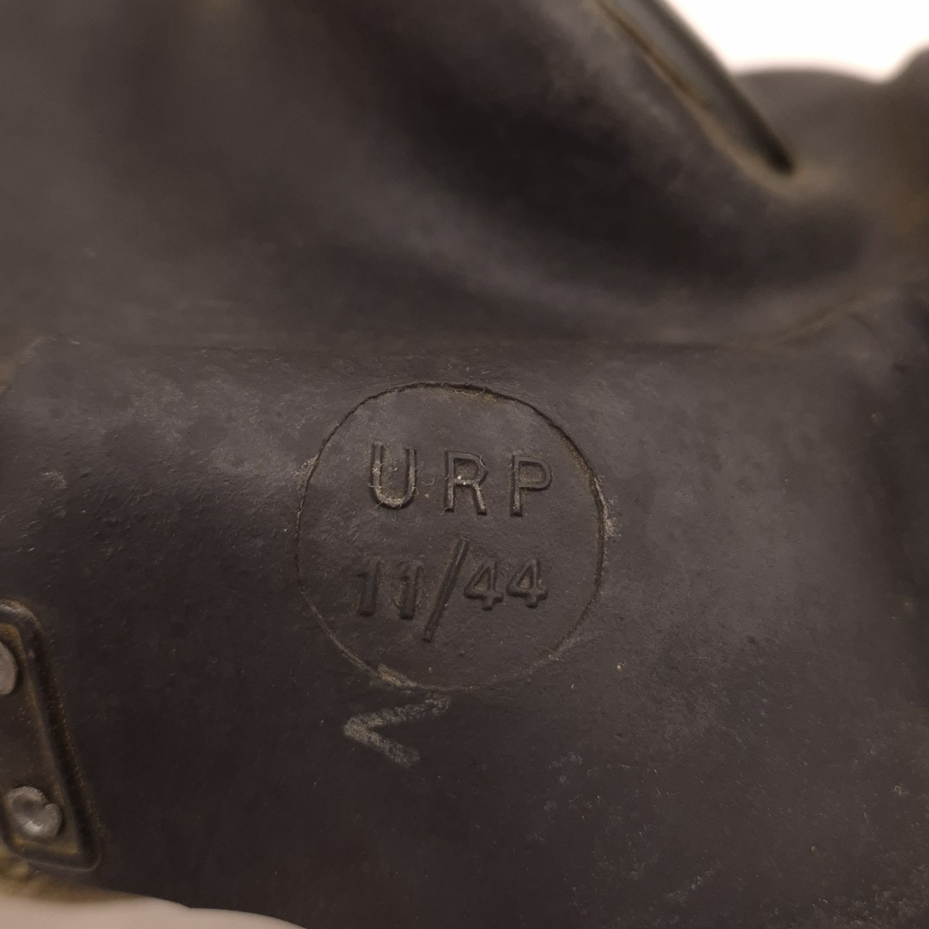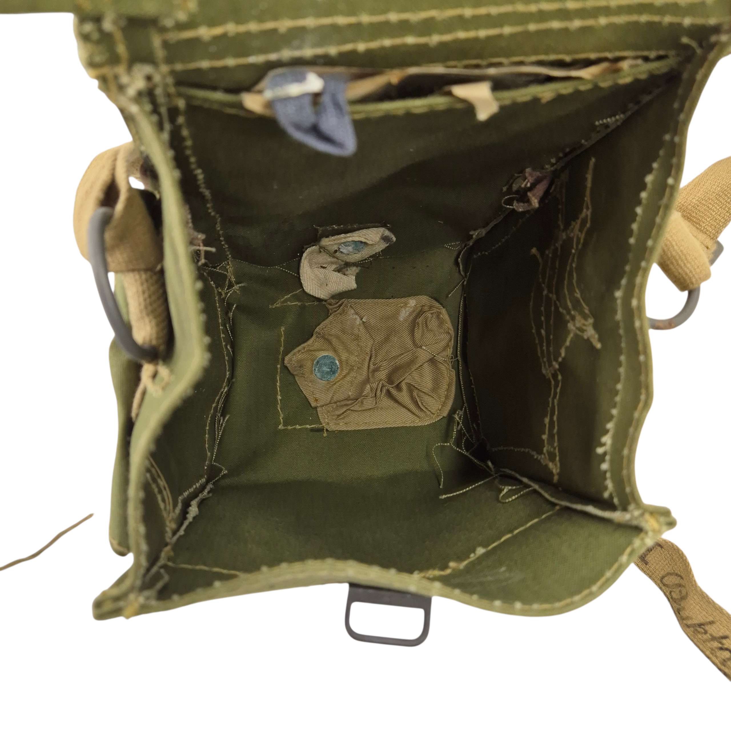 Original WWII British Light Respirator Set. An excellent example of a Light Respirator Set, consisting of the carrying bag with its carrying strap, the respirator with filter, and cord. The rubber respirator is dated 1944. The filter, dated May 1944, retains its original cork plug and also bears the Broad Arrow marking. The Light Mk II carrying bag, manufactured by ‘BUKTA’ in March 1944, shows honest field wear consistent with service use; the carrying sling is also very nicely stamped.