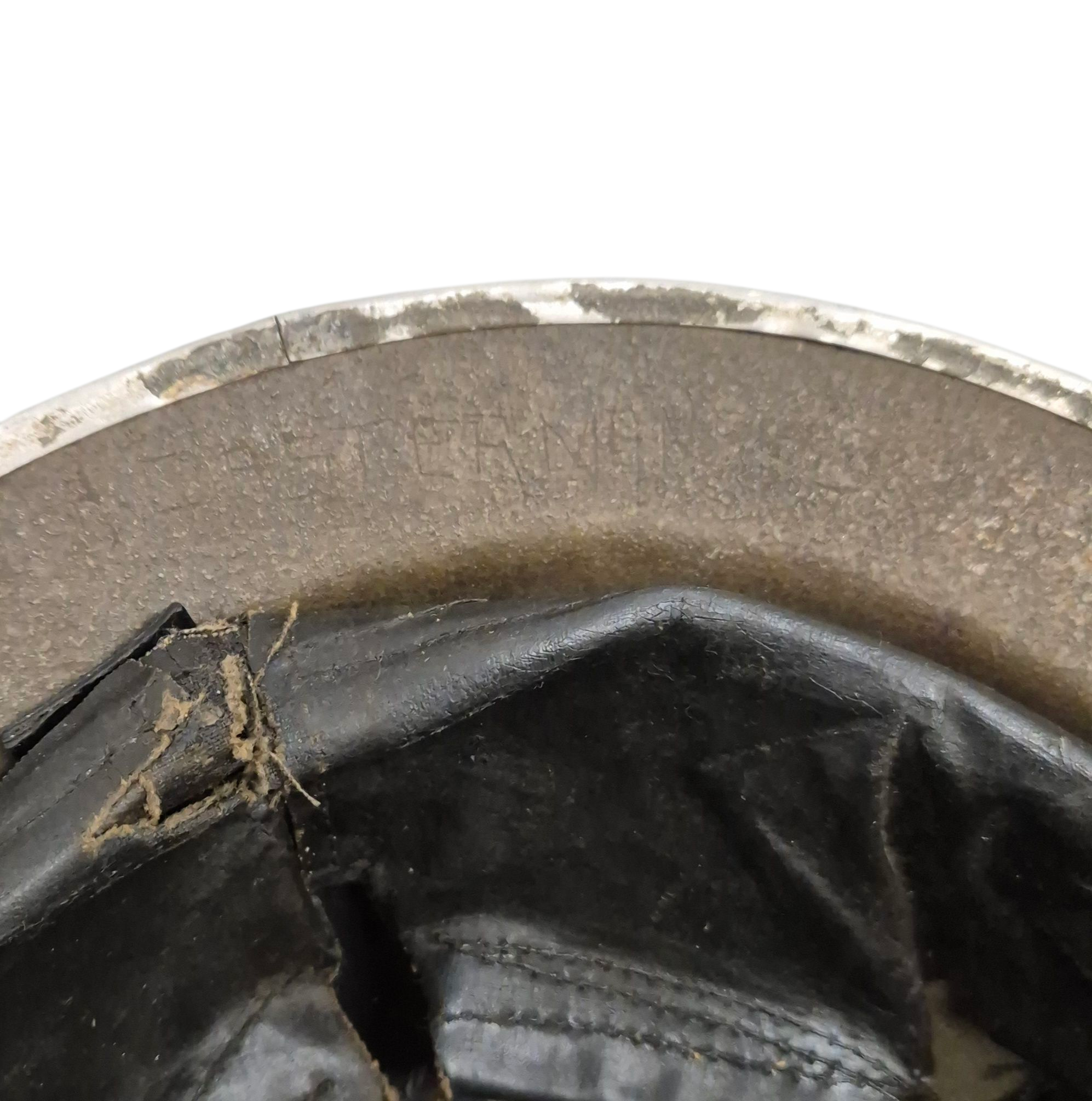 Original WWII British MkII Helmet. At some point, the helmet had a decal applied, which has since been removed. The interior bears a soldier’s name. The liner, made by T.T.C., is also in used condition and dated 1942. A solid and authentic wartime British Mk II helmet.