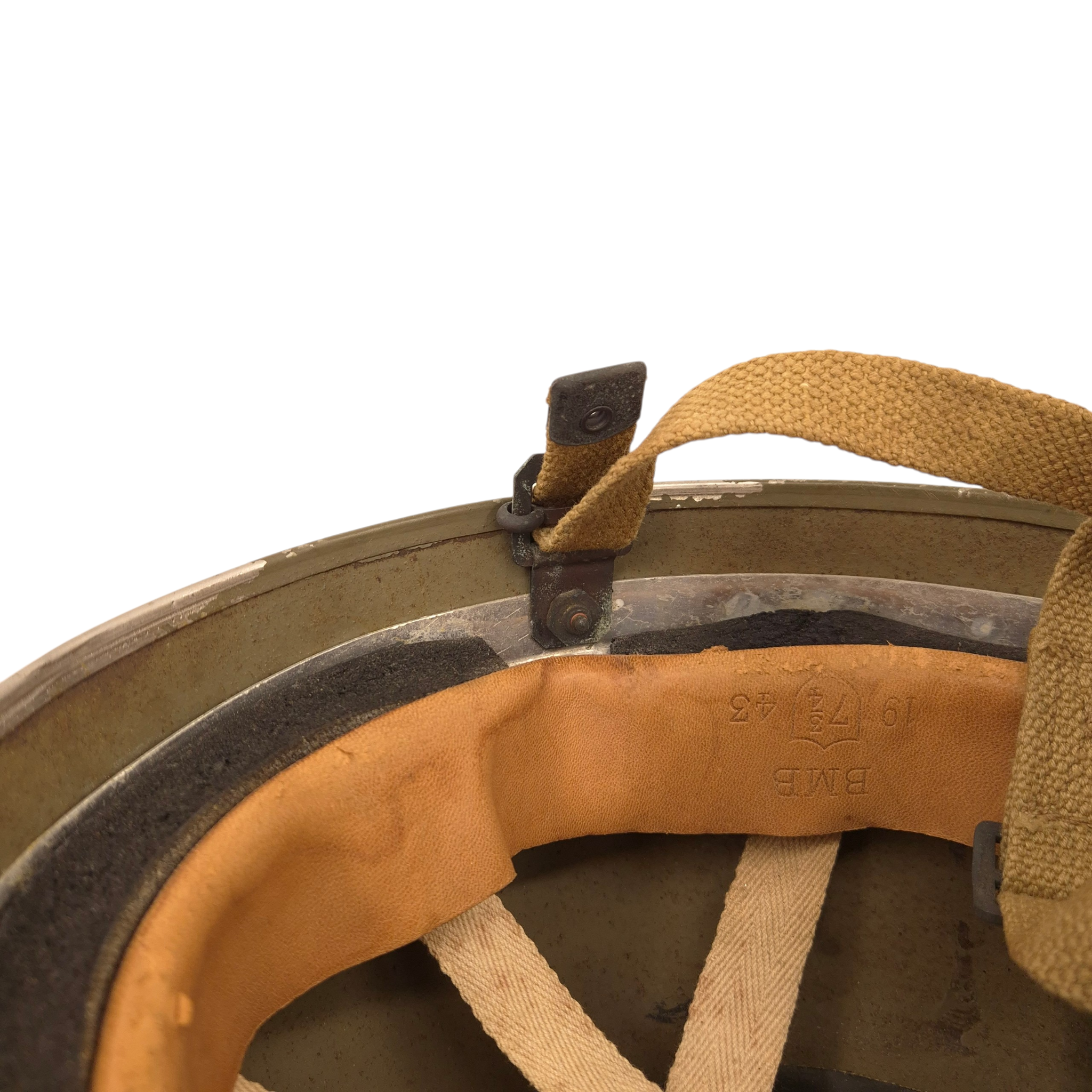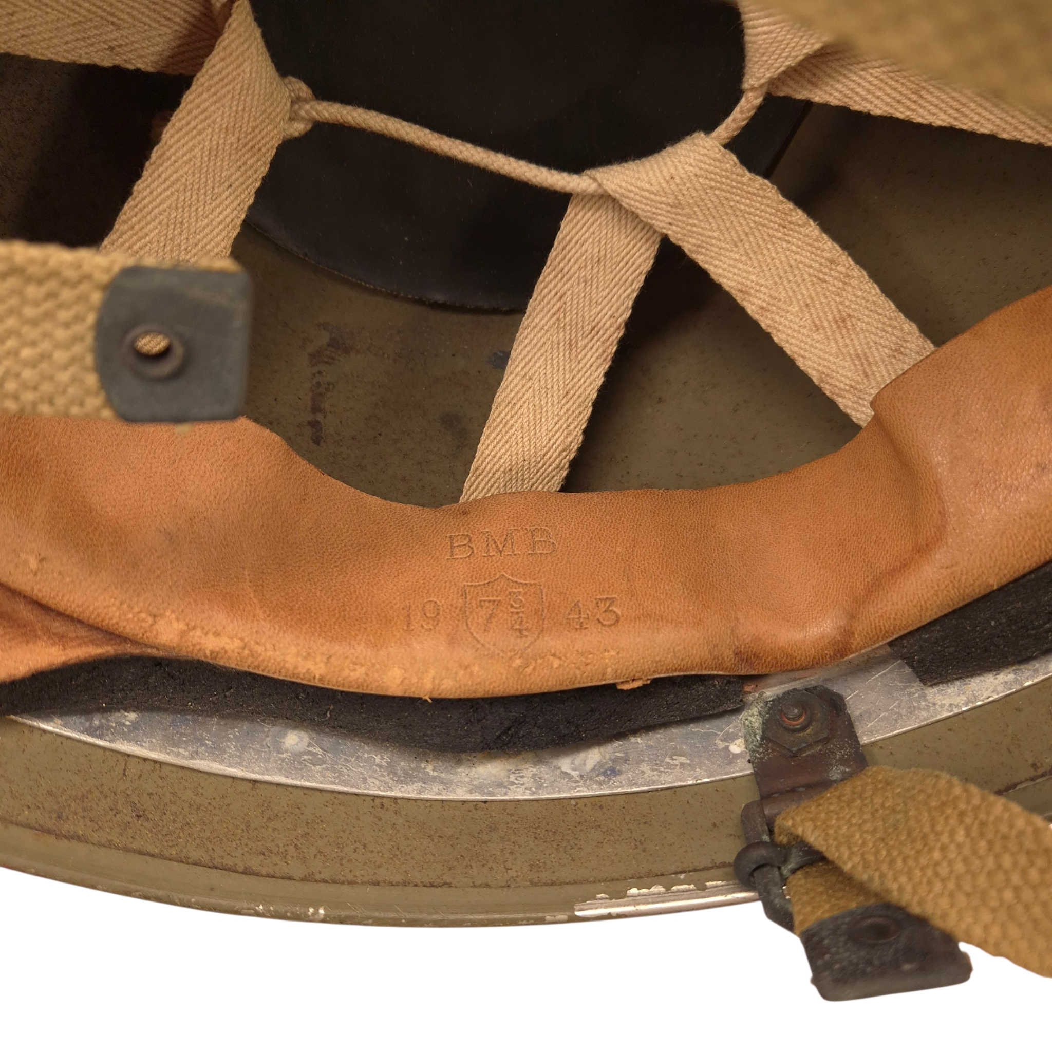 Original WWII British MkII paratrooper helmet, dated 1943. After the prototype P-type helmet, three models of British paratrooper helmets were introduced. First came the fibre rim helmet, followed by the so-called MkI from 1943, which featured a steel rim fitted to the edge of the shell instead of the earlier fibre composition band. This was succeeded by the MkII (sometimes referred to as the MkIII), fitted with a webbing chinstrap. The first MkII helmets were produced in 1943, and examples from this period are documented as being worn during Operation Market Garden (Arnhem, 1944). Later MkII helmets are dated 1944. This helmet was produced by BMB (Briggs Motor Bodies Ltd) and is an early 1943 dated example. It is extremely rare and considerably harder to find than the MkI helmet. The helmet is a desirable size 7¾. The shell still shows its original factory-applied first paint finish. The helmet retains its original chinstrap and remains in untouched, uncleaned condition.