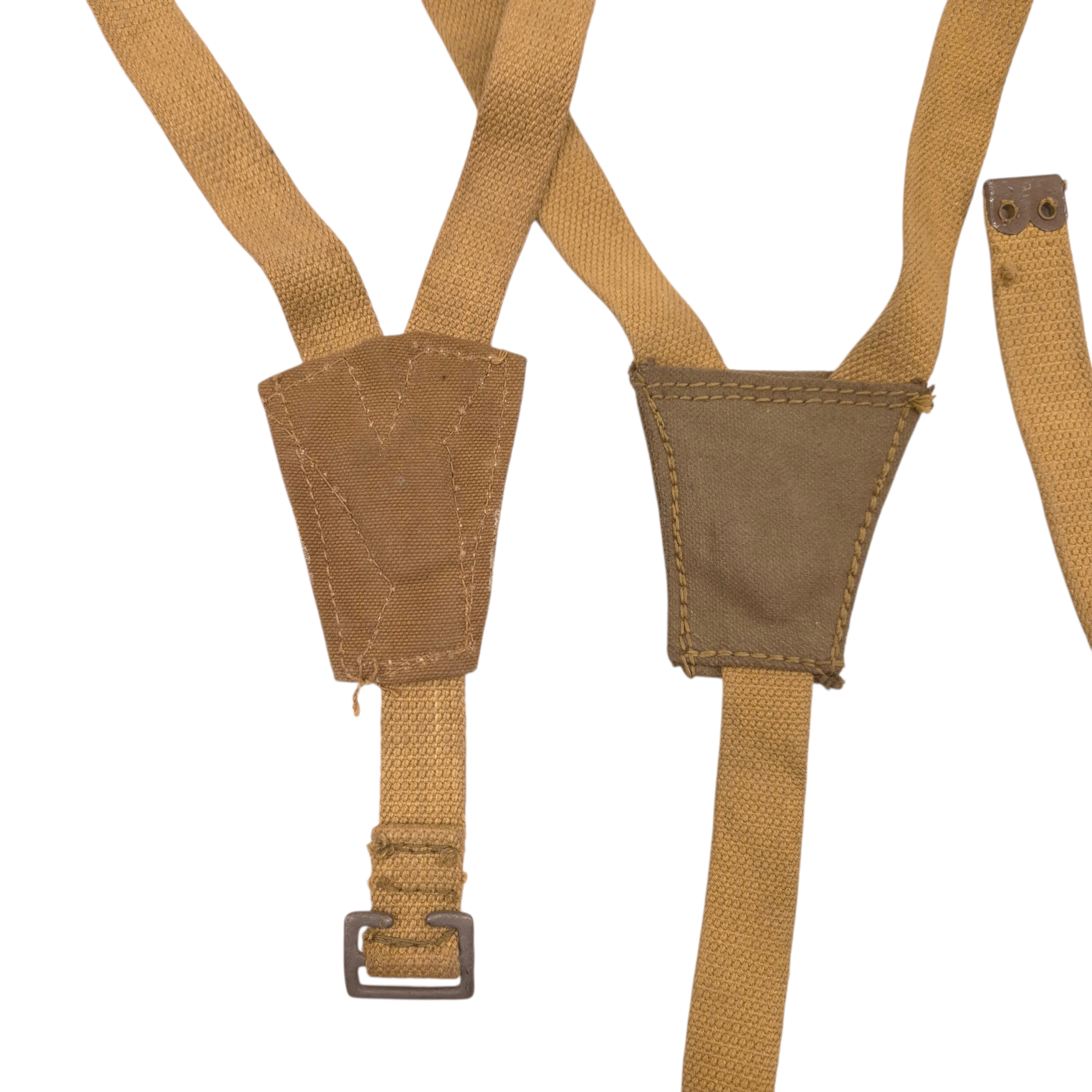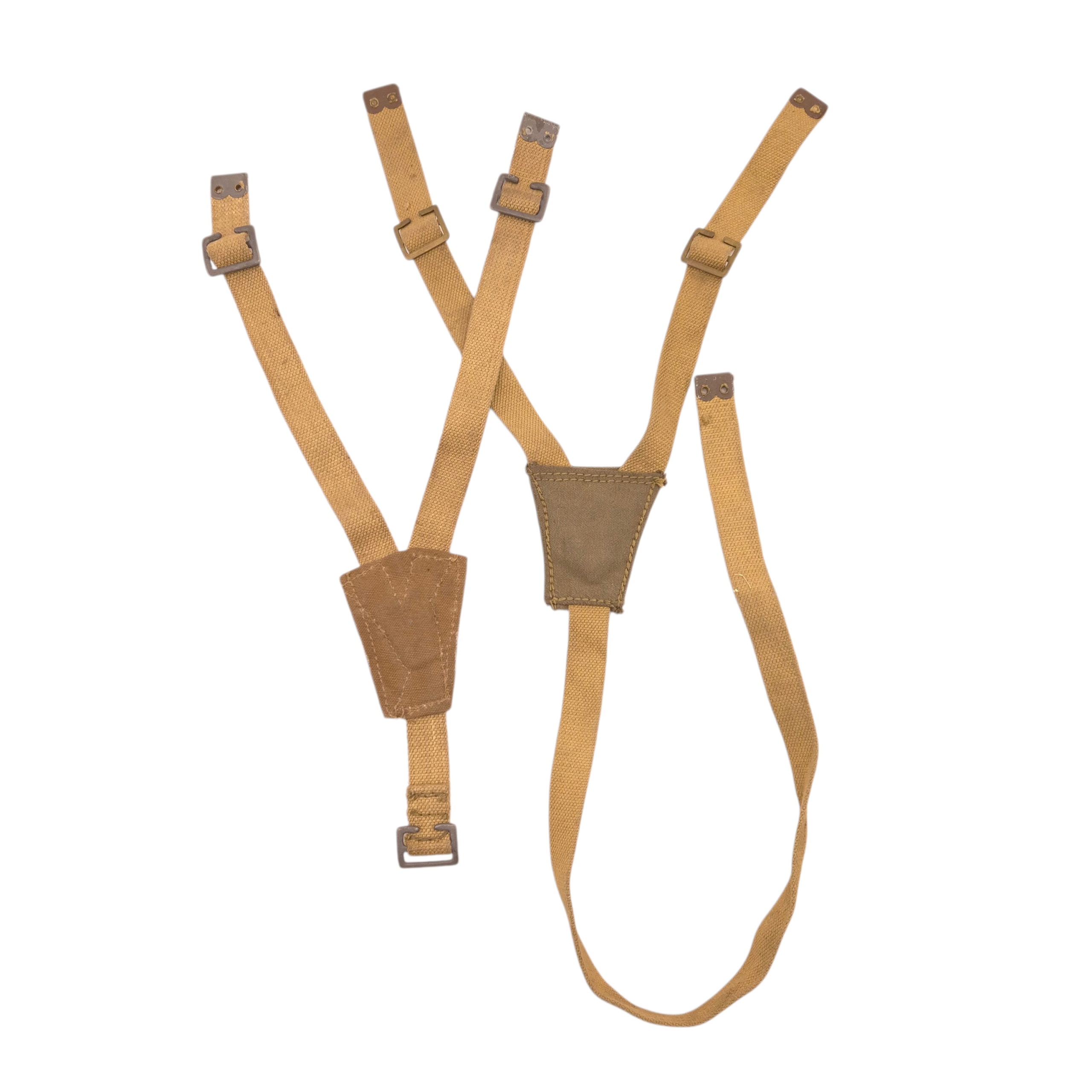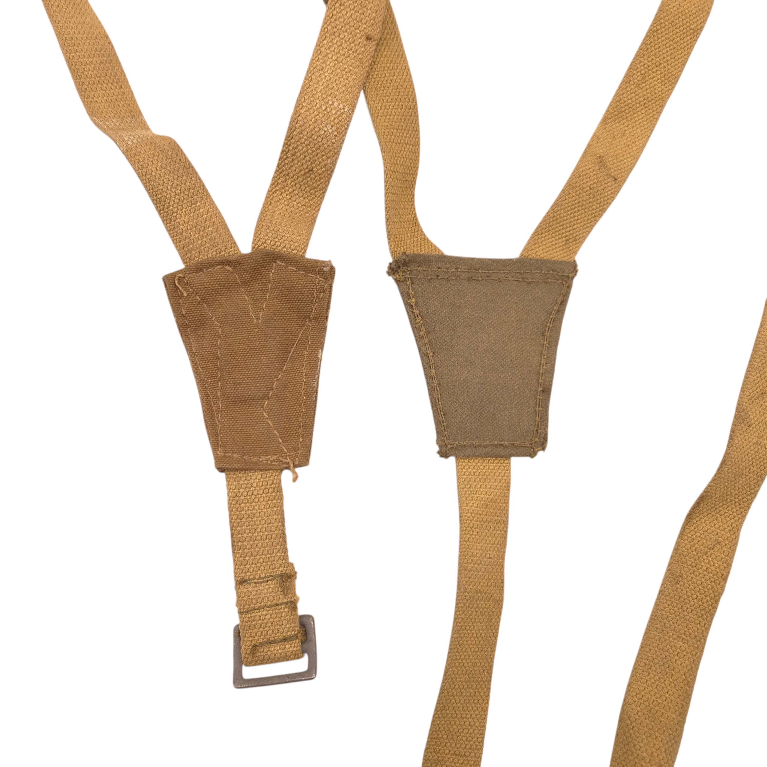 Original WWII British Army Motorcycle Pannier Support Straps. These web straps were used on Norton, BSA, and Triumph motorcycles during WWII. The set includes left and right side straps. They are not maker-matching, but this is not uncommon, as one side can be produced in a different factory. Hard to find and very nice to complete your motorcycle.
