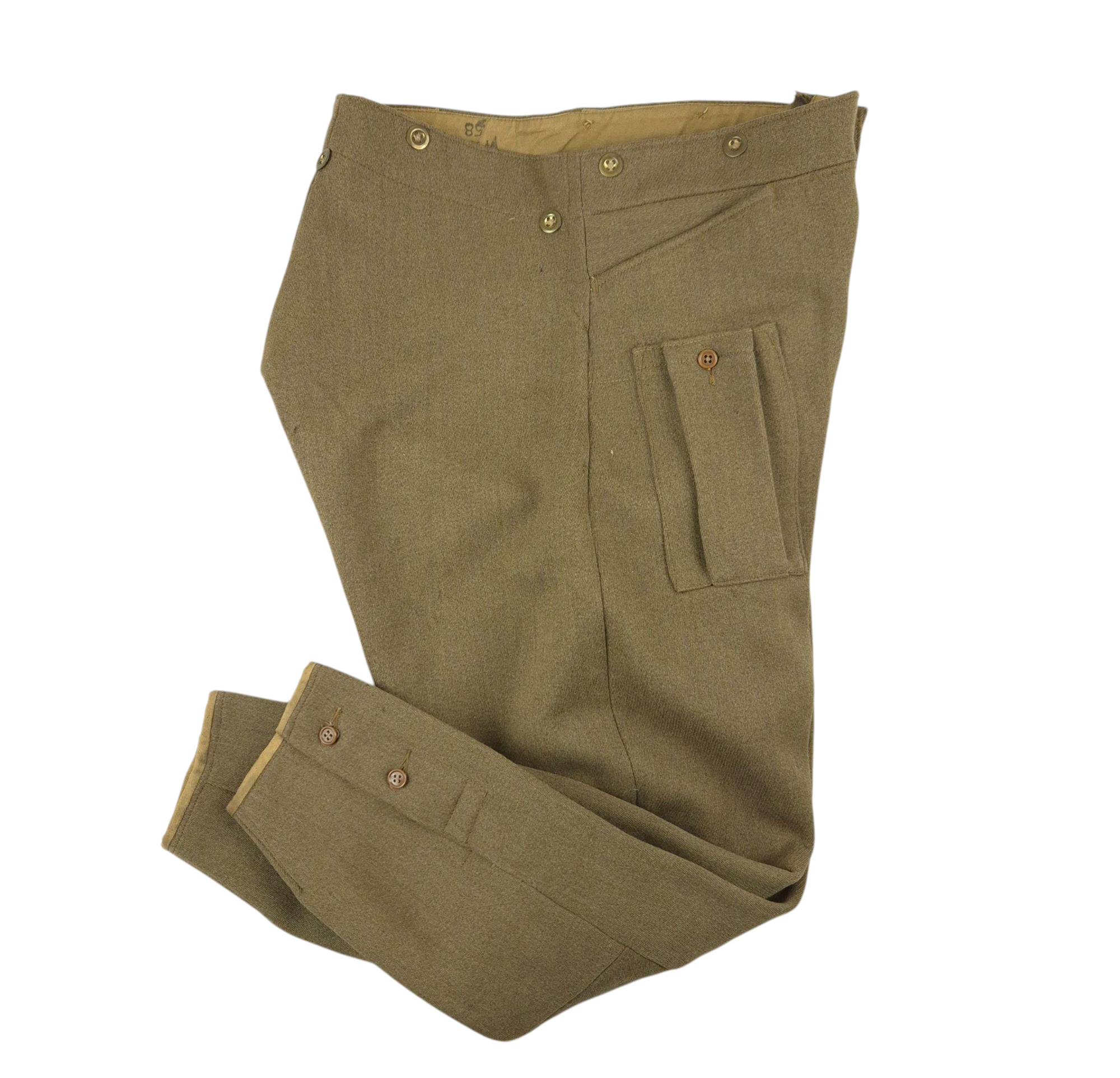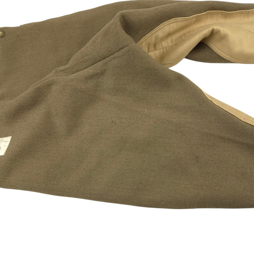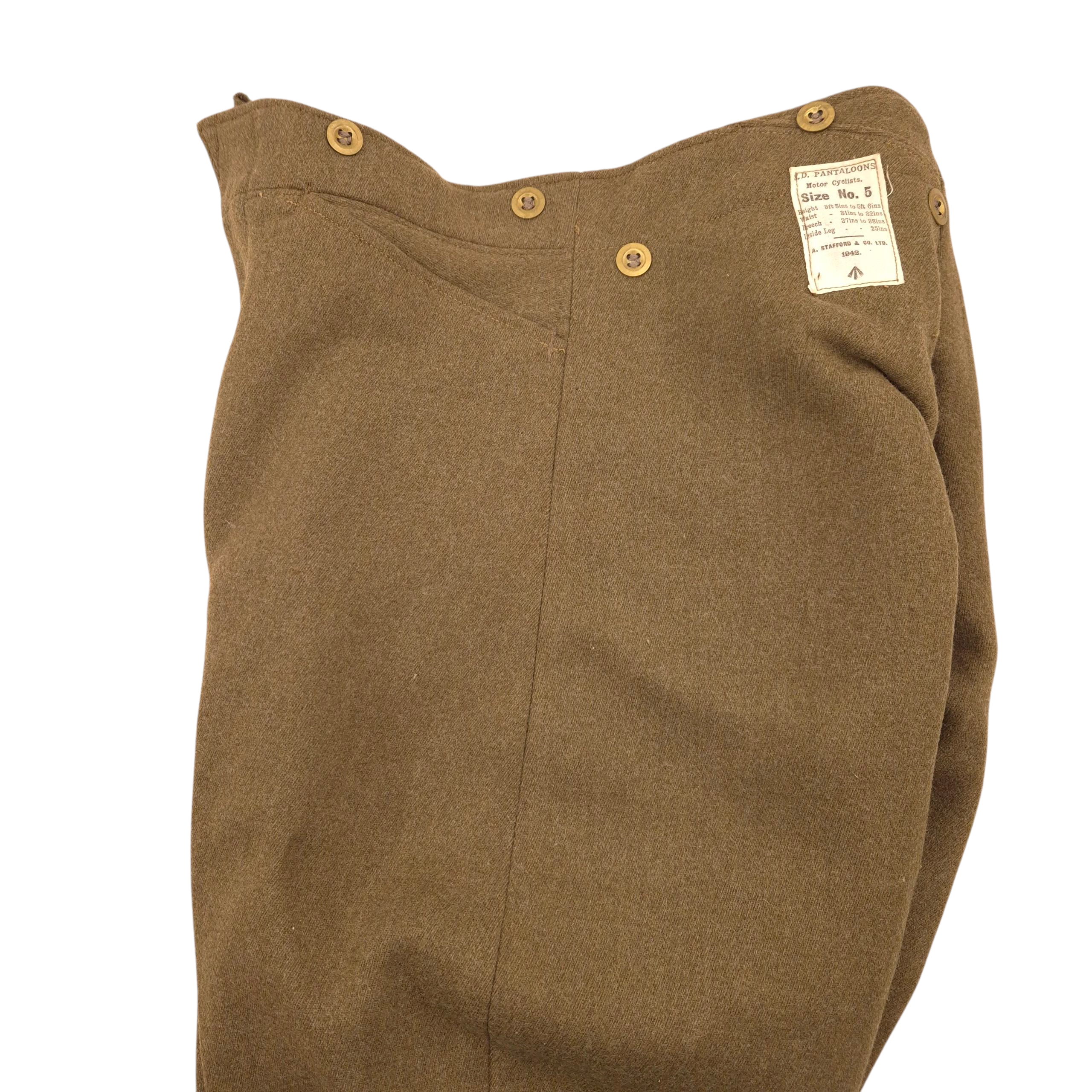 Original pair of WWII British Motorcycle Breeches, dated 1942. The pantaloons are in good condition overall. They retain their original label, made by A. Stafford & Co and dated 1942, in size 5. WD ‘O’ for 1942 stamped. These pantaloons were commonly worn by British, Canadian, and Polish motorcyclists during the war.