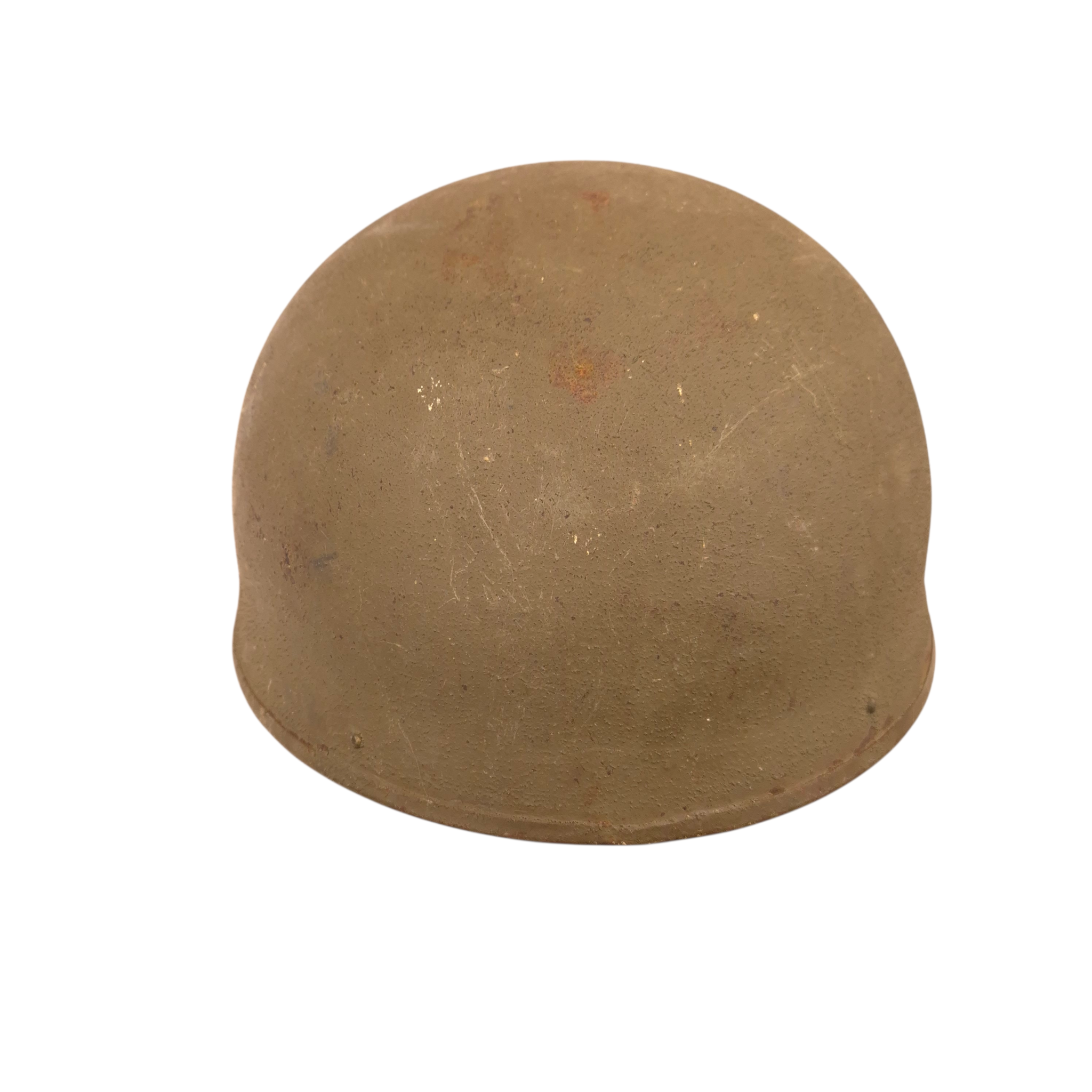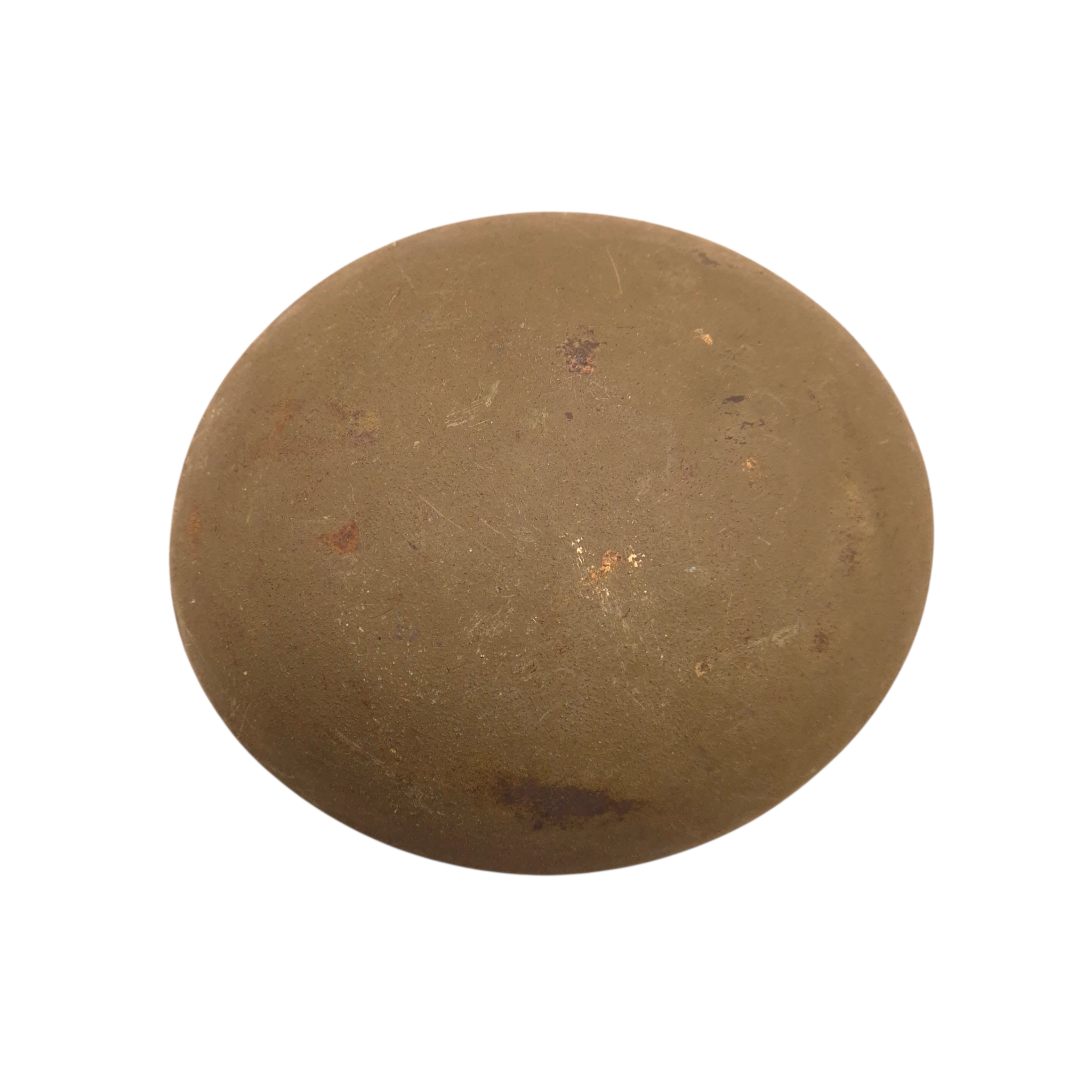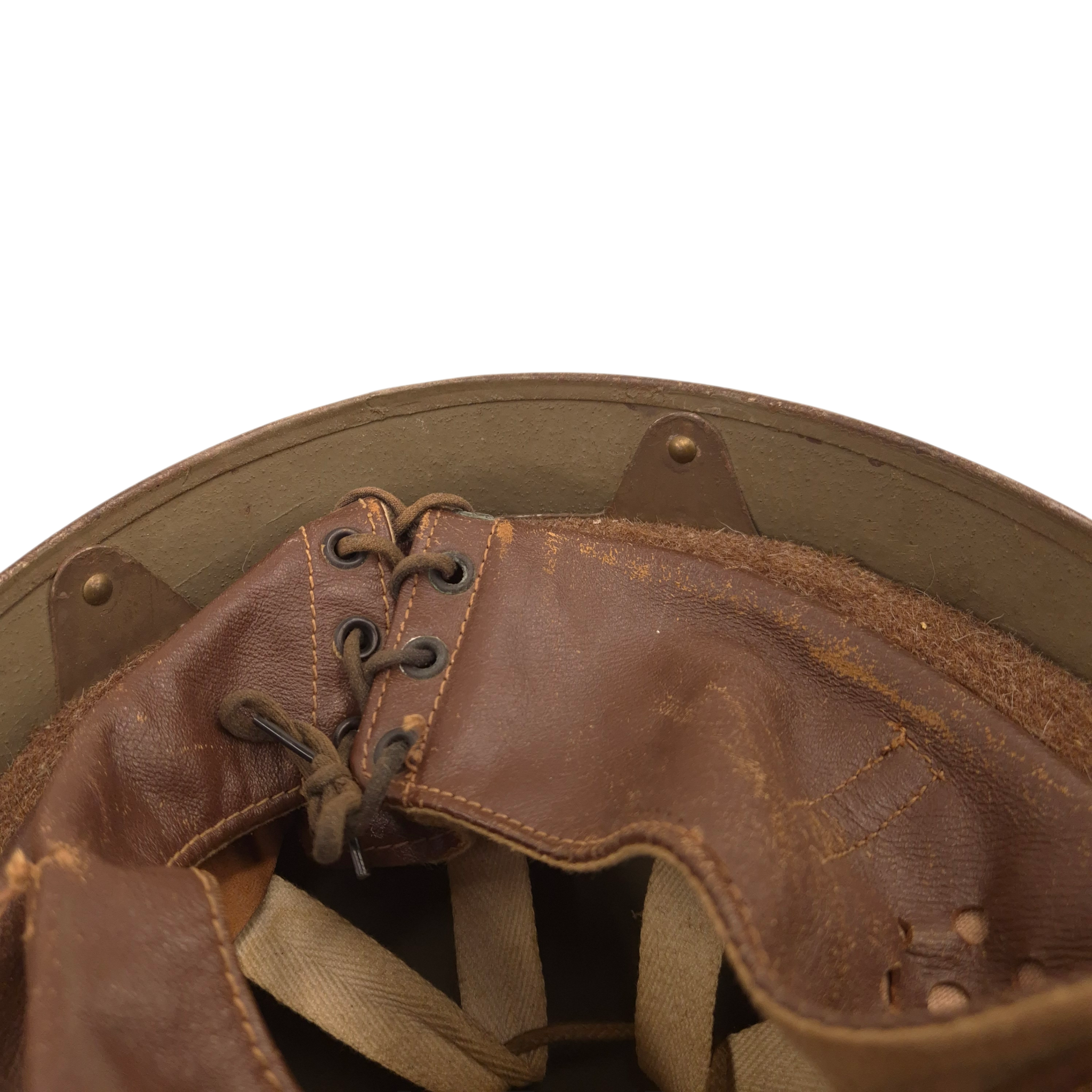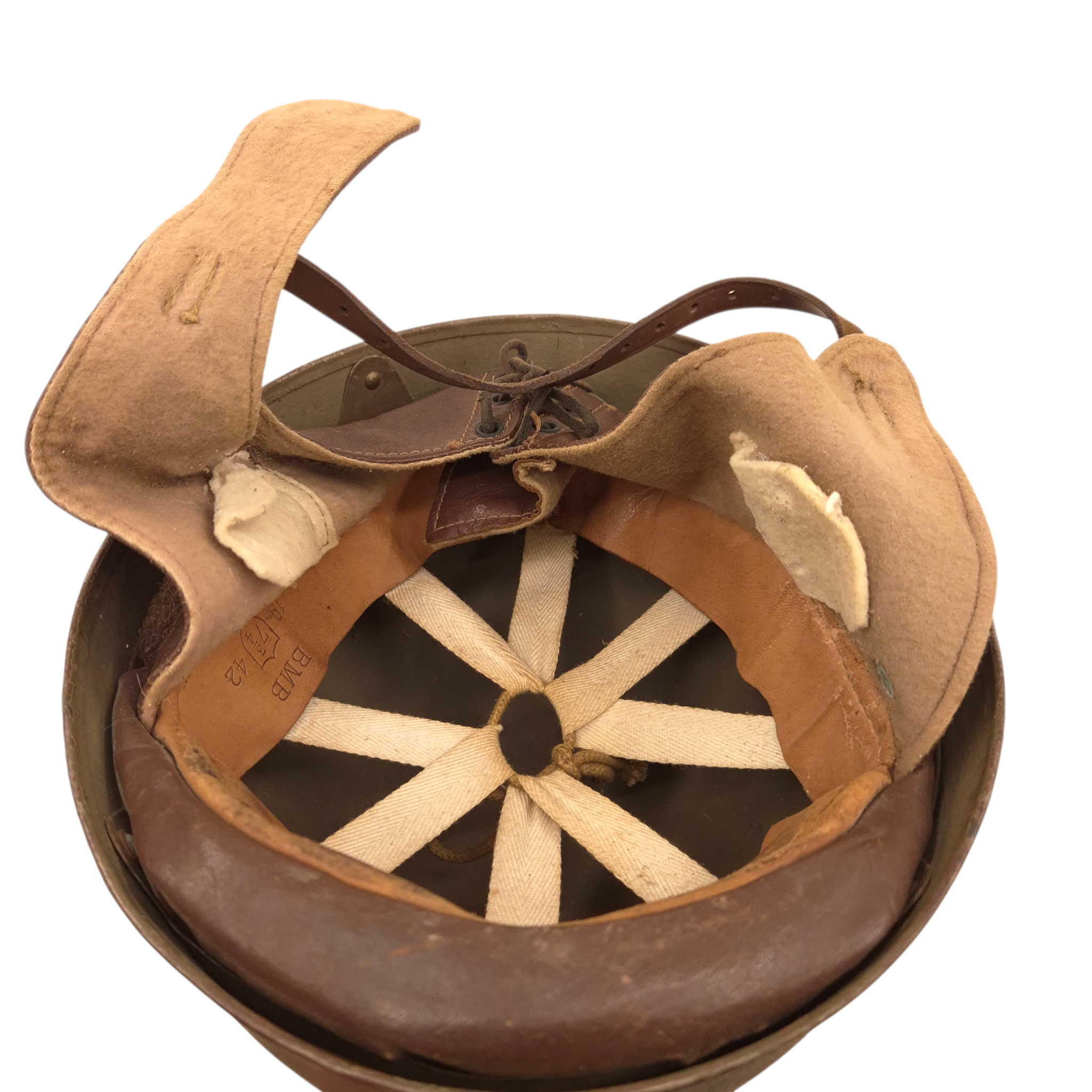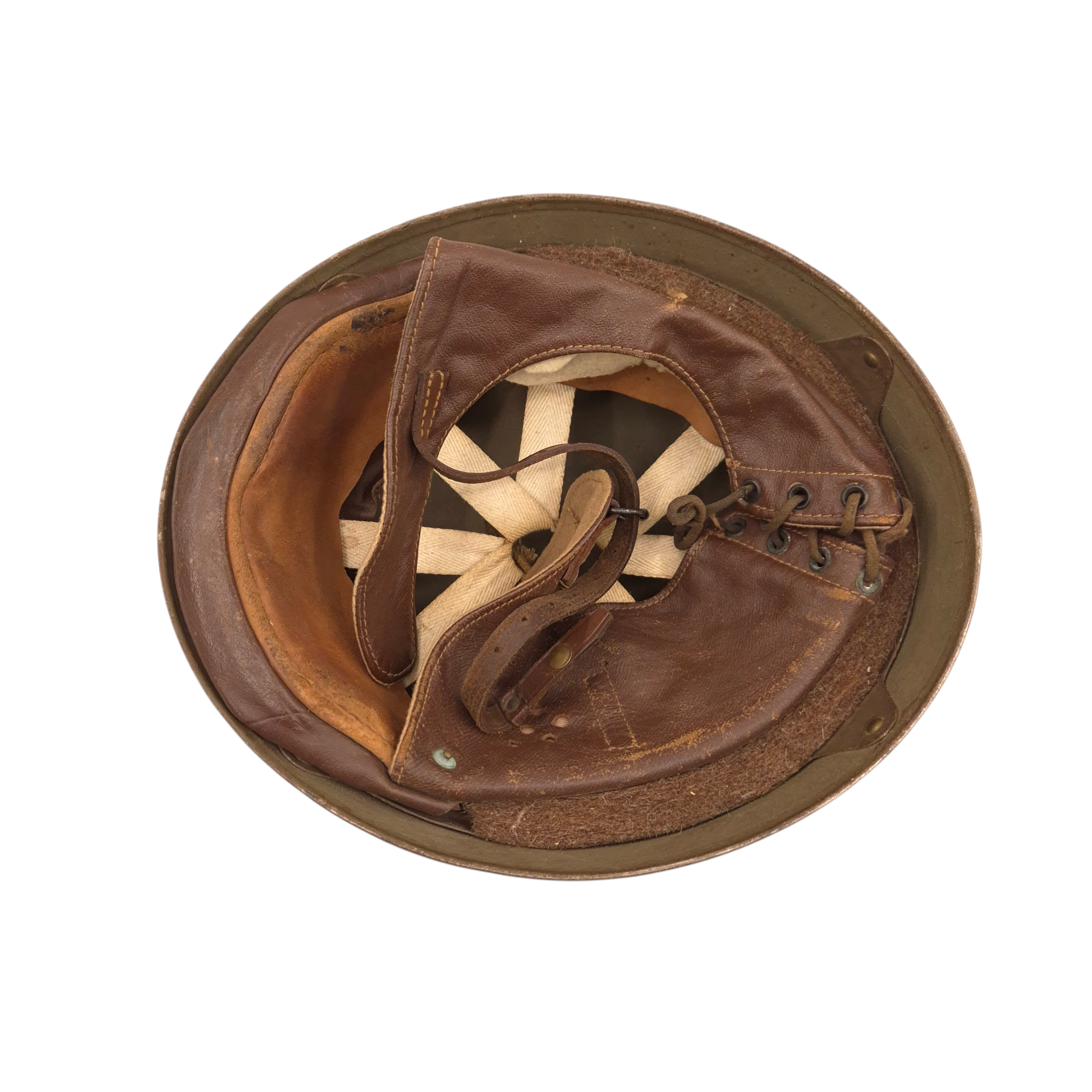 Original WWII British Motorcyclists’ “Dispatch Rider” helmet. This helmet retains its original factory-applied first-layer paint and is in very good condition, showing only normal signs of wartime wear. It is complete with its full-length leather chinstrap. Maker marked BMB (Briggs Motor Bodies Ltd) and dated 1942, the year production of this type of motorcycle helmet began. Size 7 3/4.