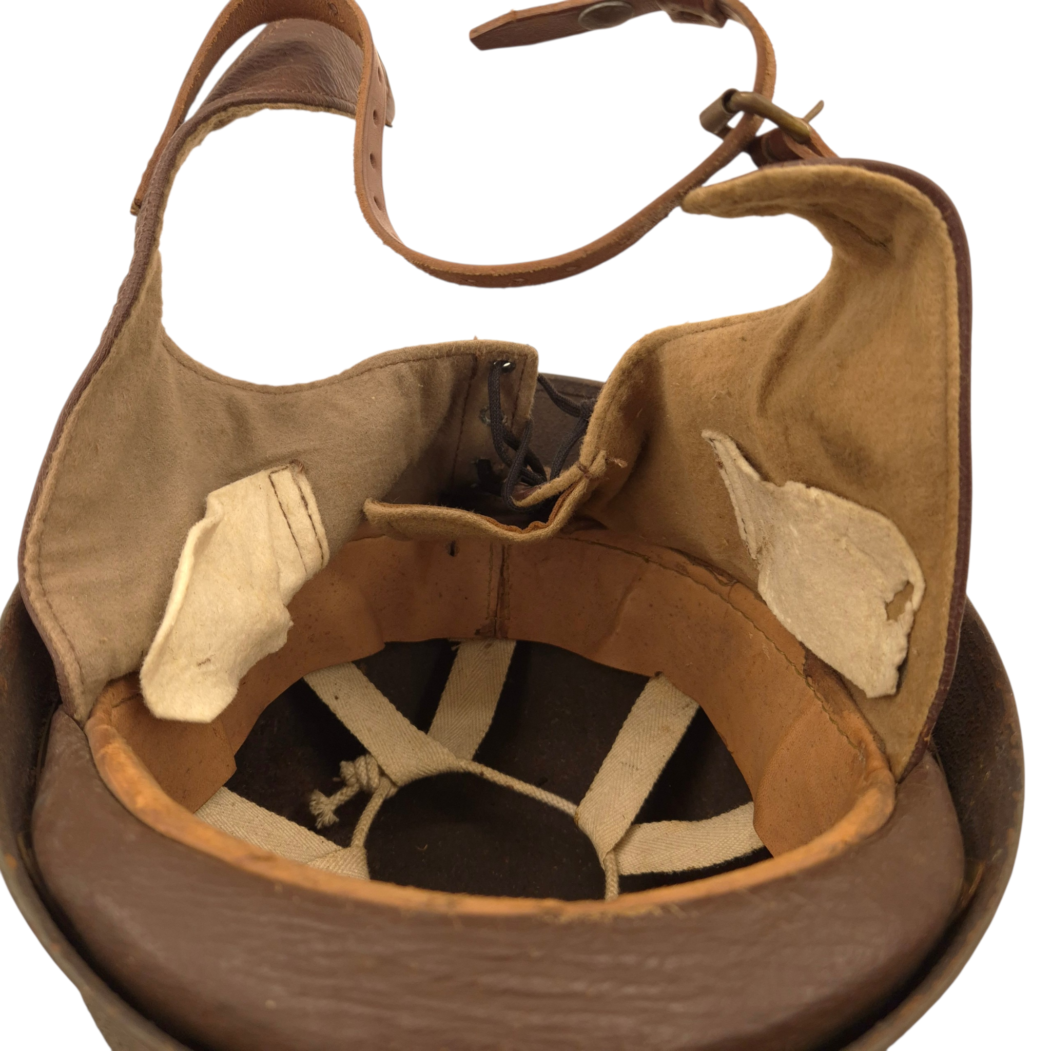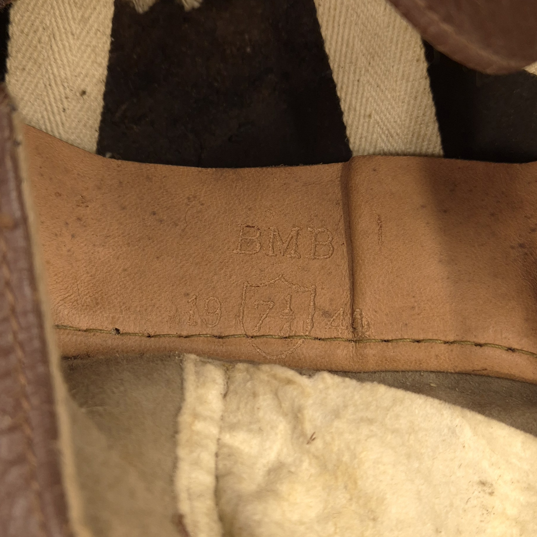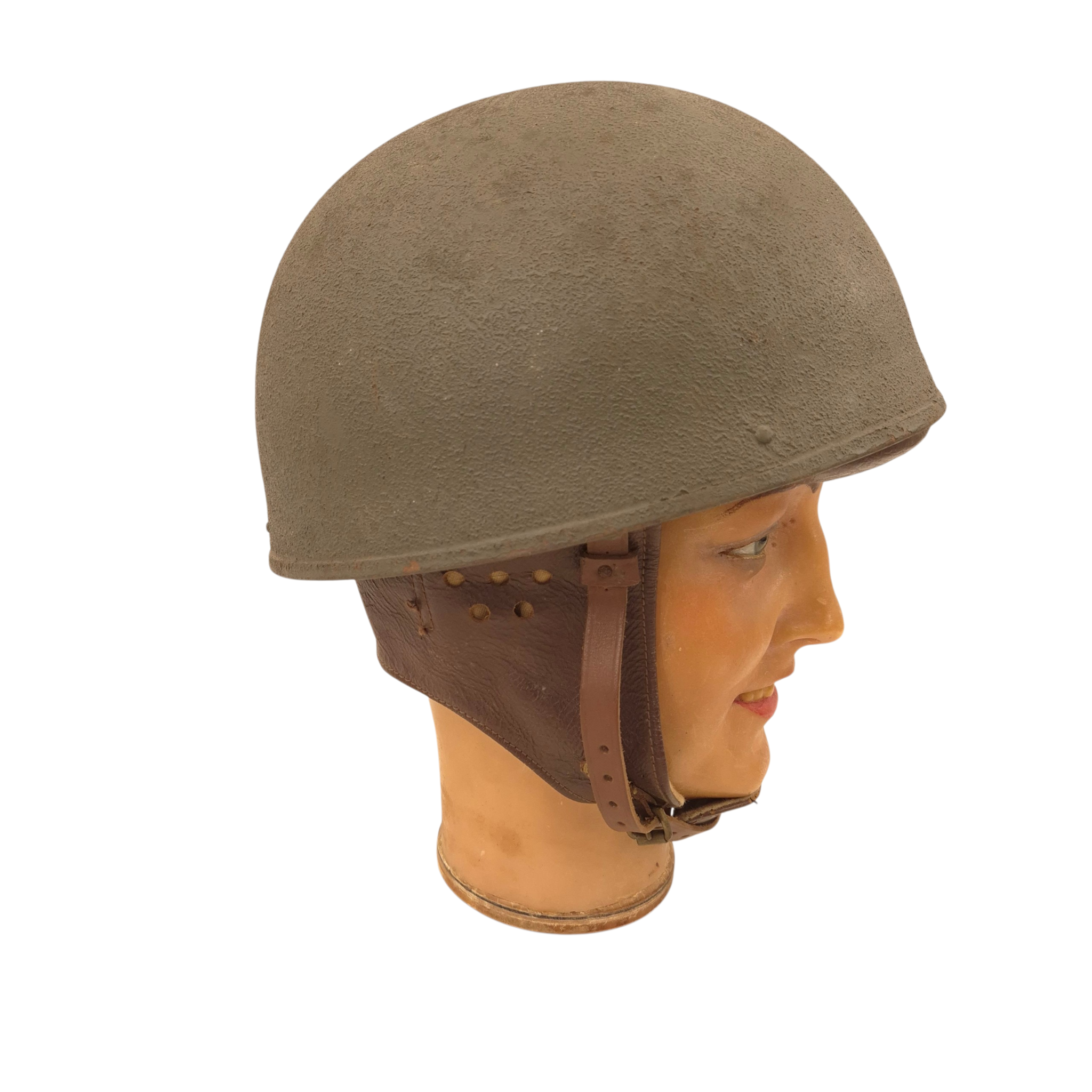 Original WWII British Motorcyclists’ “Dispatch Rider” helmet. This helmet remains in good condition, showing only normal signs of wartime wear. It is complete with its full-length leather chinstrap. Maker marked BMB (Briggs Motor Bodies Ltd) and dated 1944 and size 7 1/4.