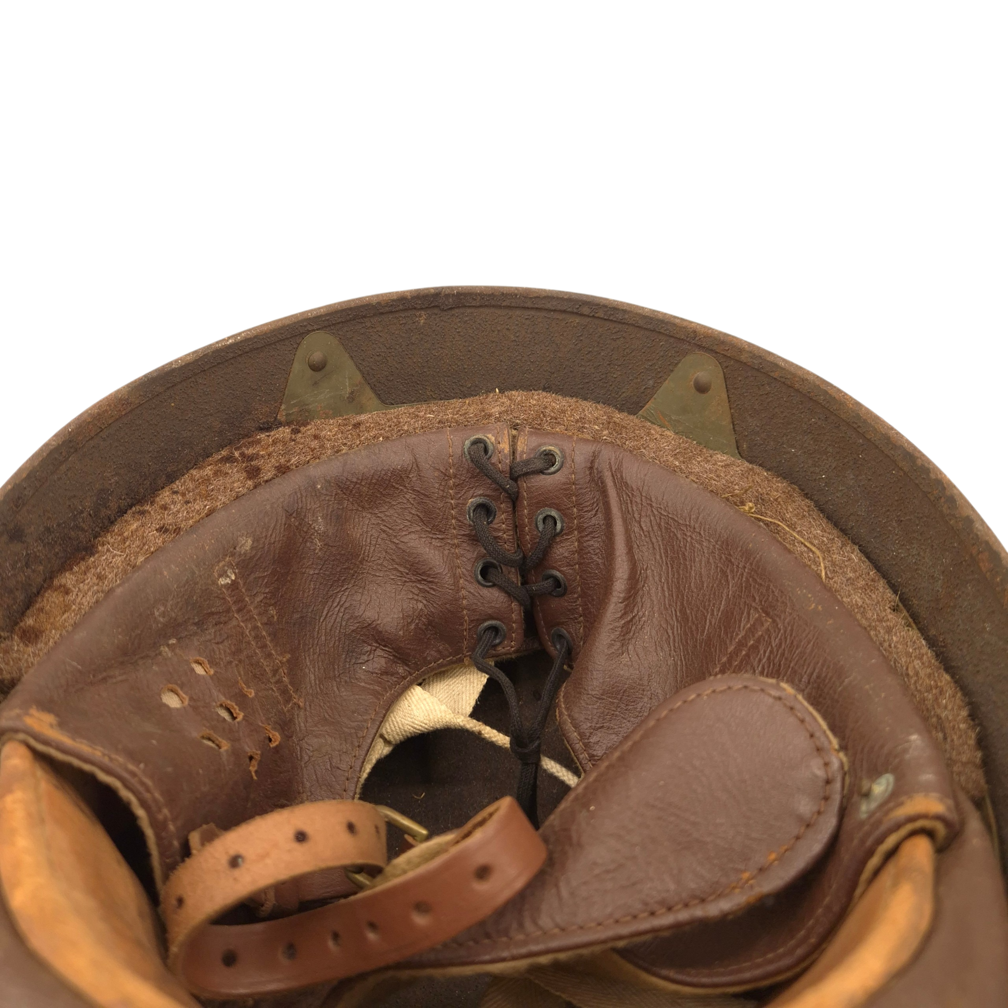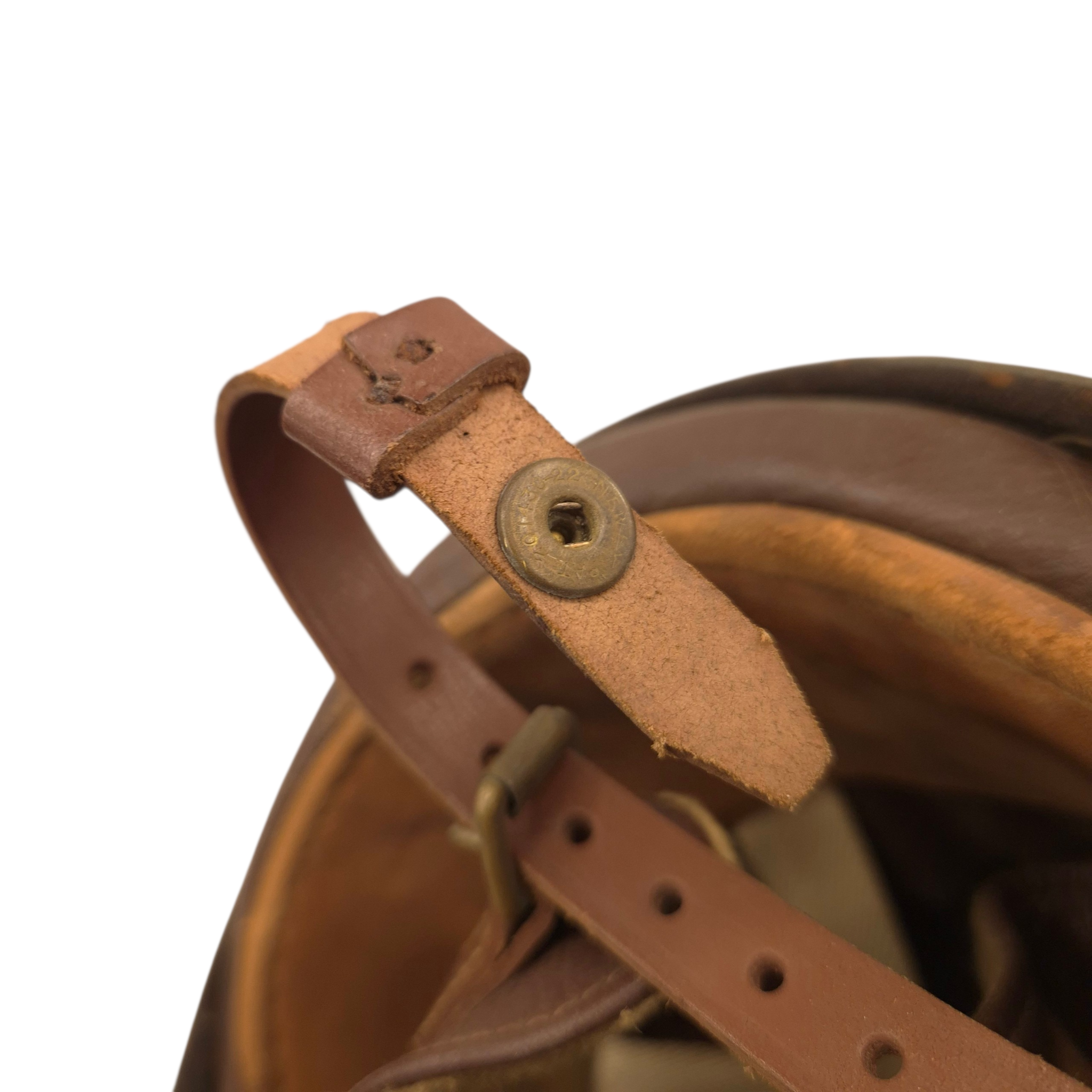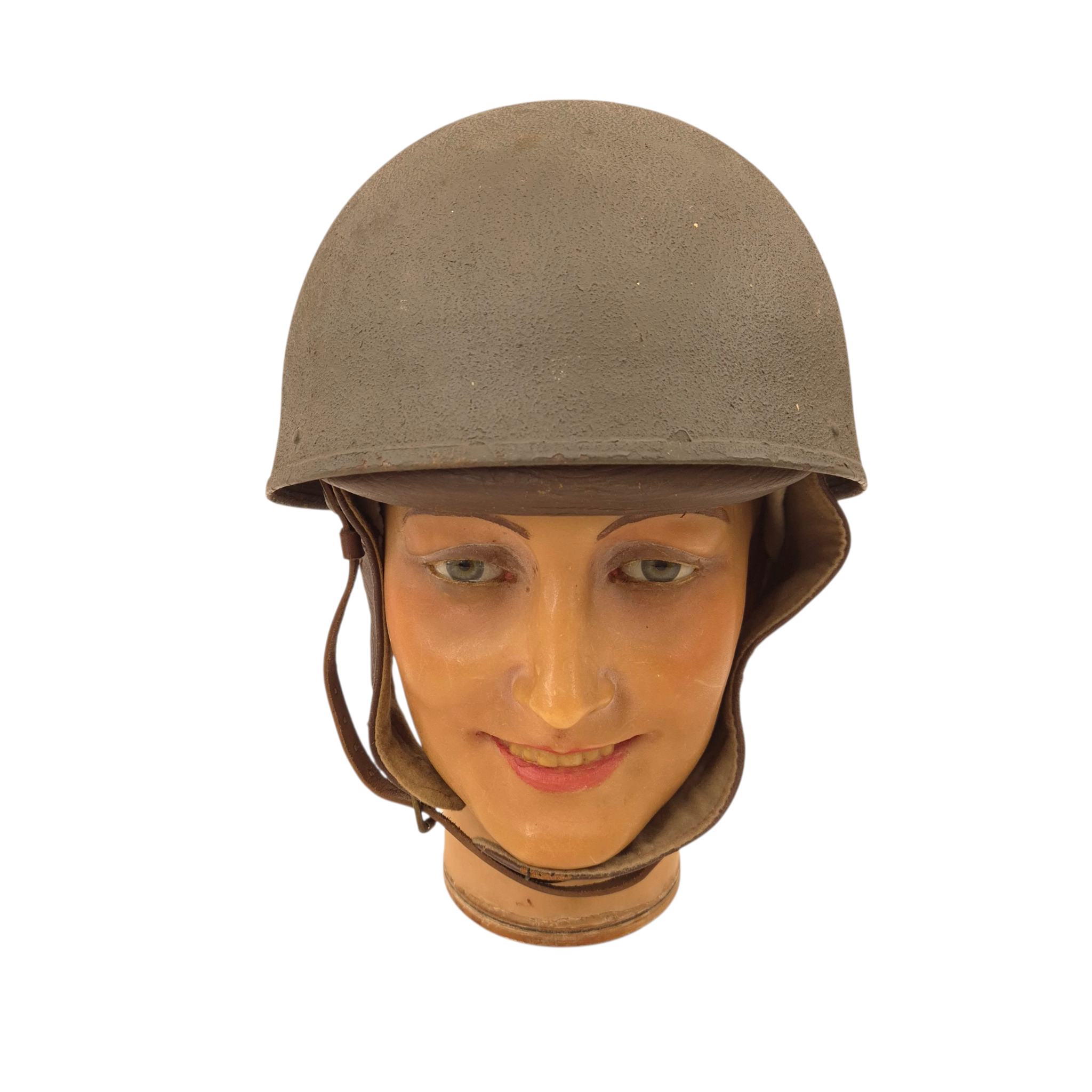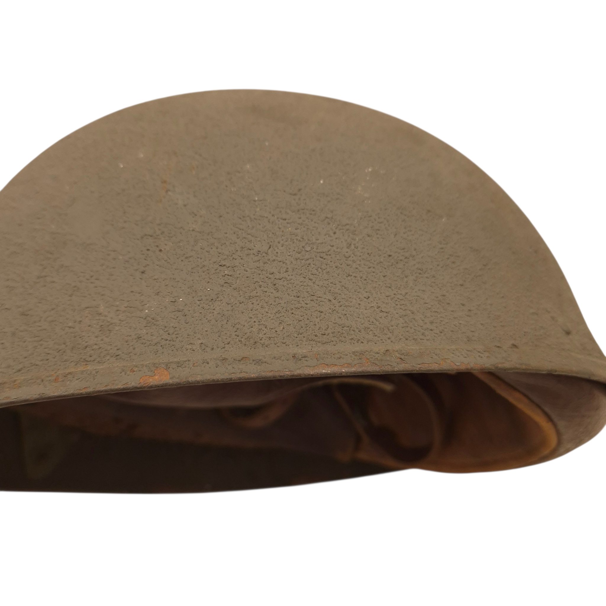 Original WWII British Motorcyclists’ “Dispatch Rider” helmet. This helmet remains in good condition, showing only normal signs of wartime wear. It is complete with its full-length leather chinstrap. Maker marked BMB (Briggs Motor Bodies Ltd) and dated 1944 and size 7 1/4.