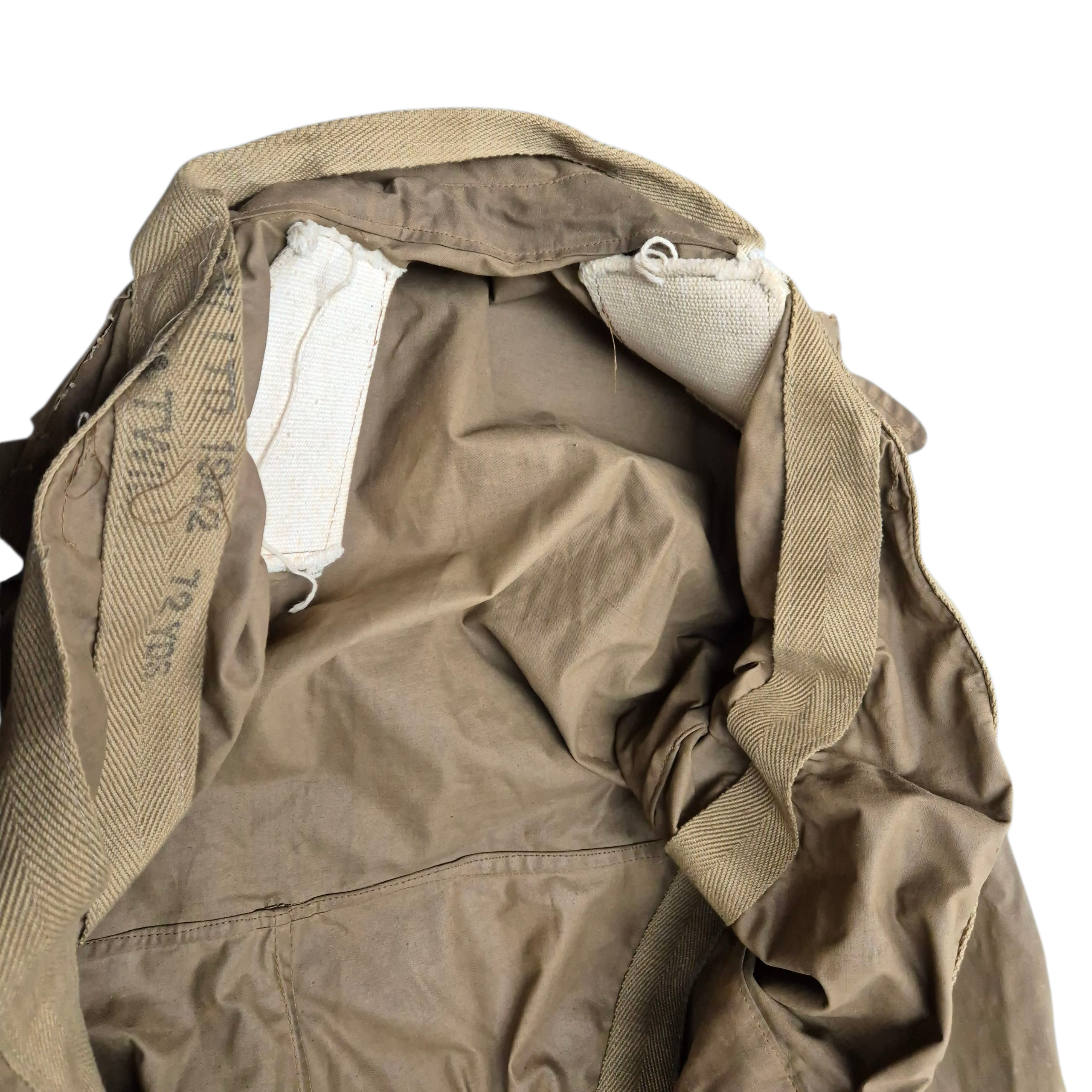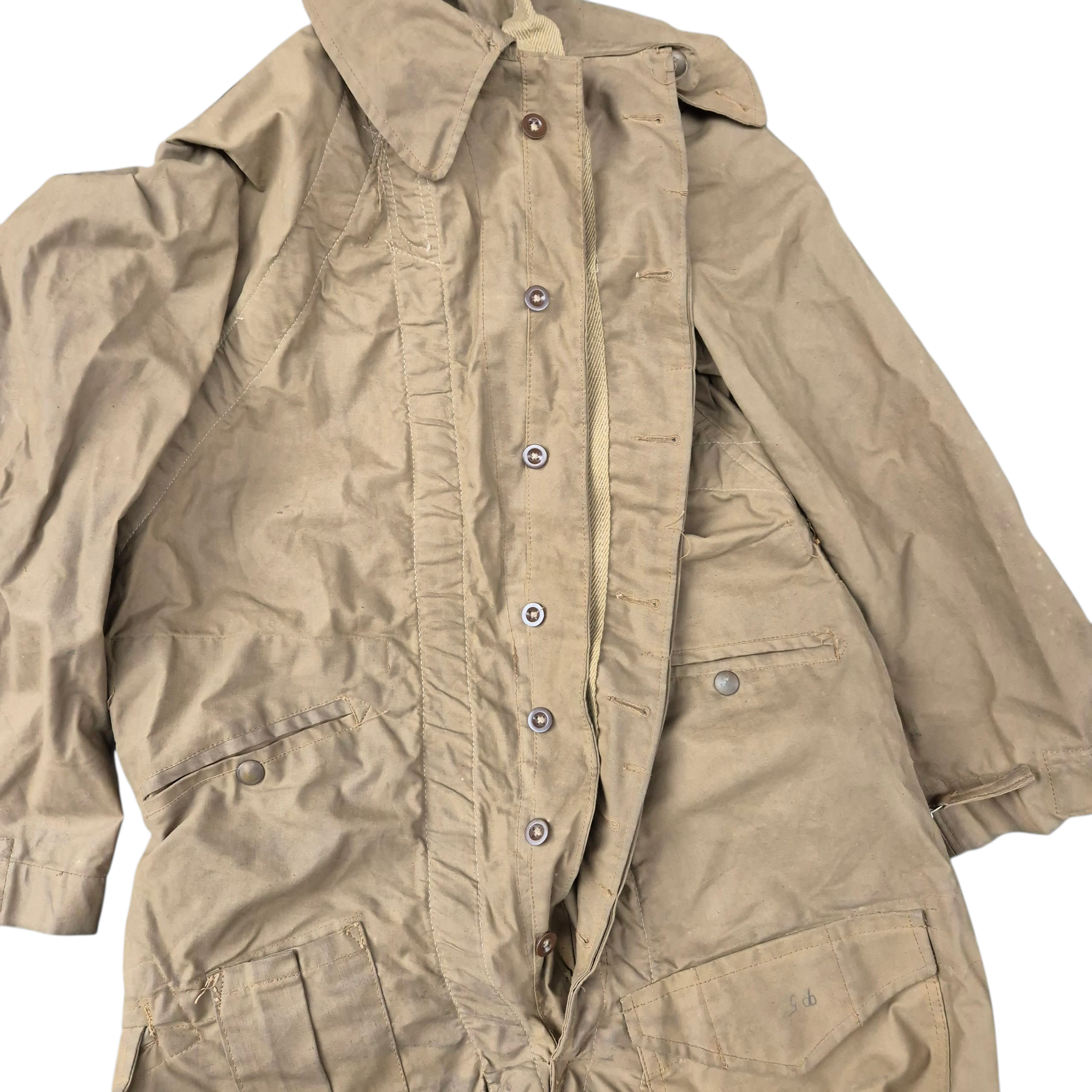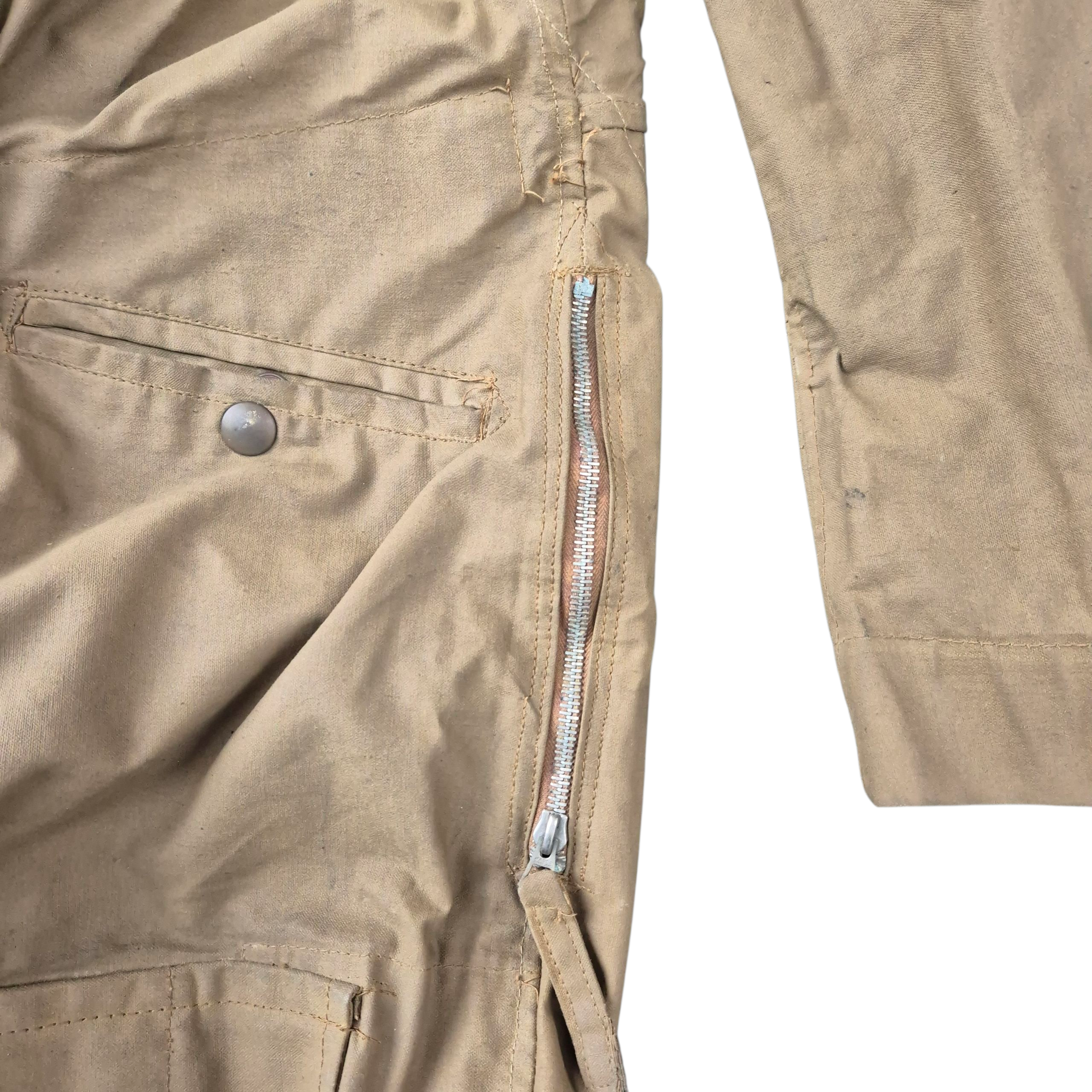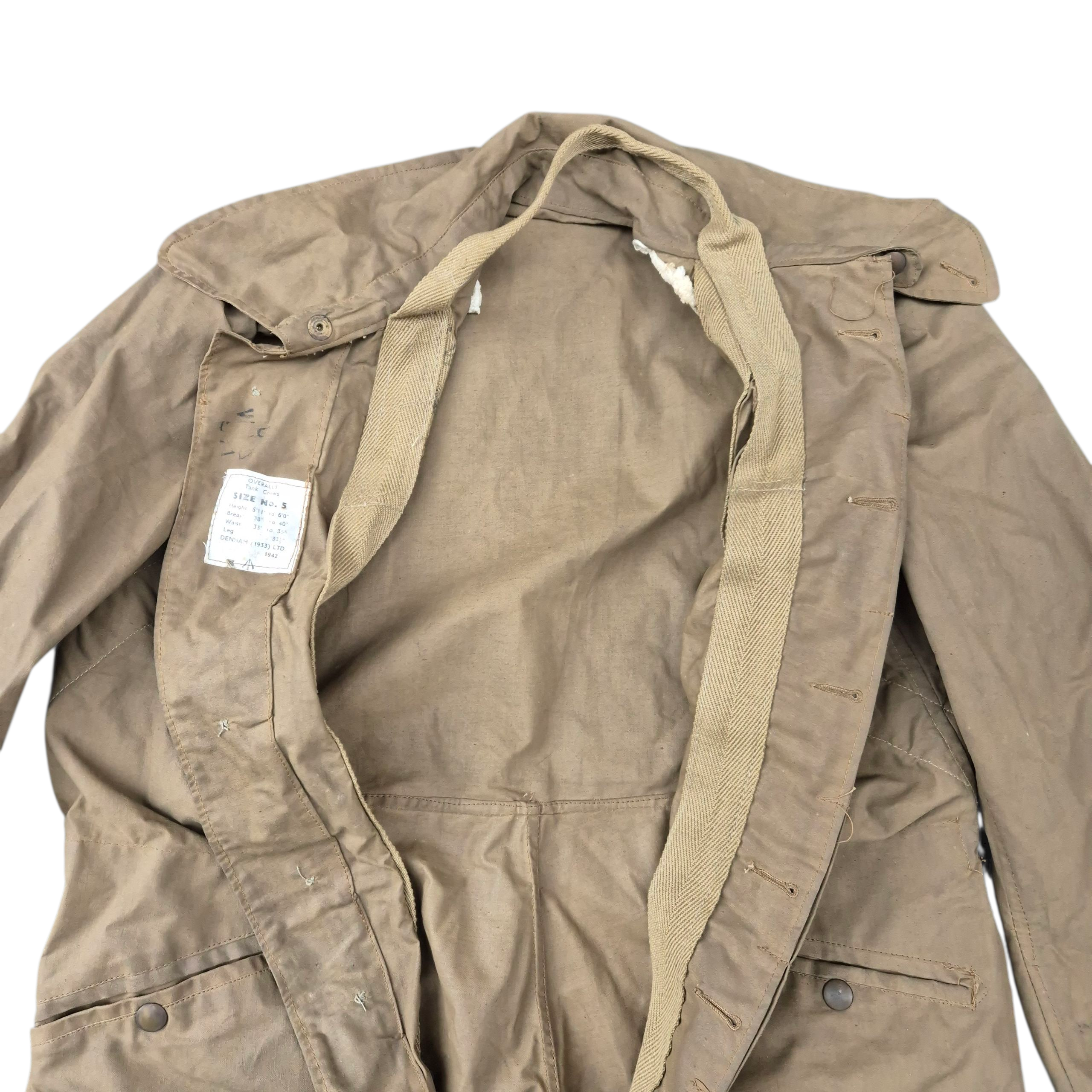 Very RARE 1942 dated British Tank Crew Overalls. This khaki-coloured British tank suit is in very good condition, showing only normal signs of service wear. It is complete with all of its original and fully functional zippers, as well as Newey brass press-studs. The tank suit has a canvas-reinforced strap sewn into the overall, with a section at the neck designed for dragging; if a trooper was wounded, his comrade could pull him away from the vehicle. The overall retains a clear and original maker’s label, marked DENHAM Ltd., size 5, and dated 1942. WD letter ‘O’ stamped that indicates the dated 1942 as well. This pattern of tank suit is commonly associated with early-war British armoured vehicle crews and is believed to have been issued with Dingo scout cars, as well as to British, Canadian, and Polish armoured troops.