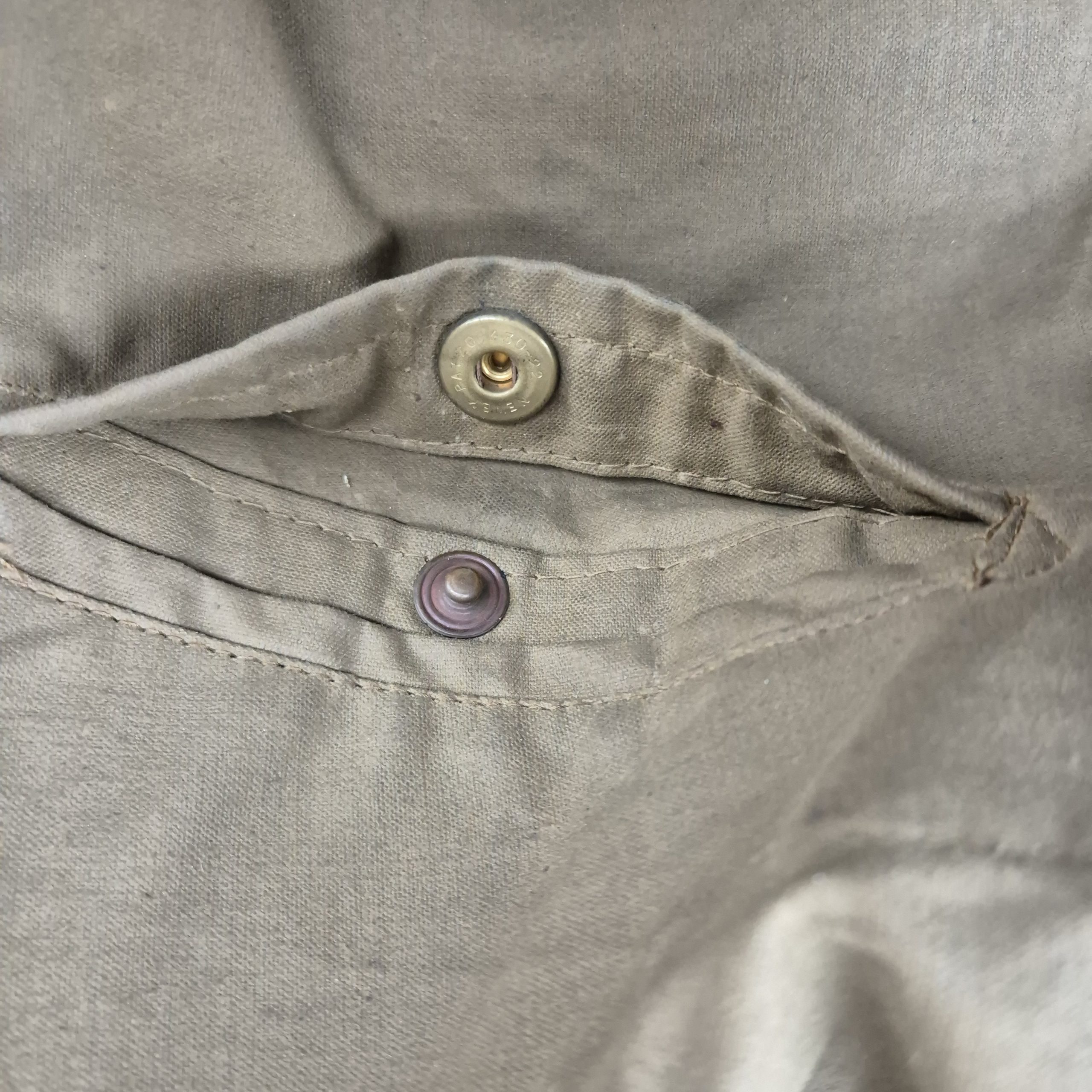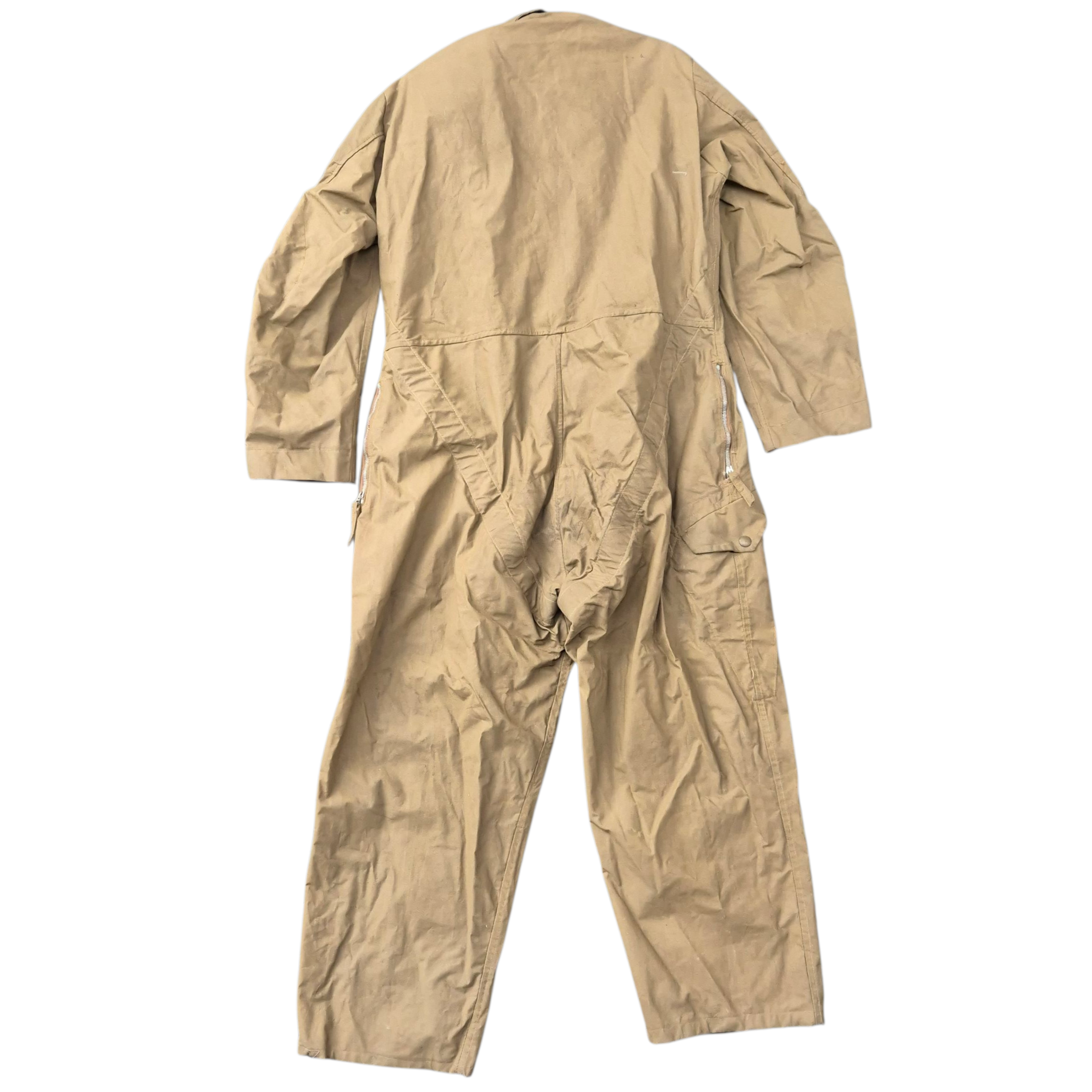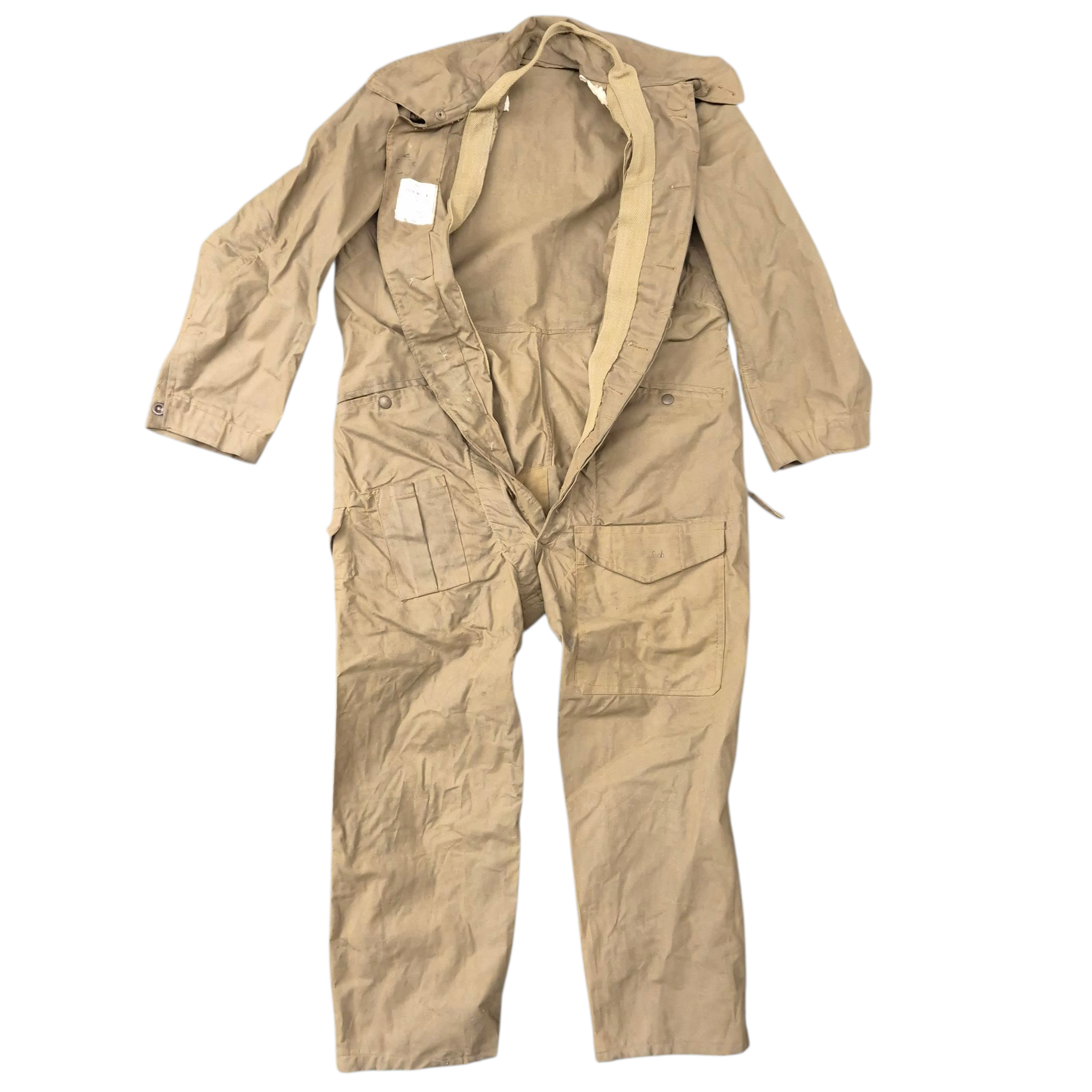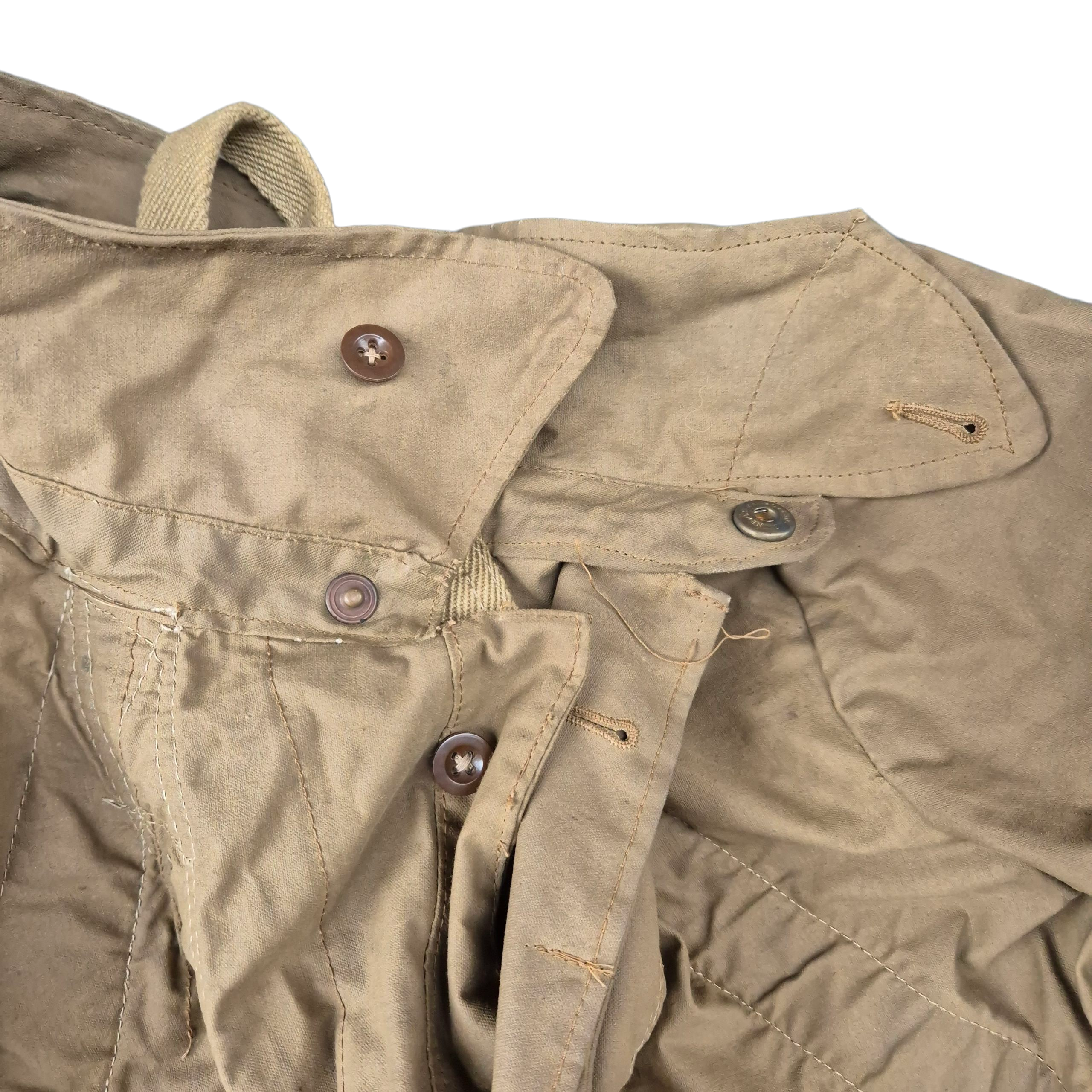 Very RARE 1942 dated British Tank Crew Overalls. This khaki-coloured British tank suit is in very good condition, showing only normal signs of service wear. It is complete with all of its original and fully functional zippers, as well as Newey brass press-studs. The tank suit has a canvas-reinforced strap sewn into the overall, with a section at the neck designed for dragging; if a trooper was wounded, his comrade could pull him away from the vehicle. The overall retains a clear and original maker’s label, marked DENHAM Ltd., size 5, and dated 1942. WD letter ‘O’ stamped that indicates the dated 1942 as well. This pattern of tank suit is commonly associated with early-war British armoured vehicle crews and is believed to have been issued with Dingo scout cars, as well as to British, Canadian, and Polish armoured troops.