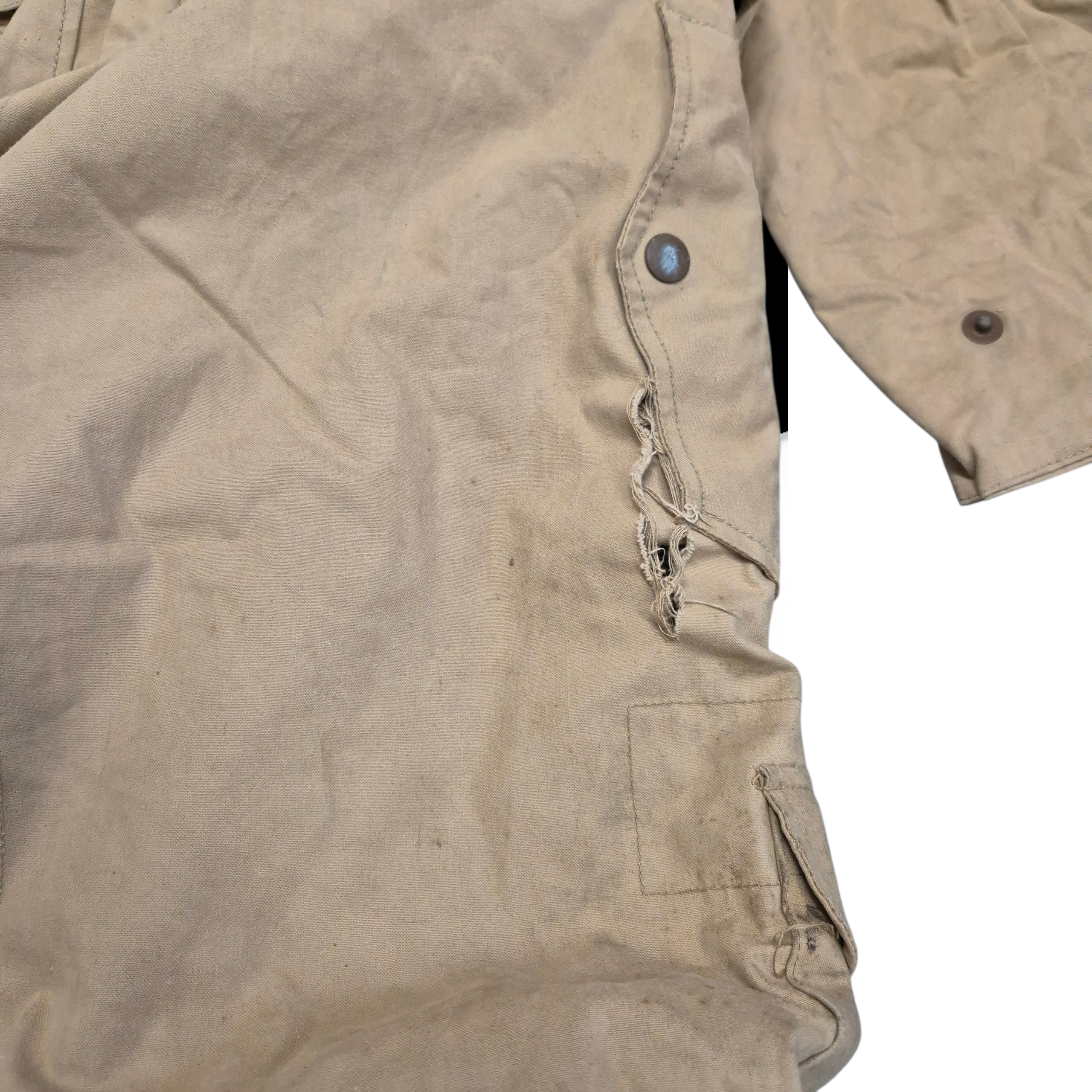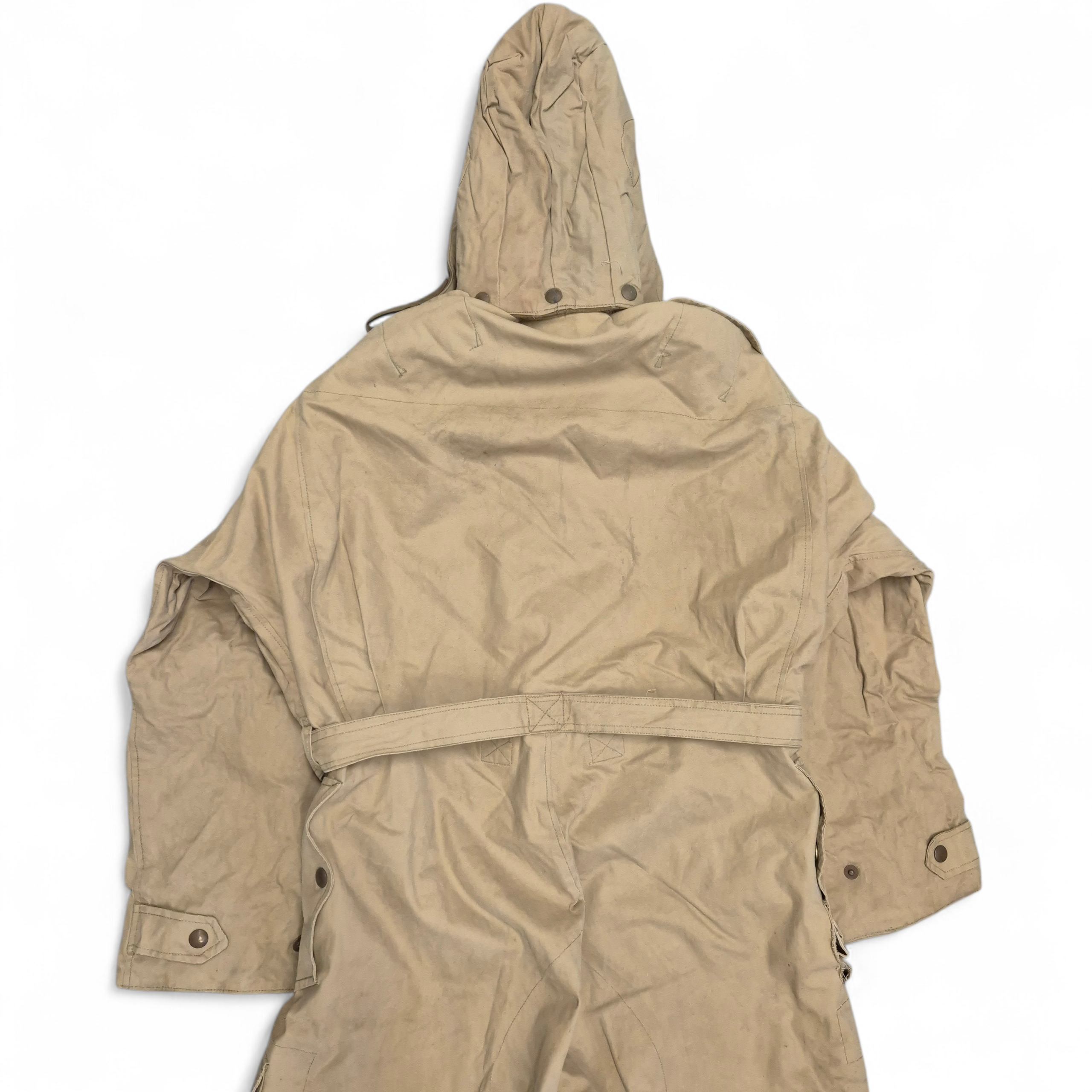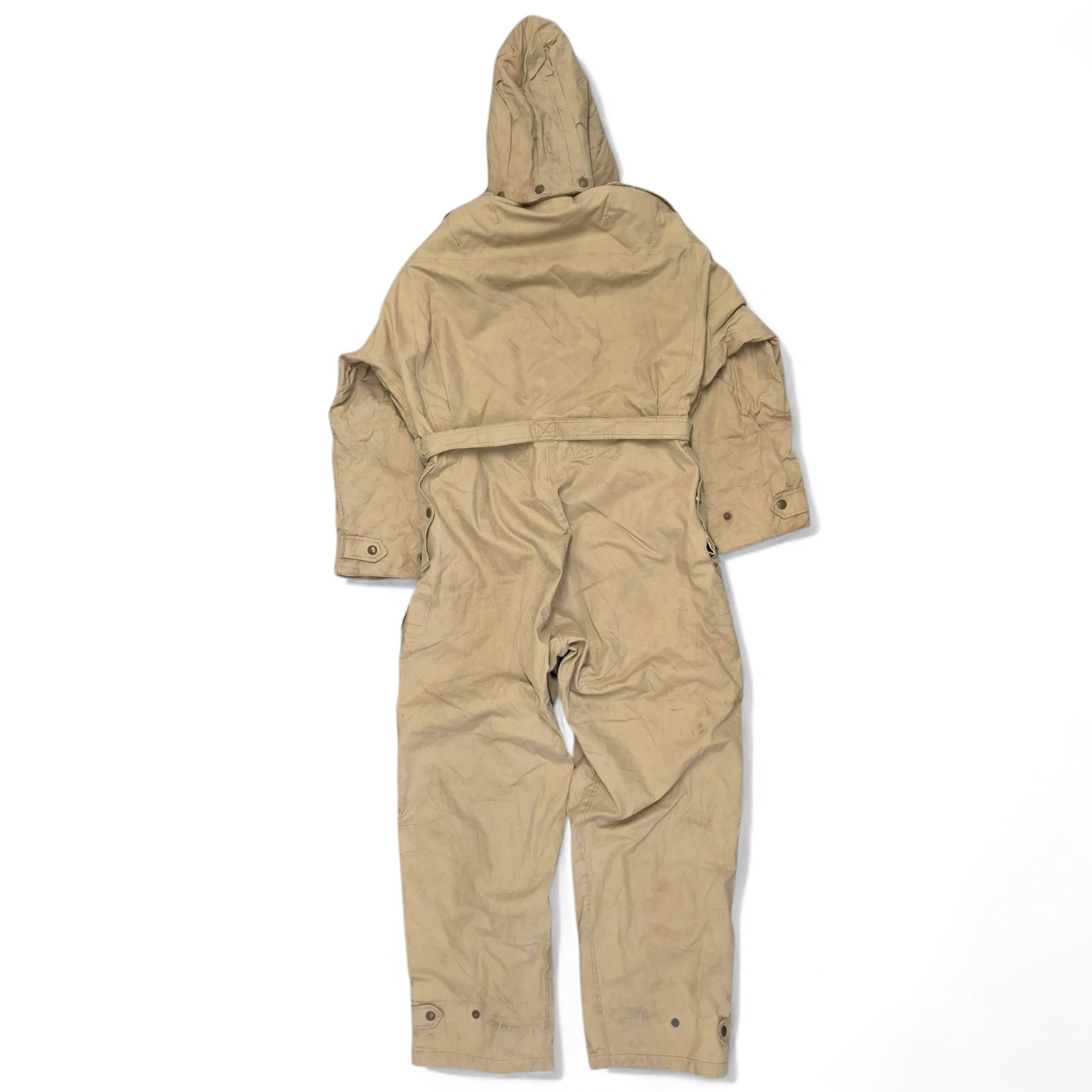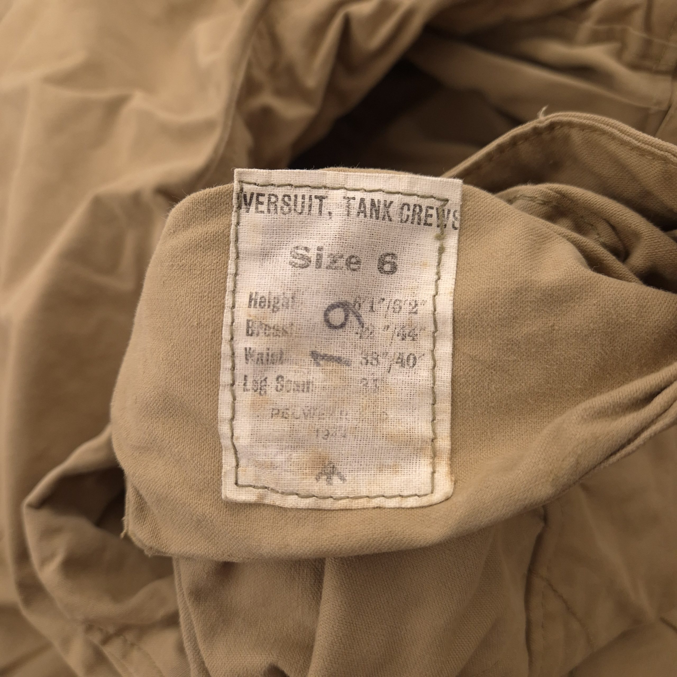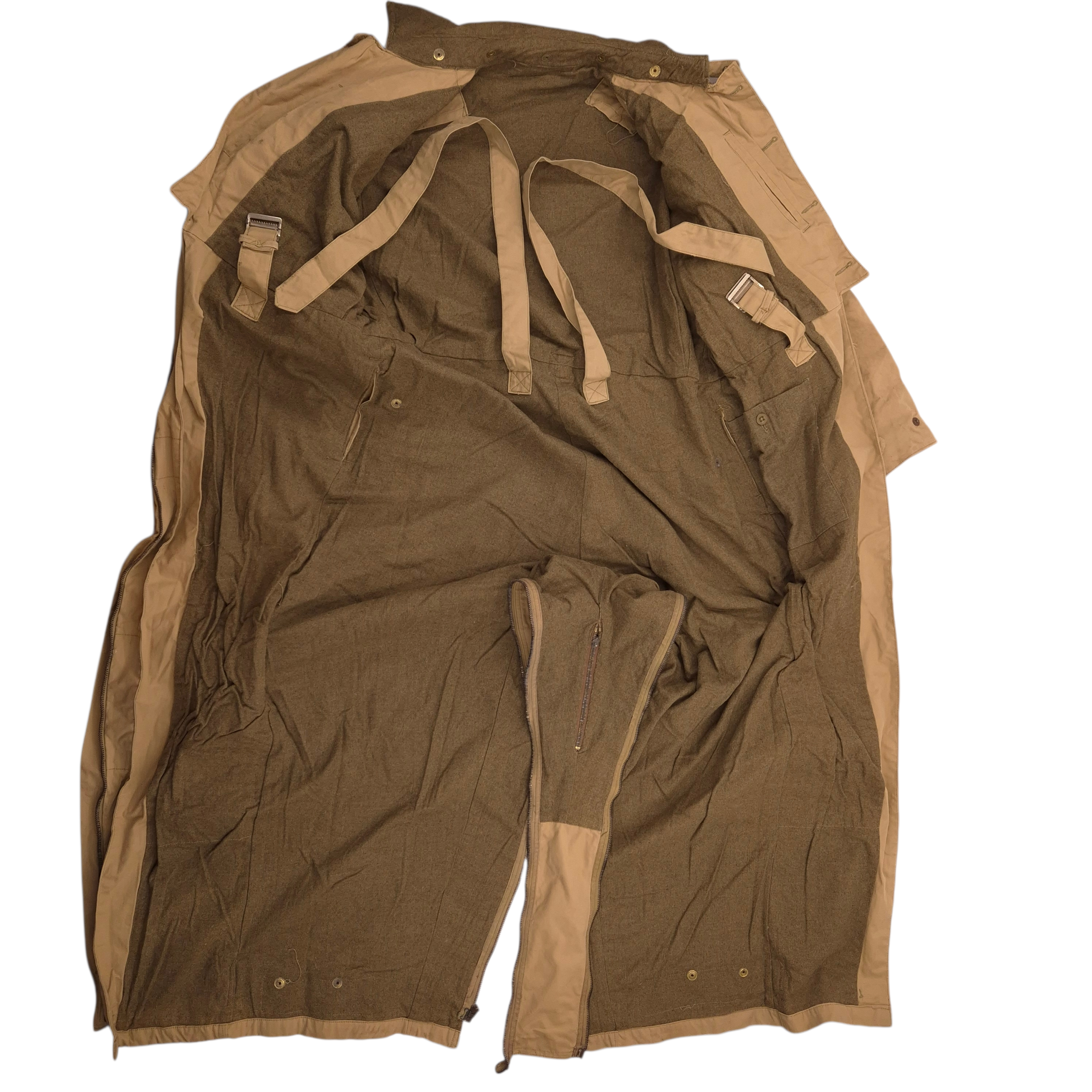 Original WWII British (Canadian) Tank Crew Oversuit with its hood. The khaki-colored oversuit, also known as the “Pixie Suit,” in very good and clean condition. Complete with all original functional zippers (may benefit from some lubrication) and Newey brass press-studs. Includes original inner braces and its original maker’s label, large size 6, dated 1944. Issued to British, Canadian, and Polish armoured troops. he hood retains its drawstring, two plastic buttons, and all press-studs. The suit has damage to the right rear.