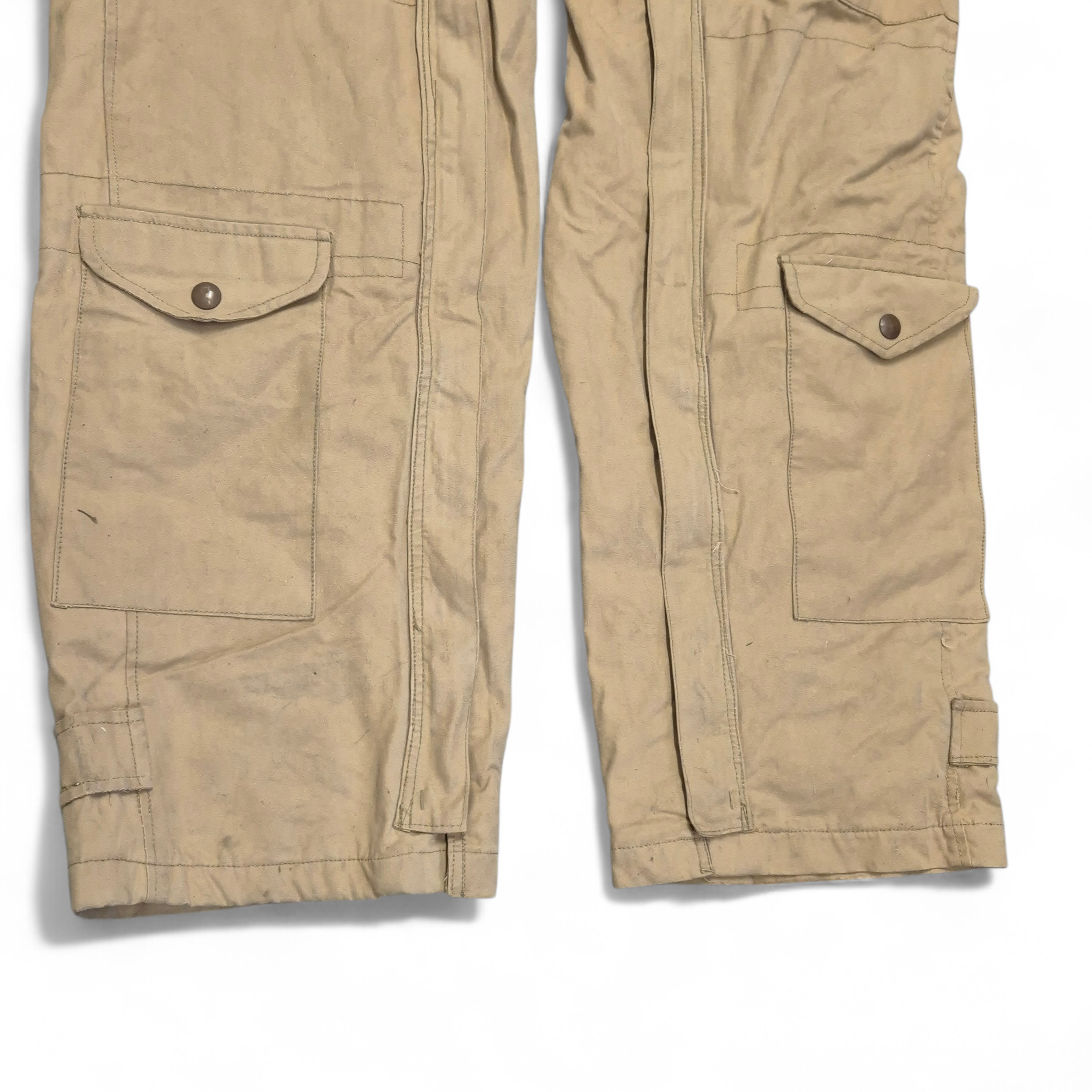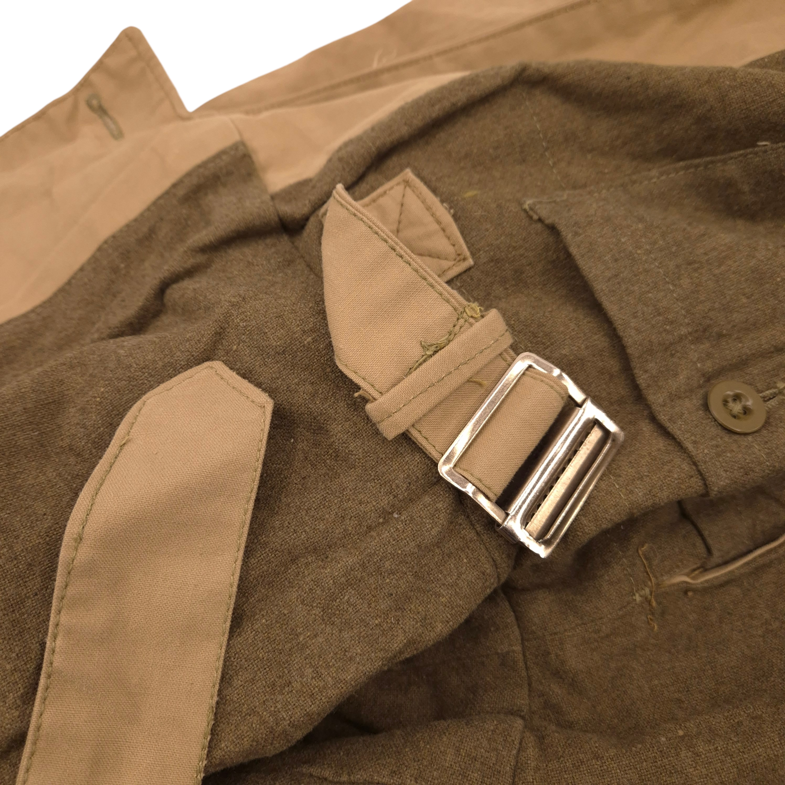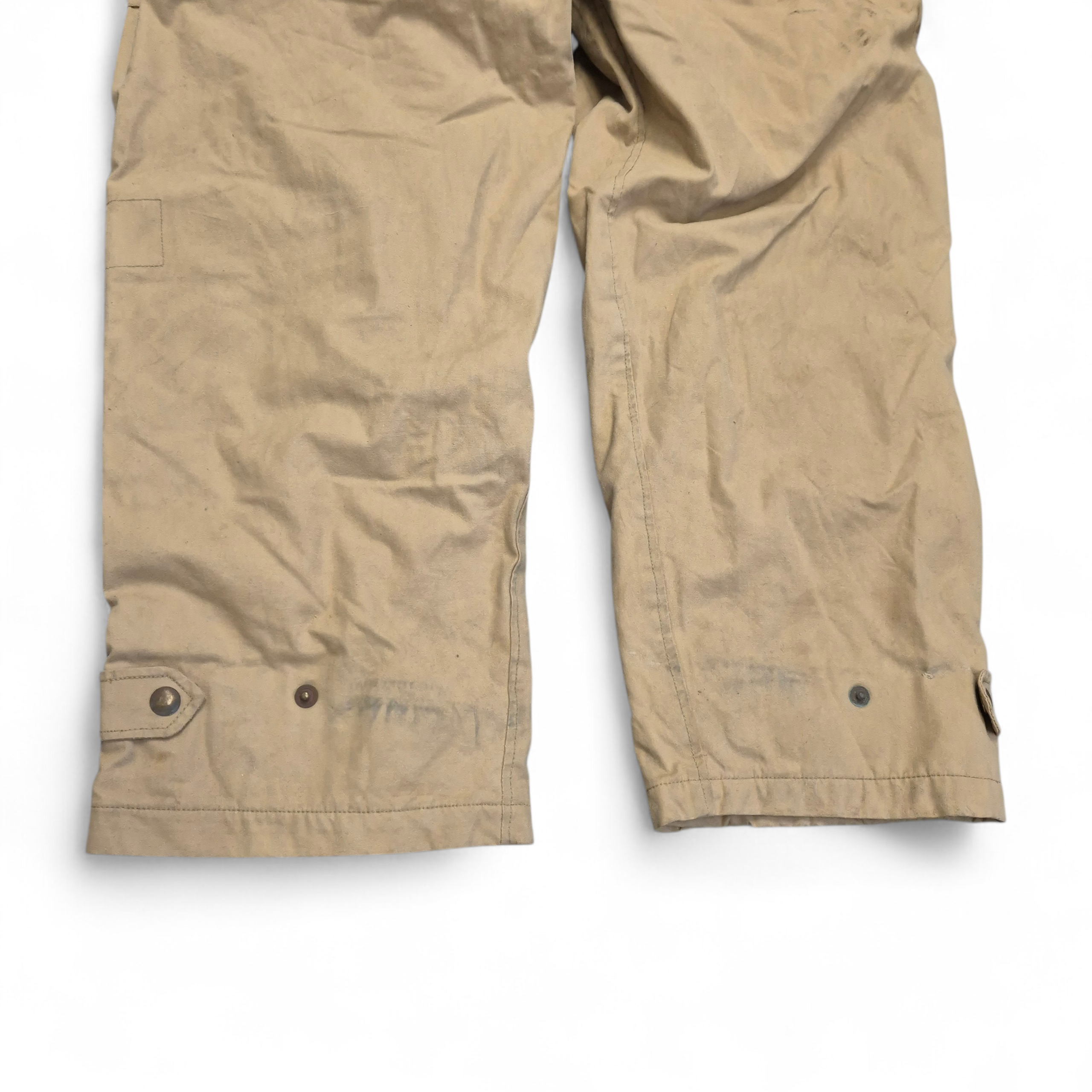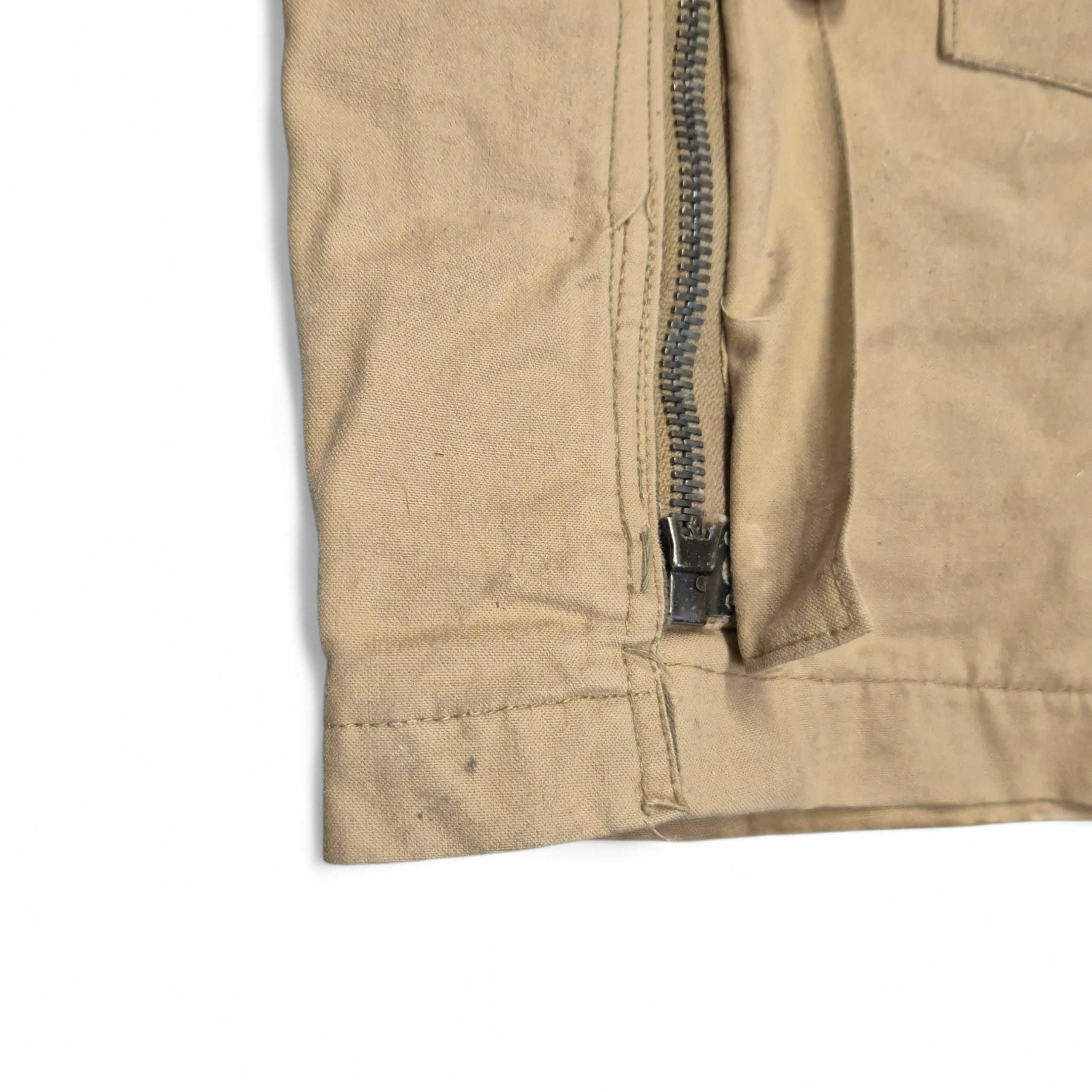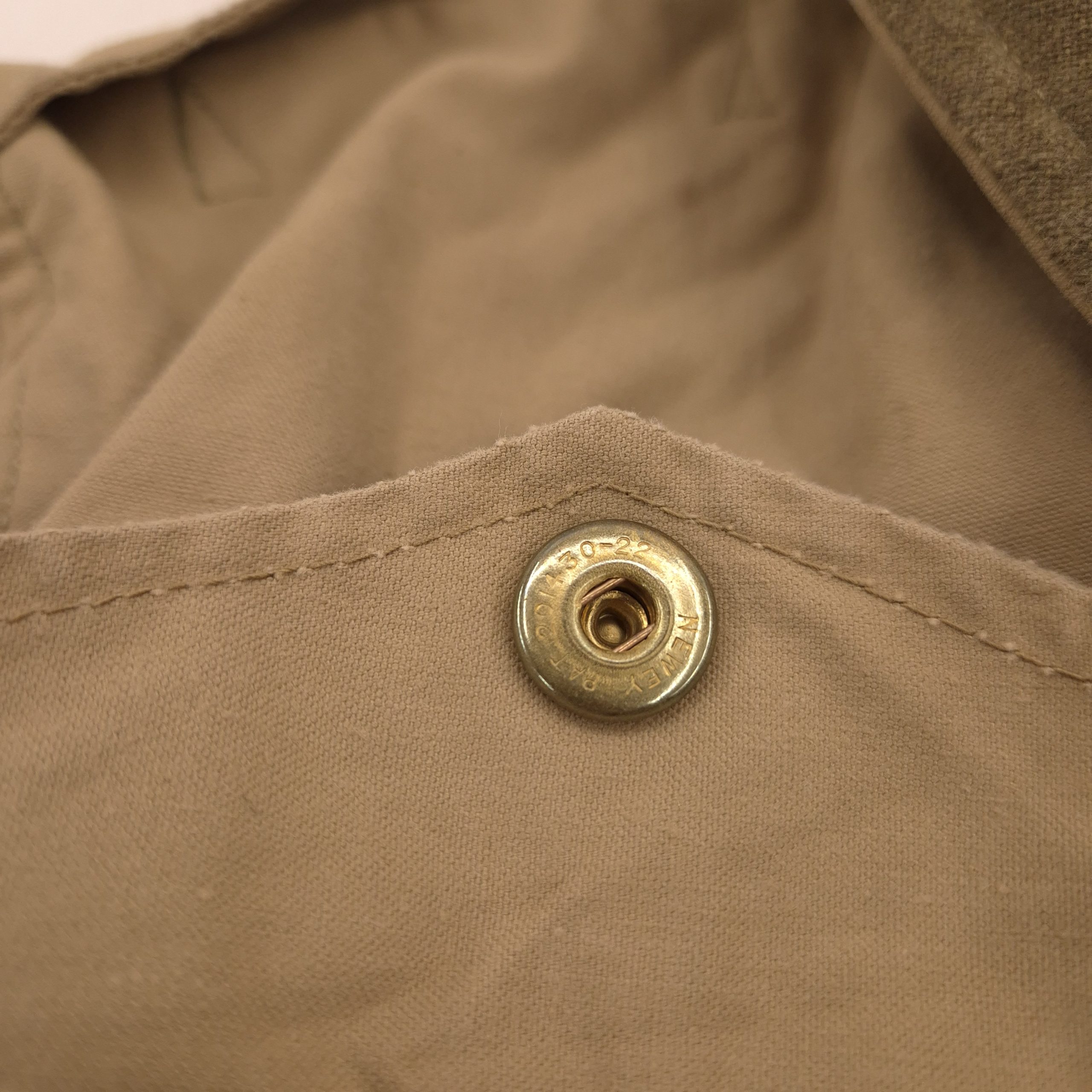 Original WWII British (Canadian) Tank Crew Oversuit with its hood. The khaki-colored oversuit, also known as the “Pixie Suit,” in very good and clean condition. Complete with all original functional zippers (may benefit from some lubrication) and Newey brass press-studs. Includes original inner braces and its original maker’s label, large size 6, dated 1944. Issued to British, Canadian, and Polish armoured troops. he hood retains its drawstring, two plastic buttons, and all press-studs. The suit has damage to the right rear.