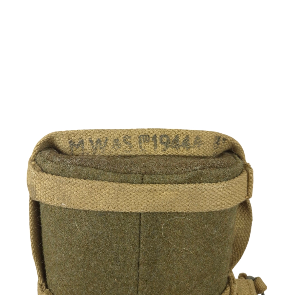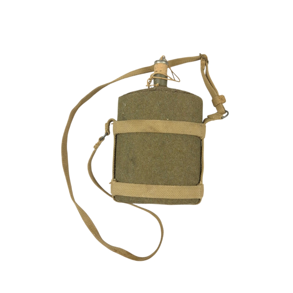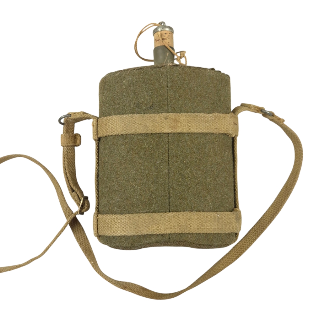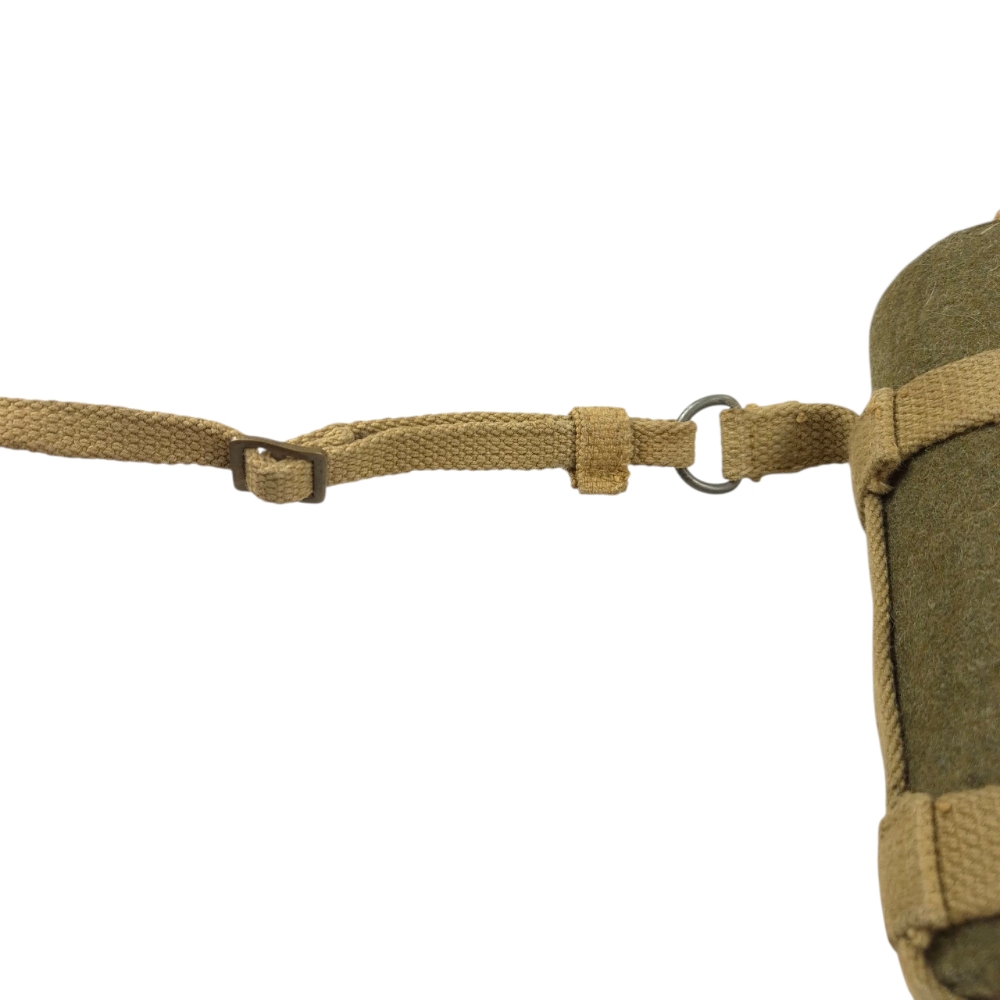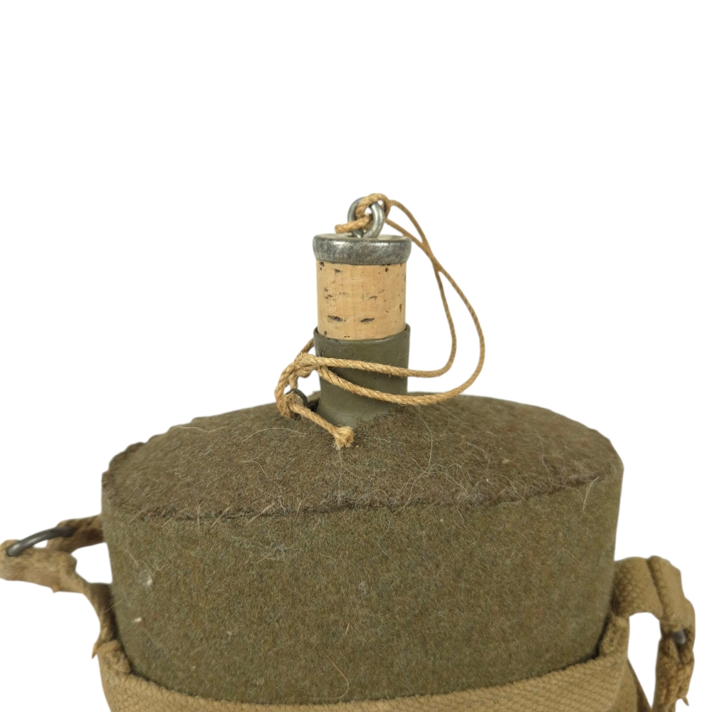 Original WWII British P37 water bottle with web carrier and sling. This bottle carrier is typical to medical orderlies. Maker marked MW&S Ltd, dated 1944. Complete with cork.
