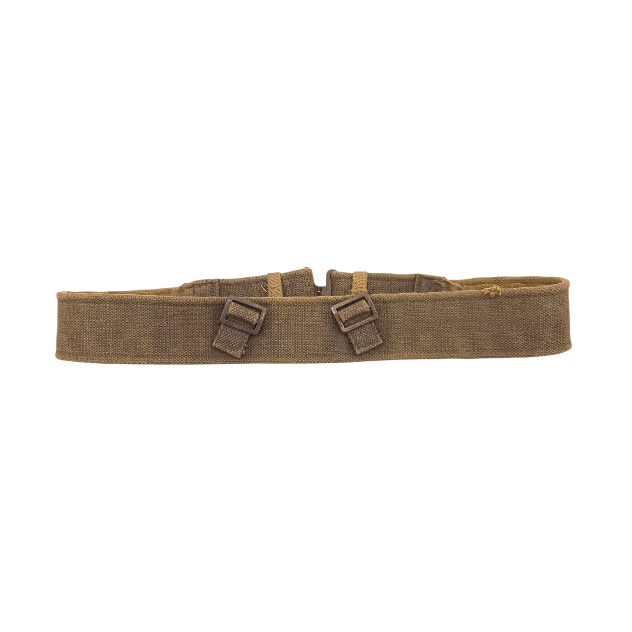 Original WWII British P37 Web Belt. This belt has been period-painted black, as was done for Rifle Regiments (e.g. King’s Royal Rifle Corps) and certain Armoured units. The belt remains in used, service-worn condition and is clearly maker marked Finnigans Ltd, dated 1945, size large, broad arrow stamped.