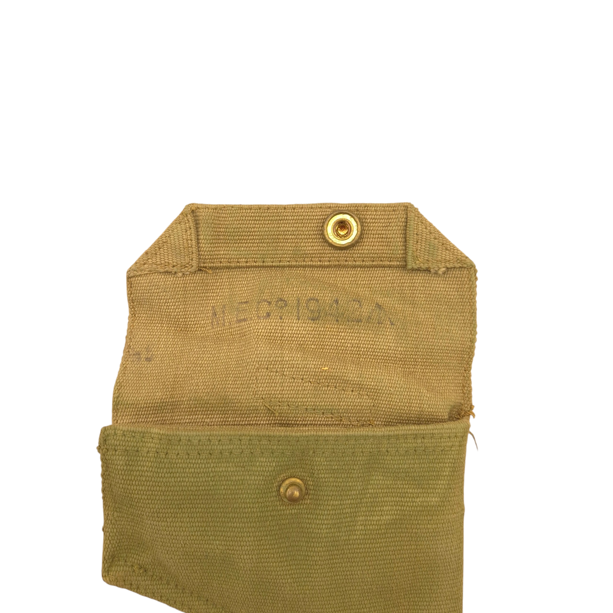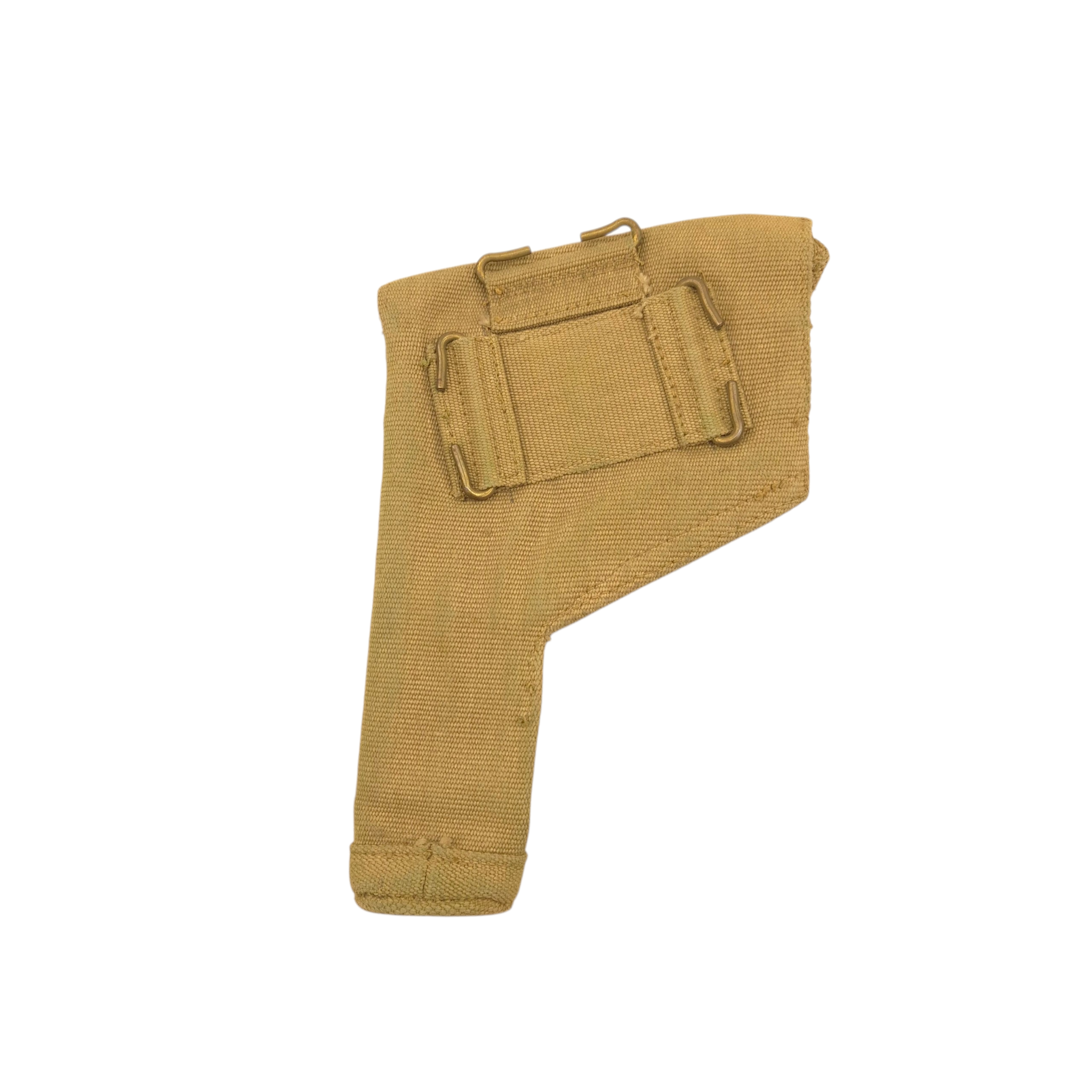 Original WWII British P37 web holster. Manufactured by ‘MECo’ and dated 1942, this holster was designed to carry a service pistol or revolver. The front of the holster is covered in Blanco.