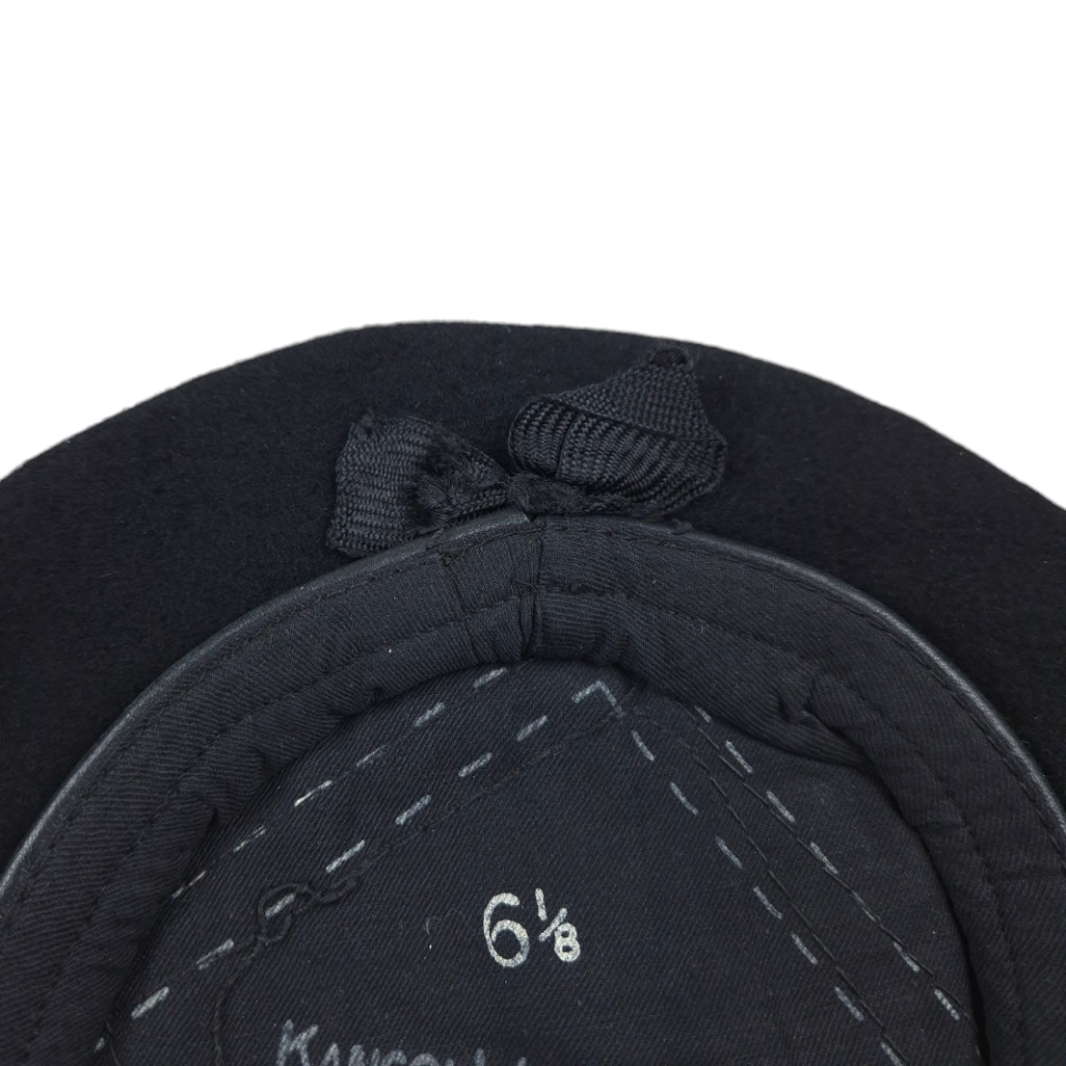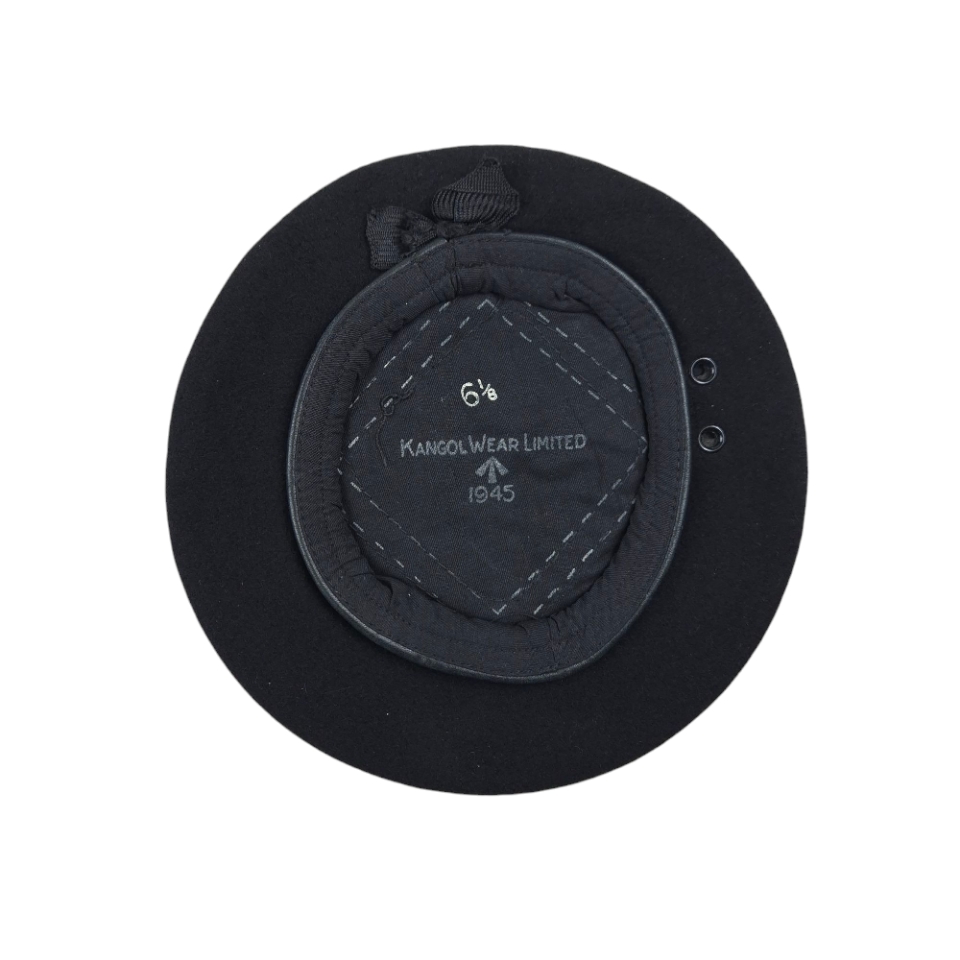 Original WWII British Royal Armoured Corps Black Beret. This genuine WWII-era British Royal Armoured Corps black beret is in excellent condition. It remains unworn and has never had holes for a cap badge, allowing you to choose and add your own. The wool and liner make it easy to punch through if needed. Maker-marked Kangol Wear Limited and dated 1945, it comes in a small size 6 1/8. The Canadian Armoured Corps was primarily issued British-made berets, making this an excellent addition to a Canadian militaria collection.