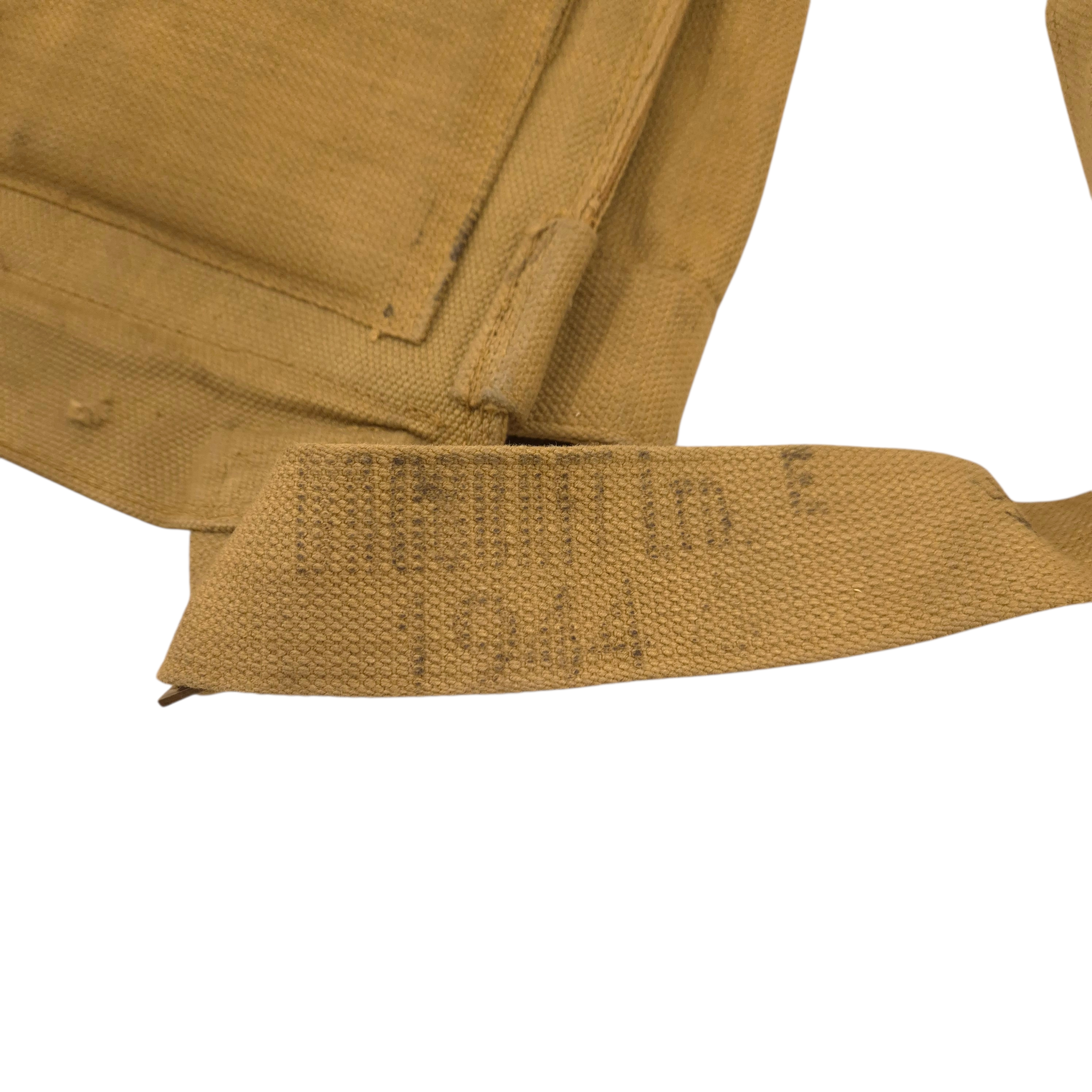 Original WWII British Ration Canister Carrier. This type of webbing pack was specifically designed to carry a single ration canister. Such packs were used mainly in situations when trucks weren’t able to reach the front line and provide food or establish a field kitchen. The carrier is in very good, unused condition, manufactured by Bagcraft Ltd and dated 1944. It is complete with its original carrying straps and front belt, making it an excellent example.
